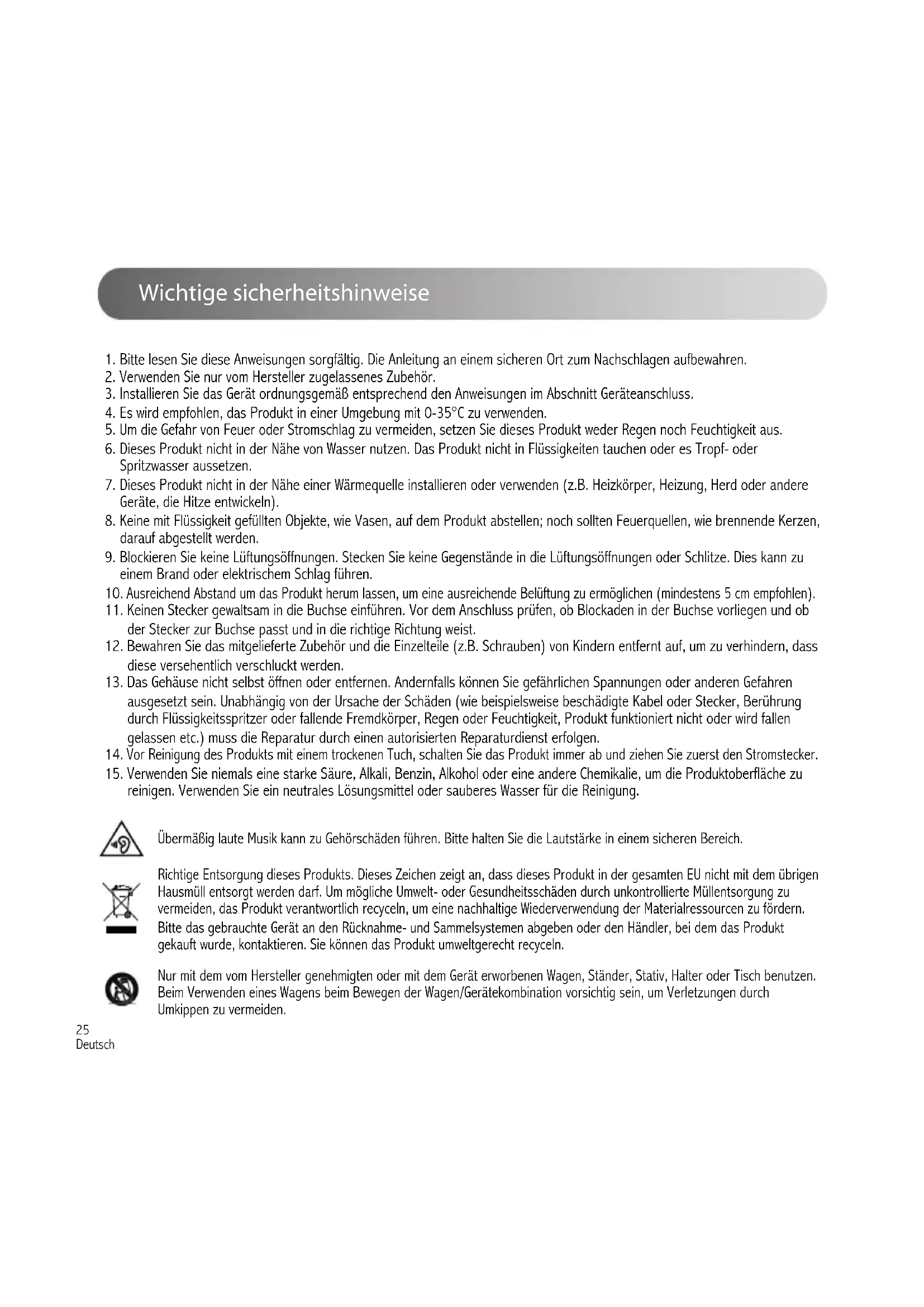 - Los altavoces EDIFIER generan el menor ruido posible, mientras que otros dispositivos de audio emiten demasiado ruido de fondo. Desconecte los cables de audio y suba el volumen, si no se oye ningún sonido a un metro de distancia del altavoz, el aparato funciona correctamente. Si quiere saber más sobre EDIFIER, visite www.edifier.com. Para consultas sobre la garantía EDIFIER, por favor, seleccione la página del país correspondiente en www.edifier.com y revise la sección Condiciones de la garantía. EE.UU. y Canadá: service@edifier.ca América del Sur: por favor, visite www.edifier.com (inglés) o www.edifierla.com (español/portugués) para obtener información de contacto local.25 Deutsch Wichtige sicherheitshinweise Übermäßig laute Musik kann zu Gehörschäden führen. Bitte halten Sie die Lautstärke in einem sicheren Bereich. Richtige Entsorgung dieses Produkts. Dieses Zeichen zeigt an, dass dieses Produkt in der gesamten EU nicht mit dem übrigen Hausmüll entsorgt werden darf. Um mögliche Umwelt- oder Gesundheitsschäden durch unkontrollierte Müllentsorgung zu vermeiden, das Produkt verantwortlich recyceln, um eine nachhaltige Wiederverwendung der Materialressourcen zu fördern. Bitte das gebrauchte Gerät an den Rücknahme- und Sammelsystemen abgeben oder den Händler, bei dem das Produkt gekauft wurde, kontaktieren. Sie können das Produkt umweltgerecht recyceln. Nur mit dem vom Hersteller genehmigten oder mit dem Gerät erworbenen Wagen, Ständer, Stativ, Halter oder Tisch benutzen. Beim Verwenden eines Wagens beim Bewegen der Wagen/Gerätekombination vorsichtig sein, um Verletzungen durch Umkippen zu vermeiden.