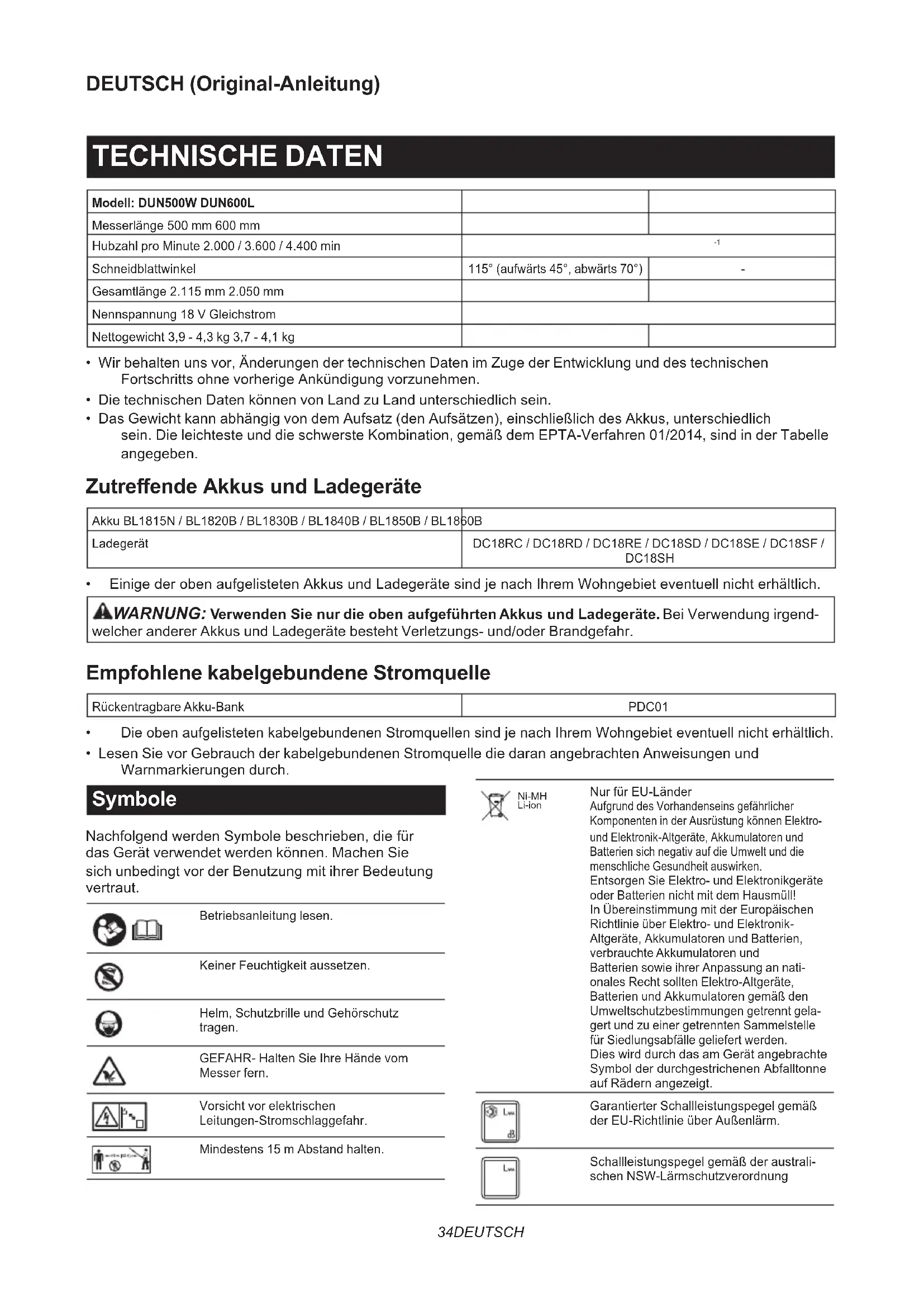 - Lesen Sie vor Gebrauch der kabelgebundenen Stromquelle die daran angebrachten Anweisungen und Warnmarkierungen durch. Symbole NachfolgendwerdenSymbolebeschrieben,diefür das Gerät verwendet werden können. Machen Sie sich unbedingt vor der Benutzung mit ihrer Bedeutung vertraut. Betriebsanleitung lesen. Keiner Feuchtigkeit aussetzen. Helm, Schutzbrille und Gehörschutz tragen. GEFAHR- Halten Sie Ihre Hände vom Messer fern. Vorsicht vor elektrischen Leitungen-Stromschlaggefahr. Mindestens 15 m Abstand halten. Ni-MH Li-ion Nur für EU-Länder Aufgrund des Vorhandenseins gefährlicher Komponenten in der Ausrüstung können Elektro- und Elektronik-Altgeräte, Akkumulatoren und Batterien sich negativ auf die Umwelt und die menschliche Gesundheit auswirken. Entsorgen Sie Elektro- und Elektronikgeräte oder Batterien nicht mit dem Hausmüll! In Übereinstimmung mit der Europäischen Richtlinie über Elektro- und Elektronik- Altgeräte, Akkumulatoren und Batterien, verbrauchte Akkumulatoren und Batterien sowie ihrer Anpassung an nati- onales Recht sollten Elektro-Altgeräte, Batterien und Akkumulatoren gemäß den Umweltschutzbestimmungen getrennt gela- gert und zu einer getrennten Sammelstelle für Siedlungsabfälle geliefert werden. Dies wird durch das am Gerät angebrachte SymbolderdurchgestrichenenAbfalltonne auf Rädern angezeigt. Garantierter Schallleistungspegel gemäß der EU-Richtlinie über Außenlärm. Schallleistungspegel gemäß der australi- schen NSW-Lärmschutzverordnung35 DEUTSCH Vorgesehene Verwendung Das Werkzeug ist zum Trimmen von Hecken vorgesehen. Geräusch TypischerA-bewerteterGeräuschpegelermitteltgemäß EN62841-4-2: Modell DUN500W Schalldruckpegel (L