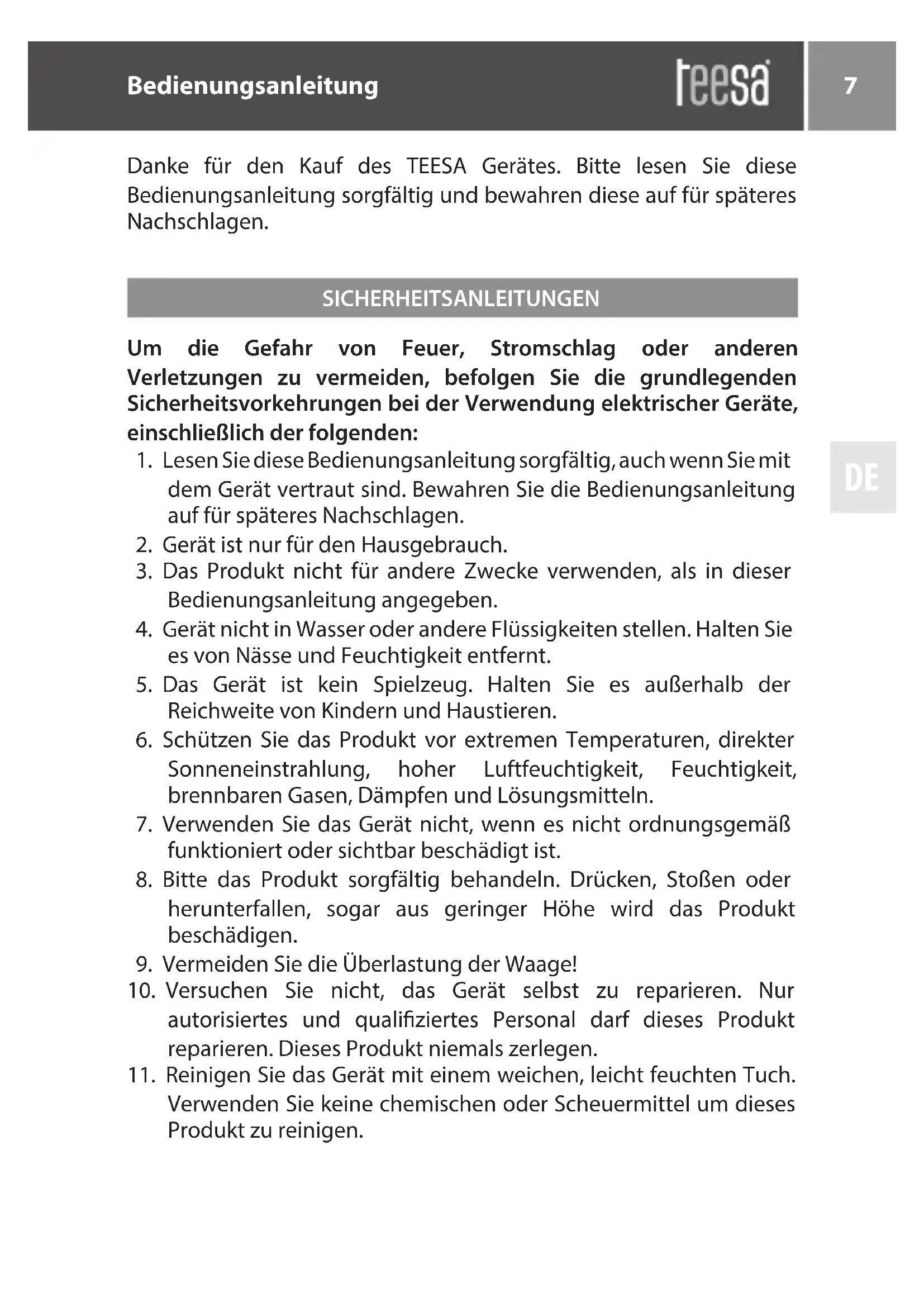 SICHERHEITSANLEITUNGEN Danke für den Kauf des TEESA Gerätes. Bitte lesen Sie diese Bedienungsanleitung sorgfältig und bewahren diese auf für späteres Nachschlagen. Um die Gefahr von Feuer, Stromschlag oder anderen Verletzungen zu vermeiden, befolgen Sie die grundlegenden Sicherheitsvorkehrungen bei der Verwendung elektrischer Geräte, einschließlich der folgenden: