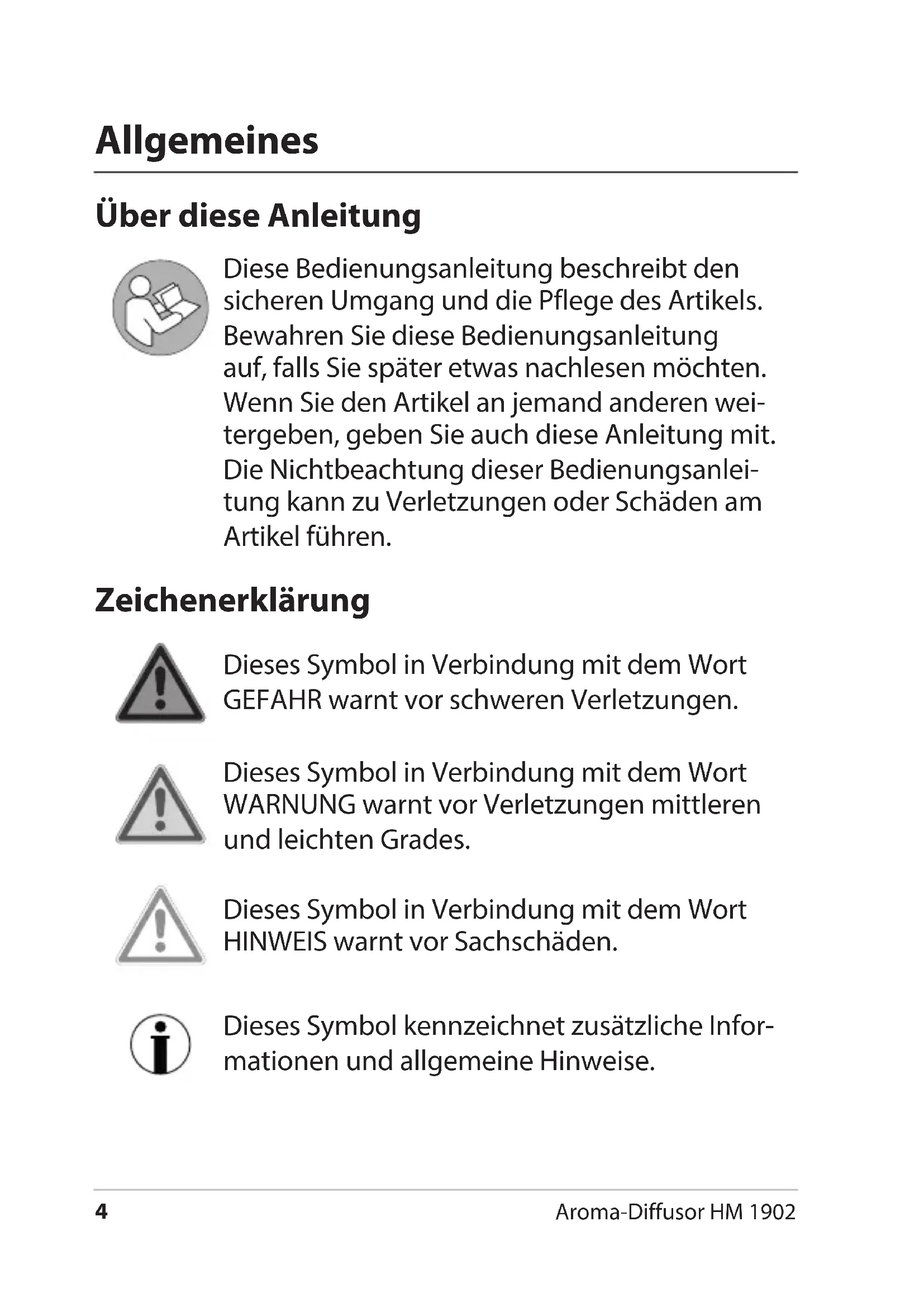 - Entsorgen Aroma-Diffusor HM 1902 Allgemeines Über diese Anleitung Diese Bedienungsanleitung beschreibt den sicheren Umgang und die Pflege des Artikels. Bewahren Sie diese Bedienungsanleitung auf, falls Sie später etwas nachlesen möchten. Wenn Sie den Artikel an jemand anderen wei- tergeben, geben Sie auch diese Anleitung mit. Die Nichtbeachtung dieser Bedienungsanlei- tung kann zu Verletzungen oder Schäden am Artikel führen. Zeichenerklärung Dieses Symbol in Verbindung mit dem Wort GEFAHR warnt vor schweren Verletzungen. Dieses Symbol in Verbindung mit dem Wort WARNUNG warnt vor Verletzungen mittleren und leichten Grades. Dieses Symbol in Verbindung mit dem Wort HINWEIS warnt vor Sachschäden. Dieses Symbol kennzeichnet zusätzliche Infor- mationen und allgemeine Hinweise.5 Aroma-Diffusor HM 1902 Deutsch Bestimmungsgemäßer Gebrauch Dieser Diusor dient zur Verbesserung der Luftquali- tät, indem er durch das Vernebeln von Wasser die Luftfeuchtigkeit erhöht. Das Gerät arbeitet mit Ultra- schall-Technologie und erzeugt Kaltnebel. Er ist ausschließlich für den Privatgebrauch in trocke- nen Innenräumen konzipiert. Der Luftbefeuchter darf nicht als Inhalator verwendet werden. Sicherheit Dieser Artikel kann von Kindern ab 8 Jah- ren und darüber sowie von Personen mit verringerten physischen, sensorischen oder mentalen Fähigkeiten oder Mangel an Erfahrung und Wissen benutzt werden, wenn sie beaufsichtigt oder bezüglich des sicheren Gebrauchs des Artikels unterwie- sen wurden und die daraus resultierenden Gefahren verstehen. Gerät und Netzadapter sind von Kindern jünger als 8 Jahren fernzuhalten. Reinigung und Benutzerwartung dürfen nicht von Kindern vorgenommen werden, es sei denn, sie sind 8 Jahre oder älter und werden beaufsichtigt.6 Aroma-Diffusor HM 1902 Kinder dürfen nicht mit dem Gerät spielen. Halten Sie Folien und Verpackungsmaterial von Kindern fern. Es besteht Erstickungs- gefahr. Achten Sie auch darauf, dass der Verpackungsbeutel nicht über den Kopf gestülpt wird. Verwenden Sie nur den mitgelieferten Netzadapter und ersetzen Sie ihn nur durch den gleichen Typ. Der Netzadapter darf nur in trockenen Innenräumen verwendet wer- den und muss vor Feuchtigkeit geschützt werden. GEFAHR durch Elektrizität Der Wassertank des Gerätes wird mit Wasser gefüllt. Das Gerät selbst sowie Netzadapterkabel und Netz- adapterstecker dürfen jedoch nicht mit Flüssigkeiten in Berührung kommen oder in Wasser oder andere Flüssigkeiten getaucht werden. Stromschlaggefahr! Stellen Sie das Gerät für Kinder unerreichbar auf und betreiben Sie es nicht unbeaufsichtigt. Betreiben Sie das Gerät nicht im Freien. Schließen Sie das Gerät an eine ordnungsgemäß ins- tallierte Steckdose an, deren Spannung den „Techni- schen Daten“ entspricht. Achten Sie darauf, dass die Steckdose gut zugänglich ist, damit Sie im Bedarfsfall schnell den Netzadapter-7 Aroma-Diffusor HM 1902 Deutsch stecker ziehen können. Benutzen Sie das Gerät nicht: − wenn das Gerät selbst oder Teile beschädigt sind, − wenn Netzadapterkabel oder Netzadapterstecker beschädigt sind, − wenn das Gerät heruntergefallen ist. Wickeln Sie das Netzadapterkabel vor jedem Gebrauch vollständig ab. Achten Sie dabei darauf, dass das Netzadapterkabel nicht durch scharfe Kanten oder heiße Gegenstände beschädigt wird. Ziehen Sie den Netzadapterstecker aus der Steckdose: − wenn Sie das Gerät nicht benutzen, − bevor Sie Wasser einfüllen oder ausschütten − bevor Sie das Gerät reinigen oder wegstellen, − wenn während des Betriebs oensichtlich eine Störung auftritt, − bei Gewitter. − Ziehen Sie dabei immer am Netzadapterstecker, nicht am Kabel. Nehmen Sie keine Veränderungen an dem Gerät oder am Netzkabel vor. Lassen Sie Reparaturen nur von einer Fachwerkstatt durchführen, da nicht fachgerecht reparierte Geräte den Benutzer gefährden. VORSICHT - Sachschäden Schützen Sie den Luftbefeuchter vor starken Stößen, Erschütterungen, direkter Sonneneinstrahlung sowie Schmutz und starker Feuchtigkeit.8 Aroma-Diffusor HM 1902 Stellen Sie den Luftbefeuchter nicht auf heiße Ober- ächen und in die unmittelbare Nähe von elektrischen Geräten und empndlichen Gegenständen. Füllen Sie möglichst destilliertes Wasser in den Tank ein, um dem Kalk im normalen Leitungswasser vor- zubeugen. Sie können jedoch auch frisches, kaltes Trinkwasser in den Tank geben. Beachten Sie die Herstellerangaben, wenn Sie Aro- ma-Essenzen zusetzen möchten. Verwenden Sie aus- schließlich wasserlösliche Aromen. Durch den Betrieb kann es im Bereich des Diusors zu Niederschlägen bzw. Ablagerungen kommen. Legen Sie ggf. eine geeignete Unterlage unter das Gerät und halten Sie Abstand zu elektrischen oder empndli- chen Geräten und Teilen. Stellen Sie den Diusor nicht direkt unter ein Regal oder einen Hängeschrank. Gesunde Luft sollte eine relative Luftfeuchtigkeit von 40 bis 60 % haben. Bei häugem Gebrauch nimmt die Luftfeuchtikgeit zu und die Gefahr von Schimmelbil- dung erhöht sicht. Verwenden Sie nur Original-Zubehör. Betreiben Sie das Gerät nicht, wenn im Tank keine oder nur noch sehr wenig Flüssigkeit ist. Decken Sie das Gerät nicht ab und betreiben Sie es unter einer Decke oder einem Kissen. Halten Sie die Belüftungsschlitze des Lufteinlasses auf der Geräte-Unterseite frei von Staub und Schmutz. Stellen Sie das Gerät auch nicht auf einen weichen Teppich. Der Lufteinlass muss immer frei sein.9 Aroma-Diffusor HM 1902 Deutsch An der Unterseite des Diusors benden sich Gerä- tefüße. Da Oberächen aus den verschiedensten Materialien bestehen und mit den unterschiedlichsten Pegemitteln behandelt werden, kann es nicht völlig ausgeschlossen werden, dass manche dieser Stoe Bestandteile enthalten, die die Gerätefüße angreifen und aufweichen. Legen Sie ggf. eine rutschfeste Unter- lage unter das Gerät. Verwenden Sie zum Reinigen keine aggressiven chemischen Reinigungsmittel, Scheuermittel, harte Schwämme o. ä. Fr