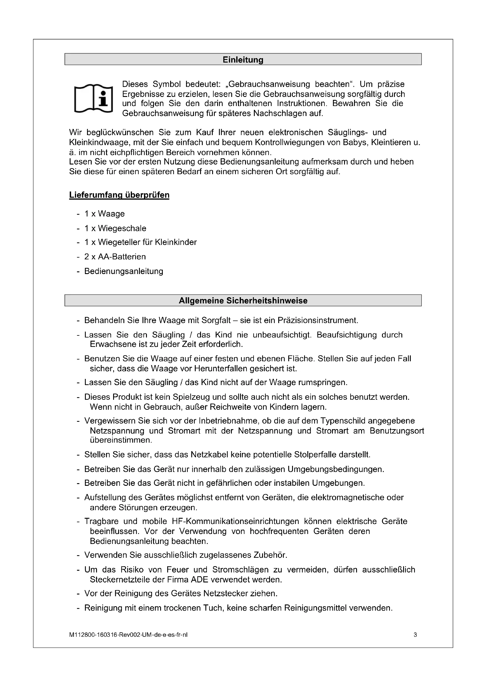 Dieses Symbol bedeutet: „Gebrauchsanweisung beachten“. Um präzise Ergebnisse zu erzielen, lesen Sie die Gebrauchsanweisung sorgfältig durch und folgen Sie den darin enthaltenen Instruktionen. Bewahren Sie die Gebrauchsanweisung für späteres Nachschlagen auf. Wir beglückwünschen Sie zum Kauf Ihrer neuen elektronischen Säuglings- und Kleinkindwaage, mit der Sie einfach und bequem Kontrollwiegungen von Babys, Kleintieren u. ä. im nicht eichpflichtigen Bereich vornehmen können. Lesen Sie vor der ersten Nutzung diese Bedienungsanleitung aufmerksam durch und heben Sie diese für einen späteren Bedarf an einem sicheren Ort sorgfältig auf. Lieferumfang überprüfen - 1 x Waage - 1 x Wiegeschale - 1 x Wiegeteller für Kleinkinder - 2 x AA-Batterien - Bedienungsanleitung Allgemeine Sicherheitshinweise - Behandeln Sie Ihre Waage mit Sorgfalt – sie ist ein Präzisionsinstrument. - Lassen Sie den Säugling / das Kind nie unbeaufsichtigt. Beaufsichtigung durch Erwachsene ist zu jeder Zeit erforderlich. - Benutzen Sie die Waage auf einer festen und ebenen Fläche. Stellen Sie auf jeden Fall sicher, dass die Waage vor Herunterfallen gesichert ist. - Lassen Sie den Säugling / das Kind nicht auf der Waage rumspringen. - Dieses Produkt ist kein Spielzeug und sollte auch nicht als ein solches benutzt werden. Wenn nicht in Gebrauch, außer Reichweite von Kindern lagern. - Vergewissern Sie sich vor der Inbetriebnahme, ob die auf dem Typenschild angegebene Netzspannung und Stromart mit der Netzspannung und Stromart am Benutzungsort übereinstimmen. - Stellen Sie sicher, dass das Netzkabel keine potentielle Stolperfalle darstellt. - Betreiben Sie das Gerät nur innerhalb den zulässigen Umgebungsbedingungen. - Betreiben Sie das Gerät nicht in gefährlichen oder instabilen Umgebungen. - Aufstellung des Gerätes möglichst entfernt von Geräten, die elektromagnetische oder andere Störungen erzeugen. - Tragbare und mobile HF-Kommunikationseinrichtungen können elektrische Geräte beeinflussen. Vor der Verwendung von hochfrequenten Geräten deren Bedienungsanleitung beachten. - Verwenden Sie ausschließlich zugelassenes Zubehör. - Um das Risiko von Feuer und Stromschlägen zu vermeiden, dürfen ausschließlich Steckernetzteile der Firma ADE verwendet werden. - Vor der Reinigung des Gerätes Netzstecker ziehen. - Reinigung mit einem trockenen Tuch, keine scharfen Reinigungsmittel verwenden.4