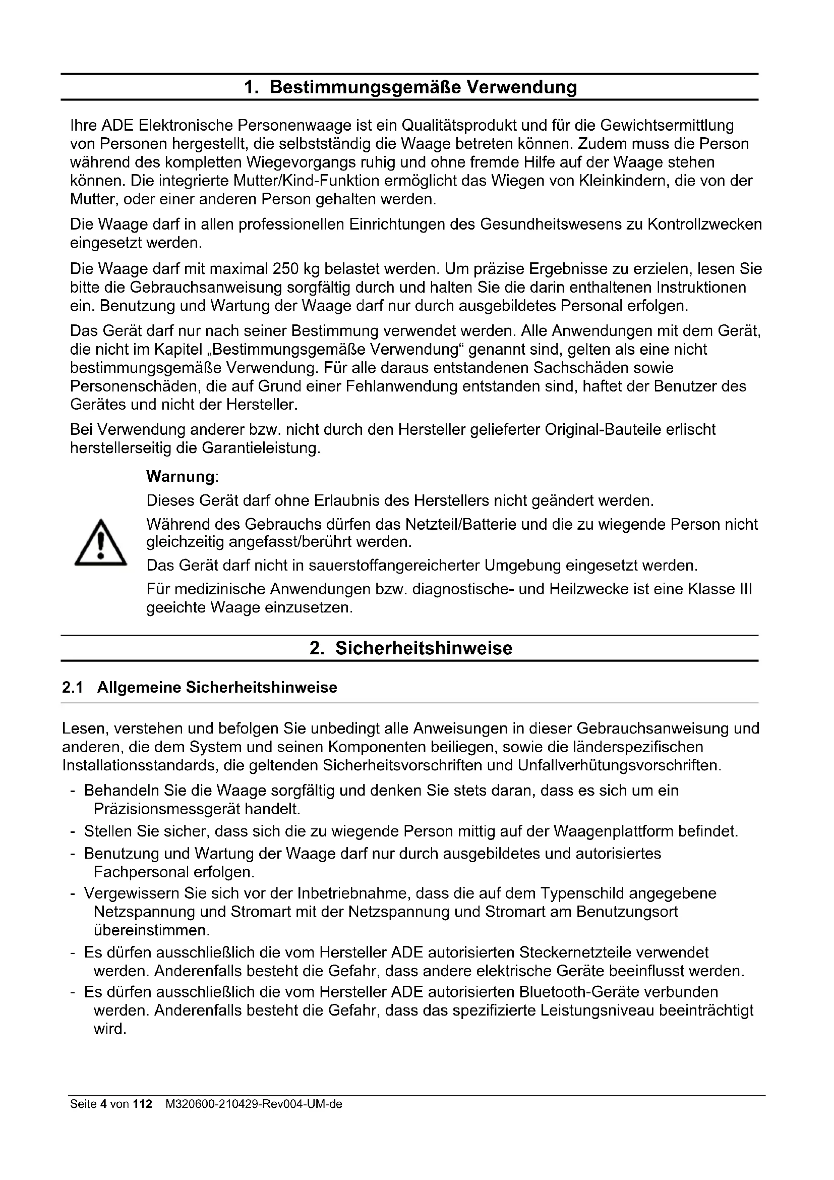 Lesen, verstehen und befolgen Sie unbedingt alle Anweisungen in dieser Gebrauchsanweisung und anderen, die dem System und seinen Komponenten beiliegen, sowie die länderspezifischen Installationsstandards, die geltenden Sicherheitsvorschriften und Unfallverhütungsvorschriften. - Behandeln Sie die Waage sorgfältig und denken Sie stets daran, dass es sich um ein Präzisionsmessgerät handelt. - Stellen Sie sicher, dass sich die zu wiegende Person mittig auf der Waagenplattform befindet. - Benutzung und Wartung der Waage darf nur durch ausgebildetes und autorisiertes Fachpersonal erfolgen. - Vergewissern Sie sich vor der Inbetriebnahme, dass die auf dem Typenschild angegebene Netzspannung und Stromart mit der Netzspannung und Stromart am Benutzungsort übereinstimmen. - Es dürfen ausschließlich die vom Hersteller ADE autorisierten Steckernetzteile verwendet werden. Anderenfalls besteht die Gefahr, dass andere elektrische Geräte beeinflusst werden. - Es dürfen ausschließlich die vom Hersteller ADE autorisierten Bluetooth-Geräte verbunden werden. Anderenfalls besteht die Gefahr, dass das spezifizierte Leistungsniveau beeinträchtigt wird.M320600-210429-Rev004-UM-de Seite 5 von 112 - Jeder, der zusätzliche Geräte oder Stromversorgungen (außer den in Kapitel 9 erwähnten) an das Gerät anschließt ist dafür verantwortlich, dass das System die Anforderungen der Norm IEC 60601-1 erfüllt. - Der Stecker/Adapterstecker isoliert das Gerät vom Stromnetz. Stellen Sie das Gerät nicht in einer Position auf, in der es schwierig ist, die Verbindung zum Stromnetz zu trennen, um den Betrieb des Geräts sicher zu beenden. - Verlegen Sie das Anschlusskabel zwischen Waage und Netzanschluss so, dass es nicht zur Stolperfalle werden kann. - Verlegen Sie das Anschlusskabel zwischen Waage und Netzanschluss so, dass von ihm keine Gefahr durch Strangulation ausgehen kann. - Waage niemals auf der Stellfläche hin- und herschieben, da dies zur Beschädigung der Wägezellen führen kann. - Betreiben Sie das Gerät nur innerhalb der zulässigen Umgebungsbedingungen. - Setzen Sie die Waage keinen hohen Temperaturen aus, sei es durch nebenstehende Geräte oder durch Sonneneinstrahlung. Die Flüssigkristall-Anzeige könnte darunter leiden. - Verwenden Sie die Waage bei gleichbleibenden Umgebungstemperaturen und vermeiden Sie den Einsatz in Zugluft, da sonst die Messergebnisse verfälscht werden könnten. - Nach der Lagerung unter extremen Bedingungen sind mindestens 30 Minuten erforderlich, bis sich die Waage akklimatisiert hat und für den bestimmungsgemäßen Gebrauch bereit ist. - Stellen Sie die Waage möglichst entfernt von anderen Geräten oder Quellen auf, die elektromagnetische oder andere Störungen erzeugen, da diese die Messergebnisse verfälschen können. - Verwenden Sie ausschließlich zugelassenes Zubehör und Peripheriegeräte. - Ziehen Sie vor der Reinigung des Gerätes das Netzteil aus der Steckdose. - Tauchen Sie das Gerät nicht in Wasser oder andere Flüssigkeiten. - Wird die Waage über einen längeren Zeitraum nicht genutzt, sollte sie gereinigt und in einer Schutzfolie gelagert werden. Die Zugabe eines Trockenmittels ist wünschenswert. - Entfernen Sie die Batterien, wenn Sie die Waage über einen längeren Zeitraum nicht nutzen. - Wenn Sie Probleme mit diesem Gerät haben, z.B. bei der Einrichtung, Wartung oder Verwendung, wenden Sie sich bitte an den autorisierten Kundendienst. Öffnen oder reparieren Sie das Gerät nicht selbst. - Bitte benachrichtigen Sie den autorisierten Kundendienst, wenn unerwartete Operationen oder Ereignisse auftreten. Benutzen Sie die Waage NICHT: - wenn das Netzteil beschädigt ist; - wenn das Netzteil nicht funktioniert; - wenn sich das Batteriefach unnatürlich wölbt; - nach langer Einlagerung in feuchter Umgebung. Wenden Sie sich in diesen Fällen an den autorisierten Kundendienst.Seite 6 von 112 M320600-210429-Rev004-UM-de
