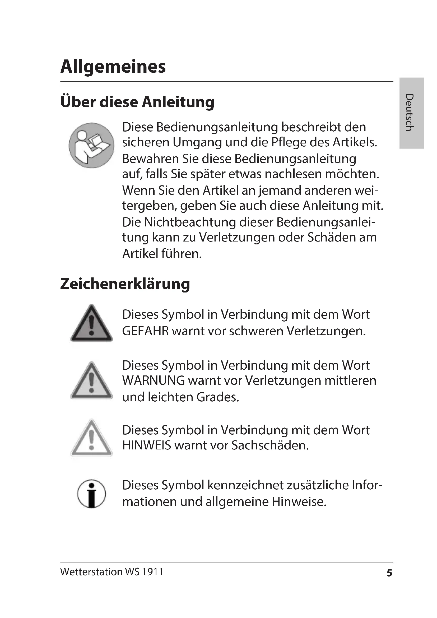 - Entsorgen Wetterstation WS 1911 Deutsch Allgemeines Über diese Anleitung Diese Bedienungsanleitung beschreibt den sicheren Umgang und die Pflege des Artikels. Bewahren Sie diese Bedienungsanleitung auf, falls Sie später etwas nachlesen möchten. Wenn Sie den Artikel an jemand anderen wei- tergeben, geben Sie auch diese Anleitung mit. Die Nichtbeachtung dieser Bedienungsanlei- tung kann zu Verletzungen oder Schäden am Artikel führen. Zeichenerklärung Dieses Symbol in Verbindung mit dem Wort GEFAHR warnt vor schweren Verletzungen. Dieses Symbol in Verbindung mit dem Wort WARNUNG warnt vor Verletzungen mittleren und leichten Grades. Dieses Symbol in Verbindung mit dem Wort HINWEIS warnt vor Sachschäden. Dieses Symbol kennzeichnet zusätzliche Infor- mationen und allgemeine Hinweise.6 Wetterstation WS 1911 Bestimmungsgemäßer Gebrauch Die Wetterstation - bestehend aus Basisstation und Funk-Außensensor - zeigt unterschiedliche Wetter- daten aus der näheren Umgebung an. Aus den gemes- senen Wetterdaten ermittelt die Wetterstation eine Wettervorhersage. Die Wetterstation zeigt außerdem Datum und Uhrzeit an und verfügt zusätzlich über eine Weckfunktion. Für die gewerbliche Nutzung in der Wettervorhersage oder in der Wetterdaten-Messung ist die Wetterstation ungeeignet. Sicherheit Dieses Gerät kann von Kindern ab 8 Jah- ren und darüber sowie von Personen mit verringerten physischen, sensorischen oder mentalen Fähigkeiten oder Mangel an Erfahrung und/oder Wissen benutzt werden, wenn sie beaufsichtigt werden oder bezüglich des sicheren Gebrauchs des Gerätes unterwiesen wurden und die daraus resultierenden Gefahren verstanden haben. Das Gerät und der Netzadapter sind von Kindern jünger als 8 Jahren fernzuhalten. Reinigung und Wartung durch den Benut-7 Wetterstation WS 1911 Deutsch zer dürfen nicht durch Kinder vorgenom- men werden, es sei denn, sie sind 8 Jahre oder älter und werden beaufsichtigt. Batterien können lebensgefährlich sein. Bewahren Sie deshalb die Batterie für Klein- kinder unerreichbar auf. Wurde die Batterie verschluckt oder ist auf andere Art in den Körper gelangt, muss sofort ärztliche Hilfe in Anspruch genommen werden. Anderen- falls kann es innerhalb von 2 Stunden zu schweren inneren Verätzungen kommen, die zum Tode führen können. Kinder müssen beaufsichtigt werden, um sicherzustellen, dass sie nicht mit dem Gerät spielen. Funkwetterstation und Netzadapter dürfen nicht in Wasser oder andere Flüssigkeiten getaucht werden. Stromschlaggefahr! Benutzen Sie die Basisstation der Funkwet- terstation daher auch nicht in der Nähe von Feuchtquellen wie z. B. einem Waschbe- cken. Verwenden Sie nur den mitgelieferten Netzadapter und ersetzen Sie ihn nur durch den gleichen Typ. Der Netzadapter darf nur8 Wetterstation WS 1911 in trockenen Innenräumen verwendet wer- den und muss vor Feuchtigkeit geschützt werden. Gefahr für Kinder Halten Sie Kinder von Verpackungsmaterial und den zum Lieferumfang gehörenden Kleinteilen fern. Bei Verschlucken besteht Erstickungsgefahr. Gefahr durch Elektrizität Schließen Sie das Gerät an eine ordnungsgemäß ins- tallierte Steckdose an, deren Spannung den „Techni- schen Daten“ entspricht. Achten Sie darauf, dass die Steckdose gut zugänglich ist, damit Sie im Bedarfsfall schnell den Netzadapter ziehen können. Benutzen Sie die Funkwetterstation nicht, wenn Netz- adapter oder Netzadapterkabel beschädigt sind. Decken Sie den Netzadapter nicht durch Vorhänge, Zeitungen etc. ab und sorgen Sie für ausreichende Belüftung. Der Netzadapter kann heiß werden. Wickeln Sie das Netzadapterkabel vor dem Anschluss vollständig ab. Achten Sie dabei darauf, dass das Kabel nicht durch scharfe Kanten oder heiße Gegenstände beschädigt wird. Ziehen Sie den Netzadapter aus der Steckdose: − bevor Sie die Funkwetterstation reinigen, − wenn während des Betriebs oensichtlich eine Störung auftritt, bei Gewitter.9 Wetterstation WS 1911 Deutsch − Ziehen Sie dabei immer am Netzstecker, nicht am Kabel. Nehmen Sie keine Veränderungen am Artikel oder am Anschlusskabel vor. Lassen Sie Reparaturen nur von einer Fachwerkstatt durchführen, da nicht fachgerecht reparierte Geräte eine Gefährdung für den Benutzer darstellen. Ersetzen Sie nicht das Netzadapterkabel. Bei Beschä- digung des Kabels oder des Netzadapters muss dieser verschrottet und durch einen Netzadapter des glei- chen Typs ersetzt werden. Gefahr von Verletzungen Achtung: Explosionsgefahr bei unsachgemäßem Umgang mit Batterien. Batterien dürfen nicht gela- den, mit anderen Mitteln reaktiviert, auseinander genommen, ins Feuer geworfen oder kurzgeschlossen werden. Vermeiden Sie den Kontakt der Batterieüssigkeit mit Haut, Augen und Schleimhäuten. Bei Kontakt müssen Sie die betroenen Stellen sofort mit reichlich klarem Wasser spülen und umgehend einen Arzt aufsuchen. Hinweis von Sachschäden Schützen Sie Basisstation und Außensensor vor Staub, Stößen, extremen Temperaturen und direkter Sonneneinstrahlung. Schützen Sie die Basisstation vor Feuchtigkeit. Stellen Sie die Basisstation ausschließlich in einem trockenen, geschlossenen Raum auf.10 Wetterstation WS 1911 Der Außensensor ist gegen Feuchtigkeit geschützt, muss aber vor direkter Nässeeinwirkung, z. B. Regen, geschützt werden. Nehmen Sie die Batterien aus Basisstation und Außen- sensor heraus, wenn diese verbraucht sind oder wenn Sie die Wetterstation länger nicht benutzen. So ver- meiden Sie Schäden, die durch Auslaufen entstehen können. Setzen Sie Batterien keinen extremen Bedingungen aus, indem Sie diese z. B. auf Heizkörpern oder unter direkter Sonneneinstrahlung lagern. Erhöhte Auslauf- gefahr! Reinigen Sie Batterie- und Gerätekontakte bei Bedarf vor dem Einlegen. Tauschen Sie immer alle Batterien in der Basisstation oder im Außensensor gleichzeitig aus. Setzen Sie nur Batterien des gleichen Typs ein, ver- wenden Sie keine unterschiedlichen Typen oder gebrauchte und neue Batterien miteina
