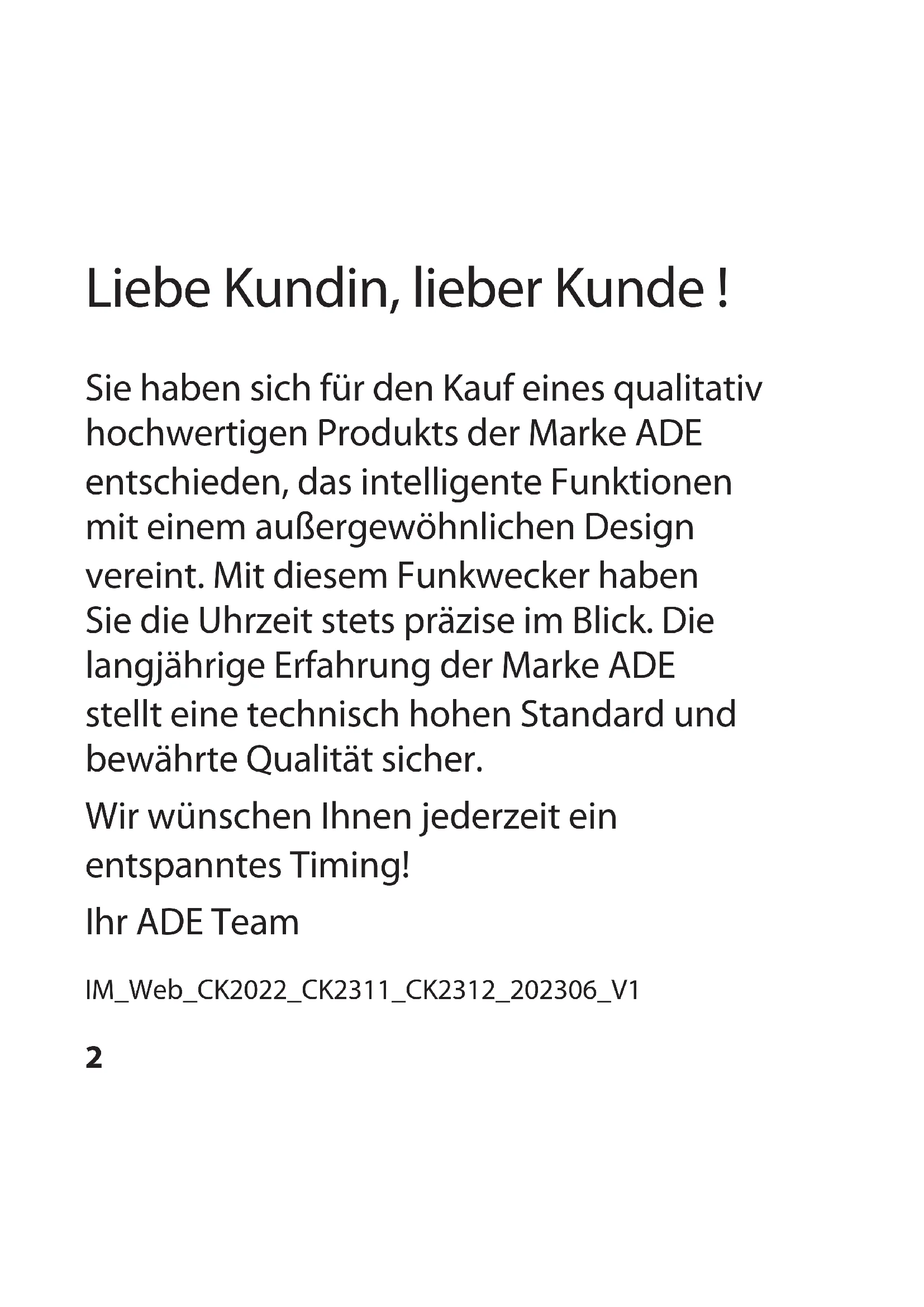 CK 2022 CK 2311 CK 23122 Liebe Kundin, lieber Kunde ! Sie haben sich für den Kauf eines qualitativ hochwertigen Produkts der Marke ADE entschieden, das intelligente Funktionen mit einem außergewöhnlichen Design vereint. Mit diesem Funkwecker haben Sie die Uhrzeit stets präzise im Blick. Die langjährige Erfahrung der Marke ADE stellt eine technisch hohen Standard und bewährte Qualität sicher. Wir wünschen Ihnen jederzeit ein entspanntes Timing! Ihr ADE Team IM_Web_CK2022_CK2311_CK2312_202306_V13