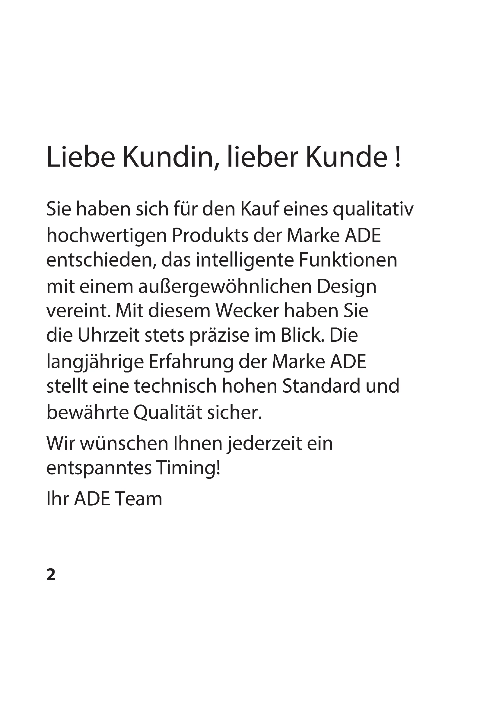 Batterien und Akkus gehören nicht in den Hausmüll Alle Batterien und Akkus müssen bei einer Sammelstelle der Gemeinde, des Stadtteils oder im Handel abgegeben werden. Dadurch können Batterien und Akkus einer umwelt- schonenden Entsorgung zugeführt werden. Druckbuch Funkwecker CK 1719.indb 21 03.01.2018 10:51:5722 Dear Customer! You have chosen to purchase a high-quality product from the ADE brand, which combines intelligent functions with an exceptional design. With this alarm clock, you always have a precise time in view. The many years of experience of the ADE brand ensures a high technical standard and proven quality. We wish you easy timing at any time! Your ADE Team Druckbuch Funkwecker CK 1719.indb 22 03.01.2018 10:51:5723