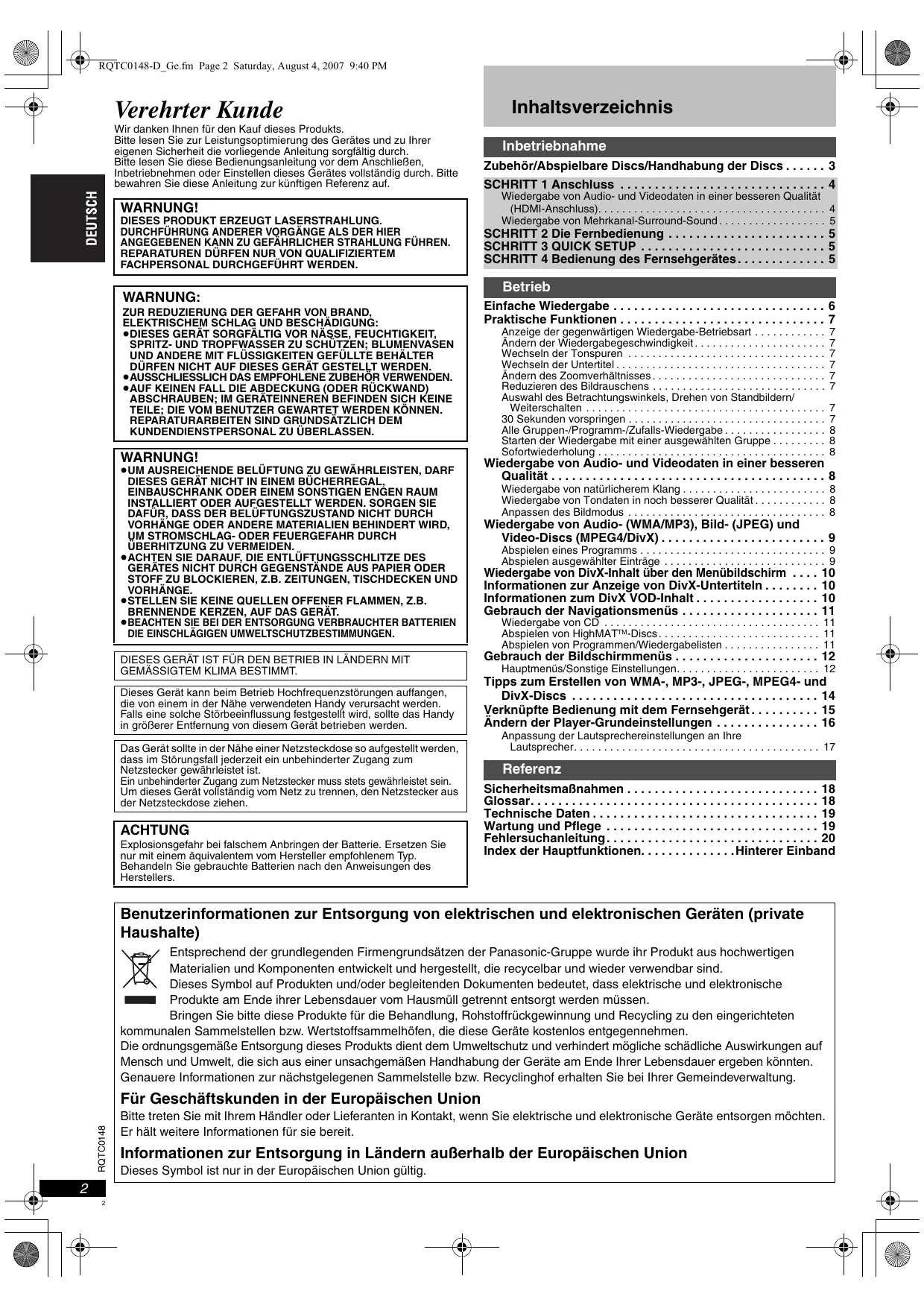 RQTC0148-D RQTC0148-D_Ge.fm Page 2 Saturday, August 4, 2007 9:40 PM Verehrter Kunde Wir danken Ihnen für den Kauf dieses Produkts. Bitte lesen Sie zur Leistungsoptimierung des Gerätes und zu Ihrer eigenen Sicherheit die vorliegende Anleitung sorgfältig durch. Bitte lesen Sie diese Bedienungsanleitung vor dem Anschließen, Inbetriebnehmen oder Einstellen dieses Gerätes vollständig durch. Bitte bewahren Sie diese Anleitung zur künftigen Referenz auf. WARNUNG! DIESES PRODUKT ERZEUGT LASERSTRAHLUNG. DURCHFÜHRUNG ANDERER VORGÄNGE ALS DER HIER ANGEGEBENEN KANN ZU GEFÄHRLICHER STRAHLUNG FÜHREN.