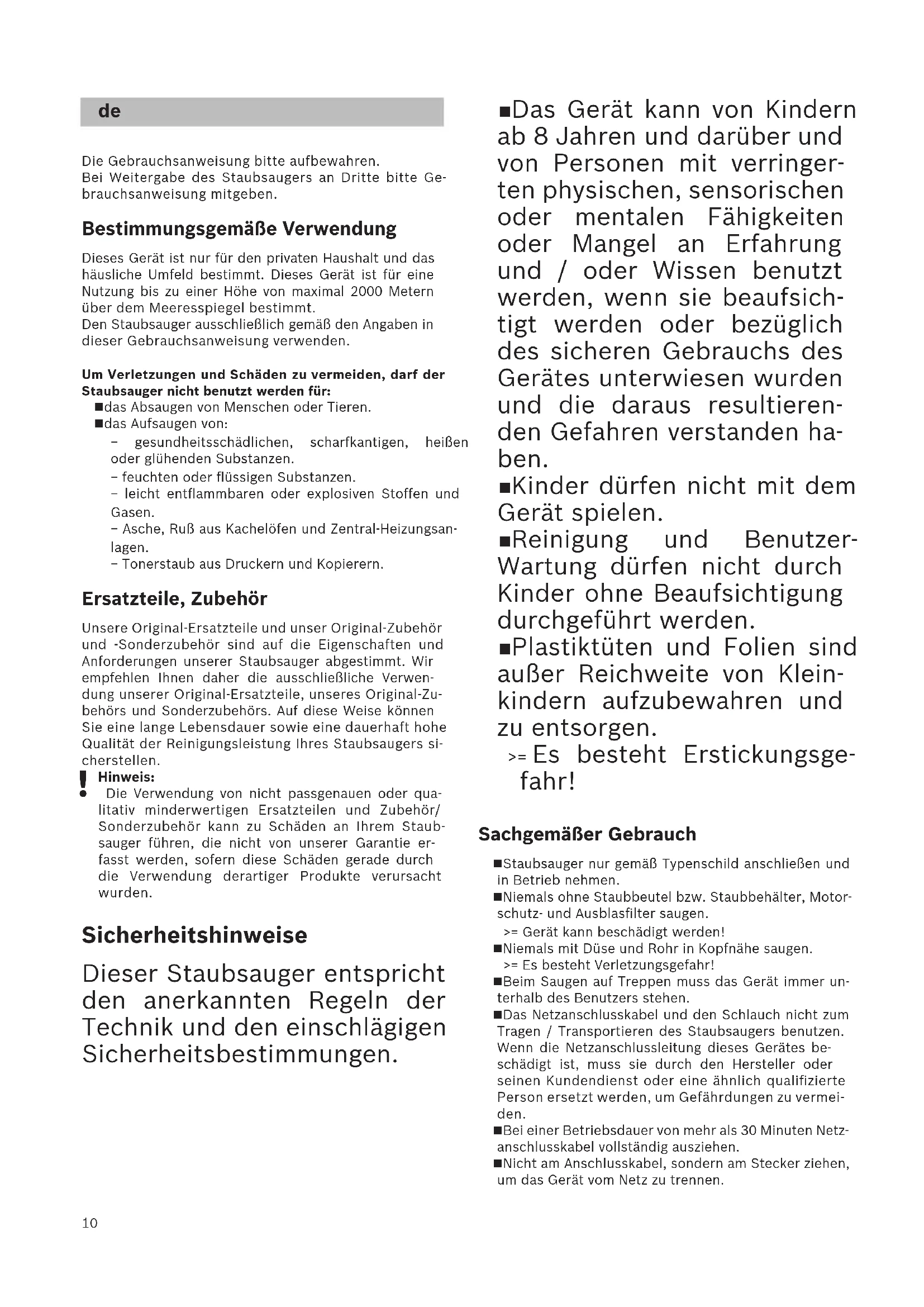 Die Gebrauchsanweisung bitte aufbewahren. Bei Weitergabe des Staubsaugers an Dritte bitte Ge-brauchsanweisung mitgeben. Bestimmungsgemäße Verwendung Dieses Gerät ist nur für den privaten Haushalt und das häusliche Umfeld bestimmt. Dieses Gerät ist für eine Nutzung bis zu einer Höhe von maximal 2000 Metern über dem Meeresspiegel bestimmt. Den Staubsauger ausschließlich gemäß den Angaben in dieser Gebrauchsanweisung verwenden. Um Verletzungen und Schäden zu vermeiden, darf der Staubsauger nicht benutzt werden für: das Absaugen von Menschen oder Tieren. das Aufsaugen von: − gesundheitsschädlichen, scharfkantigen, heißen oder glühenden Substanzen. − feuchten oder flüssigen Substanzen. − leicht entflammbaren oder explosiven Stoffen und Gasen. − Asche, Ruß aus Kachelöfen und Zentral-Heizungsan-lagen. − Tonerstaub aus Druckern und Kopierern. Ersatzteile, Zubehör Unsere Original-Ersatzteile und unser Original-Zubehör und -Sonderzubehör sind auf die Eigenschaften und Anforderungen unserer Staubsauger abgestimmt. Wir empfehlen Ihnen daher die ausschließliche Verwen-dung unserer Original-Ersatzteile, unseres Original-Zu-behörs und Sonderzubehörs. Auf diese Weise können Sie eine lange Lebensdauer sowie eine dauerhaft hohe Qualität der Reinigungsleistung Ihres Staubsaugers si-cherstellen. Hinweis: Die Verwendung von nicht passgenauen oder qua-litativ minderwertigen Ersatzteilen und Zubehör/ Sonderzubehör kann zu Schäden an Ihrem Staub-sauger führen, die nicht von unserer Garantie er-fasst werden, sofern diese Schäden gerade durch die Verwendung derartiger Produkte verursacht wurden. Sicherheitshinweise Dieser Staubsauger entspricht den anerkannten Regeln der Technik und den einschlägigen Sicherheitsbestimmungen. Das Gerät kann von Kindern ab 8 Jahren und darüber und von Personen mit verringer- ten physischen, sensorischen oder mentalen Fähigkeiten oder Mangel an Erfahrung und / oder Wissen benutzt werden, wenn sie beaufsich- tigt werden oder bezüglich des sicheren Gebrauchs des Gerätes unterwiesen wurden und die daraus resultieren- den Gefahren verstanden ha- ben. Kinder dürfen nicht mit dem Gerät spielen. Reinigung und Benutzer- Wartung dürfen nicht durch Kinder ohne Beaufsichtigung durchgeführt werden. Plastiktüten und Folien sind außer Reichweite von Klein- kindern aufzubewahren und zu entsorgen. >= Es besteht Erstickungsge- fahr! Sachgemäßer Gebrauch Staubsauger nur gemäß Typenschild anschließen und in Betrieb nehmen. Niemals ohne Staubbeutel bzw. Staubbehälter, Motor-schutz- und Ausblasfilter saugen. >= Gerät kann beschädigt werden! Niemals mit Düse und Rohr in Kopfnähe saugen. >= Es besteht Verletzungsgefahr! Beim Saugen auf Treppen muss das Gerät immer un-terhalb des Benutzers stehen. Das Netzanschlusskabel und den Schlauch nicht zum Tragen / Transportieren des Staubsaugers benutzen. Wenn die Netzanschlussleitung dieses Gerätes be-schädigt ist, muss sie durch den Hersteller oder seinen Kundendienst oder eine ähnlich qualifizierte Person ersetzt werden, um Gefährdungen zu vermei- den. Bei einer Betriebsdauer von mehr als 30 Minuten Netz-anschlusskabel vollständig ausziehen. Nicht am Anschlusskabel, sondern am Stecker ziehen, um das Gerät vom Netz zu trennen. de11 Das Netzanschlusskabel nicht über scharfe Kanten zie- hen und nicht einquetschen. Achten Sie darauf, dass der Netzstecker beim automa- tischen Kabeleinzug nicht gegen Personen, Körpertei- le, Tiere oder Gegenstände geschleudert wird. Netzanschlusskabel mit Hilfe des Netzsteckers führen. Vor allen Arbeiten am Staubsauger Netzstecker zie- hen. Beschädigten Staubsauger nicht in Betrieb nehmen. Beim Vorliegen einer Störung Netzstecker ziehen. Um Gefährdungen zu vermeiden, dürfen Reparaturen und Ersatzteileaustausch am Staubsauger nur vom au- torisierten Kundendienst durchgeführt werden. Staubsauger vor Witterungseinflüssen, Feuchtigkeit und Hitzequellen schützen. Keine brennbaren oder alkoholhaltigen Stoffe auf die Filter (Staubbeutel, Motorschutzfilter, Ausblasfilter etc.) geben. Staubsauger ist für den Baustellenbetrieb nicht geeig- net. >= Einsaugen von Bauschutt kann zur Beschädigung des Gerätes führen. Gerät ausschalten und Netzstecker ziehen, wenn nicht gesaugt wird. Ausgediente Geräte sofort unbrauchbar machen, da- nach das Gerät einer ordnungsgemäßen Entsorgung zuführen.