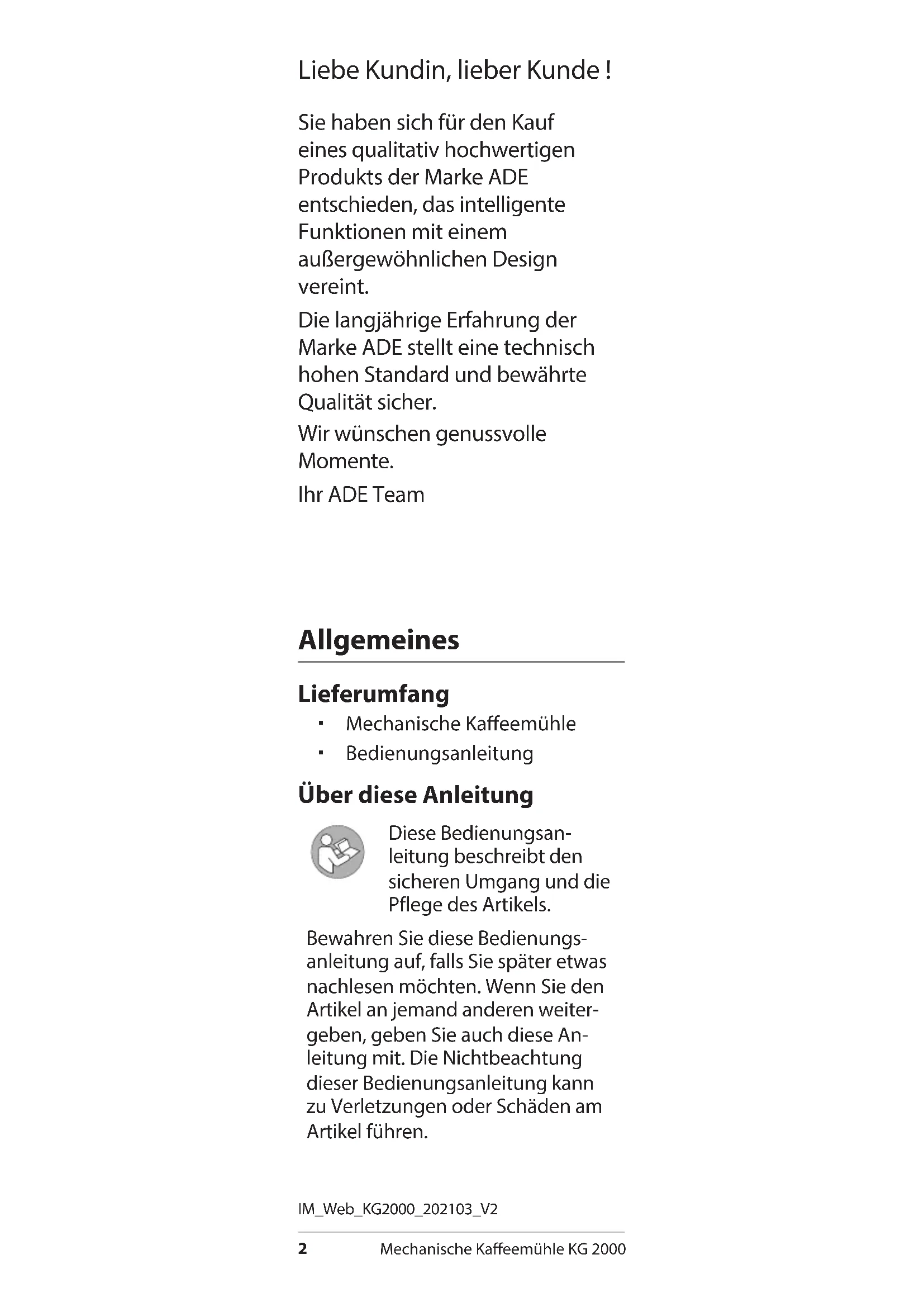 Mechanische Kaffeemühle Bedienungsanleitung KG 2000 Operating instructions | Instruccio- nes de operación | Mode d‘emploi Istruzioni per l‘uso | Instrukcja obsługi | Инструкция Deutsch English Español Français Italiano Polski Mechanical coffee mill Molinillo de café mecánico Moulin à café mécanique Macinacaffè meccanico Mechaniczny młynek do kawy Механическая кофемолка Pусский2 Mechanische Kaffeemühle KG 2000 Liebe Kundin, lieber Kunde ! Sie haben sich für den Kauf eines qualitativ hochwertigen Produkts der Marke ADE entschieden, das intelligente Funktionen mit einem außergewöhnlichen Design vereint. Die langjährige Erfahrung der Marke ADE stellt eine technisch hohen Standard und bewährte Qualität sicher. Wir wünschen genussvolle Momente. Ihr ADE Team Allgemeines Lieferumfang Mechanische Kaeemühle Bedienungsanleitung Über diese Anleitung Diese Bedienungsan- leitung beschreibt den sicheren Umgang und die Pflege des Artikels. Bewahren Sie diese Bedienungs- anleitung auf, falls Sie später etwas nachlesen möchten. Wenn Sie den Artikel an jemand anderen weiter- geben, geben Sie auch diese An- leitung mit. Die Nichtbeachtung dieser Bedienungsanleitung kann zu Verletzungen oder Schäden am Artikel führen. IM_Web_KG2000_202103_V2Mechanische Kaffeemühle KG 2000