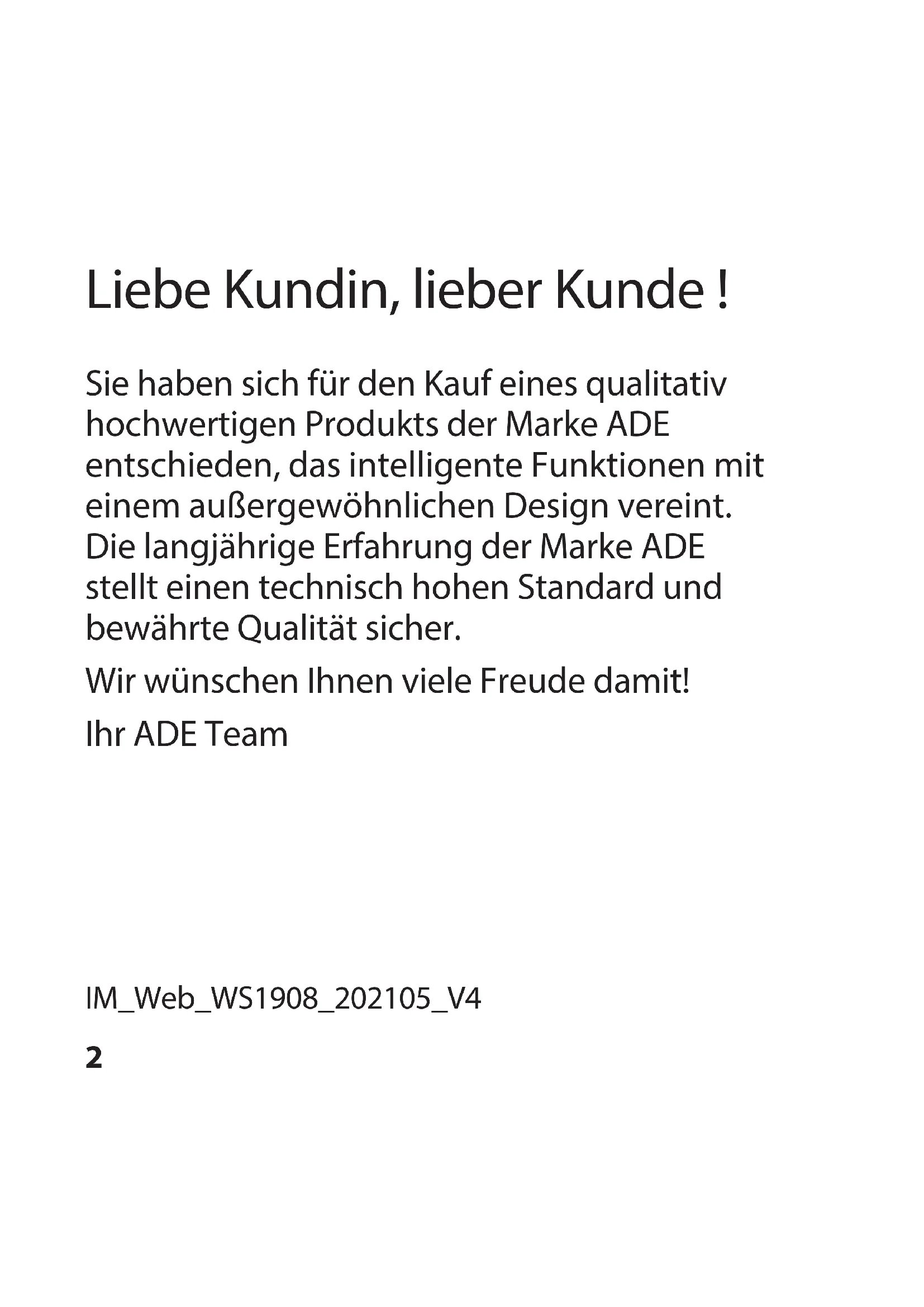 Bedienungsanleitung WS 1908 Operating Manual | Manual de instrucciones | Mode d’emploi | Istruzioni per l’uso | Instrukcja obsługi2 Liebe Kundin, lieber Kunde ! Sie haben sich für den Kauf eines qualitativ hochwertigen Produkts der Marke ADE entschieden, das intelligente Funktionen mit einem außergewöhnlichen Design vereint. Die langjährige Erfahrung der Marke ADE stellt einen technisch hohen Standard und bewährte Qualität sicher. Wir wünschen Ihnen viele Freude damit! Ihr ADE Team IM_Web_WS1908_202105_V43