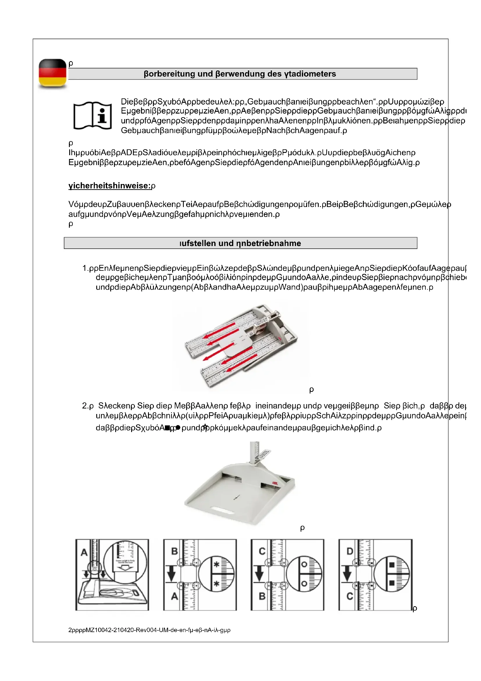 Dieses Symbol bedeutet: „Gebrauchsanweisung beachten“. Um präzise Ergebnisse zu erzielen, lesen Sie die Gebrauchsanweisung sorgfältig durch und folgen Sie den darin enthaltenen Instruktionen. Bewahren Sie die Gebrauchsanweisung für späteres Nachschlagen auf. Ihr mobiles ADE Stadiometer ist ein hochwertiges Produkt. Um die bestmöglichen Ergebnisse zu erzielen, befolgen Sie die folgenden Anweisungen bitte sorgfältig. Sicherheitshinweise: Vor dem Zusammenstecken Teile auf Beschädigungen prüfen. Bei Beschädigungen, Geräte aufgrund von Verletzungsgefahr nicht verwenden. Aufstellen und Inbetriebnahme