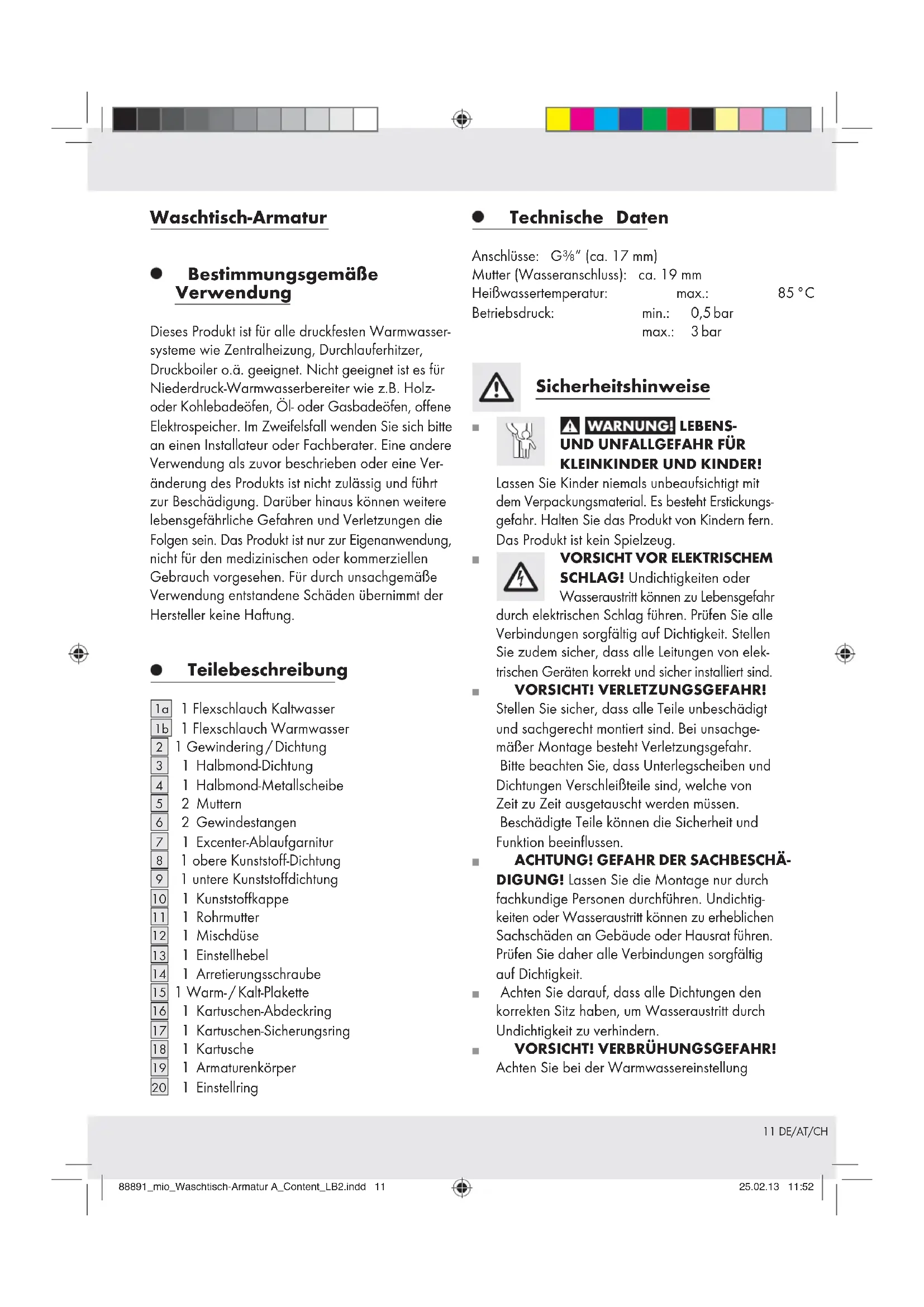 in regel- mäßigen Abständen heraus und entfernen Sie kalkhaltige Rückstände oder Fremdkörper. Bei Nichtbeachtung der Pflegeanleitung muss mit Schäden an der Oberfläche gerechnet werden. Garantieansprüche können dann nicht geltend gemacht werden. Entsorgung Die Verpackung besteht aus umwelt- freundlichen Materialien, die Sie über die örtlichen Recyclingstellen entsorgen können. Möglichkeiten zur Entsorgung des ausgedienten Produkts erfahren Sie bei Ihrer Gemeinde oder Stadtverwaltung. Informationen Trinkbarkeit von Leitungswasser Informieren Sie sich bei Ihren örtlichen Behörden über die Trinkbarkeit des Wassers in Ihrer Stadt / Gemeinde. Generell gilt für die Trinkbarkeit von Leitungswasser folgende Empfehlung: Lassen Sie Wasser aus Leitungen eine kurze Zeit laufen, wenn es länger als vier Stunden in den Leitungen stagniert hat. Verwenden Sie kein Stagnationswasser zur Zubereitung von Speisen und Getränken, besonders nicht bei der Ernährung von Säuglingen. Andernfalls können gesundheitliche Beschwerden auftreten. Frisches Wasser können Sie daran erkennen, dass es spürbar kühler die Leitung verlässt, als Stagnationswasser. 88891_mio_Waschtisch-Armatur A_Content_LB2.indd 13 25.02.13 11:5214 DE/AT/CH Verwenden Sie kein Stagnationswasser aus verchromten Leitungen zur Ernährung und / oder zur Körperpflege, wenn Sie gegen Nickel allergisch sind. Solches Wasser kann stark nickelhaltig sein und eine allergische Reaktion hervorrufen. Nutzen Sie kein Trinkwasser aus Bleileitungen für die Zubereitung von Säuglingsnahrung und / oder während der Schwangerschaft für die Zubereitung von Lebensmitteln. Blei wird ins Trinkwasser abgegeben und ist für Säuglinge und Kleinkinder besonders gesundheitsschädlich. 88891_mio_Waschtisch-Armatur A_Content_LB2.indd 14 25.02.13 11:5215 D E