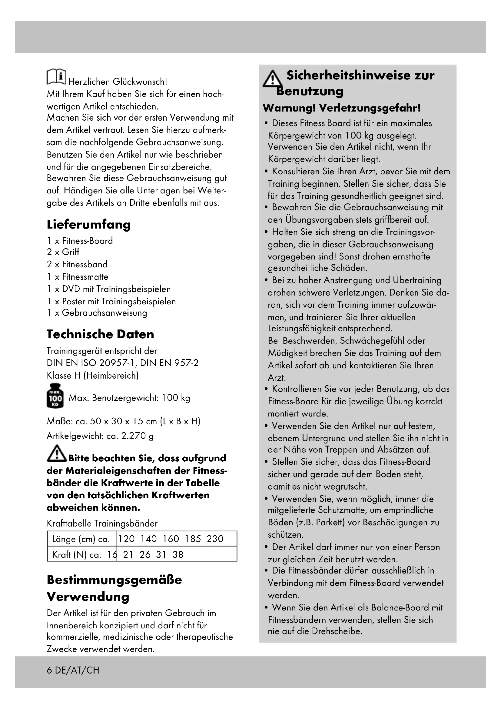 J6 DE/AT/CH Herzlichen Glückwunsch! Mit Ihrem Kauf haben Sie sich für einen hoch- wertigen Artikel entschieden. Machen Sie sich vor der ersten Verwendung mit dem Artikel vertraut. Lesen Sie hierzu aufmerk- sam die nachfolgende Gebrauchsanweisung. Benutzen Sie den Artikel nur wie beschrieben und für die angegebenen Einsatzbereiche. Bewahren Sie diese Gebrauchsanweisung gut auf. Händigen Sie alle Unterlagen bei Weiter- gabe des Artikels an Dritte ebenfalls mit aus. Lieferumfang 1 x Fitness-Board 2 x Griff 2 x Fitnessband 1 x Fitnessmatte 1 x DVD mit Trainingsbeispielen 1 x Poster mit Trainingsbeispielen 1 x Gebrauchsanweisung Technische Daten Trainingsgerät entspricht der DIN EN ISO 20957-1, DIN EN 957-2 Klasse H (Heimbereich) Max. Benutzergewicht: 100 kg Maße: ca. 50 x 30 x 15 cm (L x B x H) Artikelgewicht: ca. 2.270 g Bitte beachten Sie, dass aufgrund der Materialeigenschaften der Fitness- bänder die Kraftwerte in der Tabelle von den tatsächlichen Kraftwerten abweichen können. Krafttabelle Trainingsbänder Länge (cm) ca. 120 140 160 185 230 Kraft (N) ca. 16 21 26 31 38 Bestimmungsgemäße Verwendung Der Artikel ist für den privaten Gebrauch im Innenbereich konzipiert und darf nicht für kommerzielle, medizinische oder therapeutische Zwecke verwendet werden. Sicherheitshinweise zur Benutzung Warnung! Verletzungsgefahr!