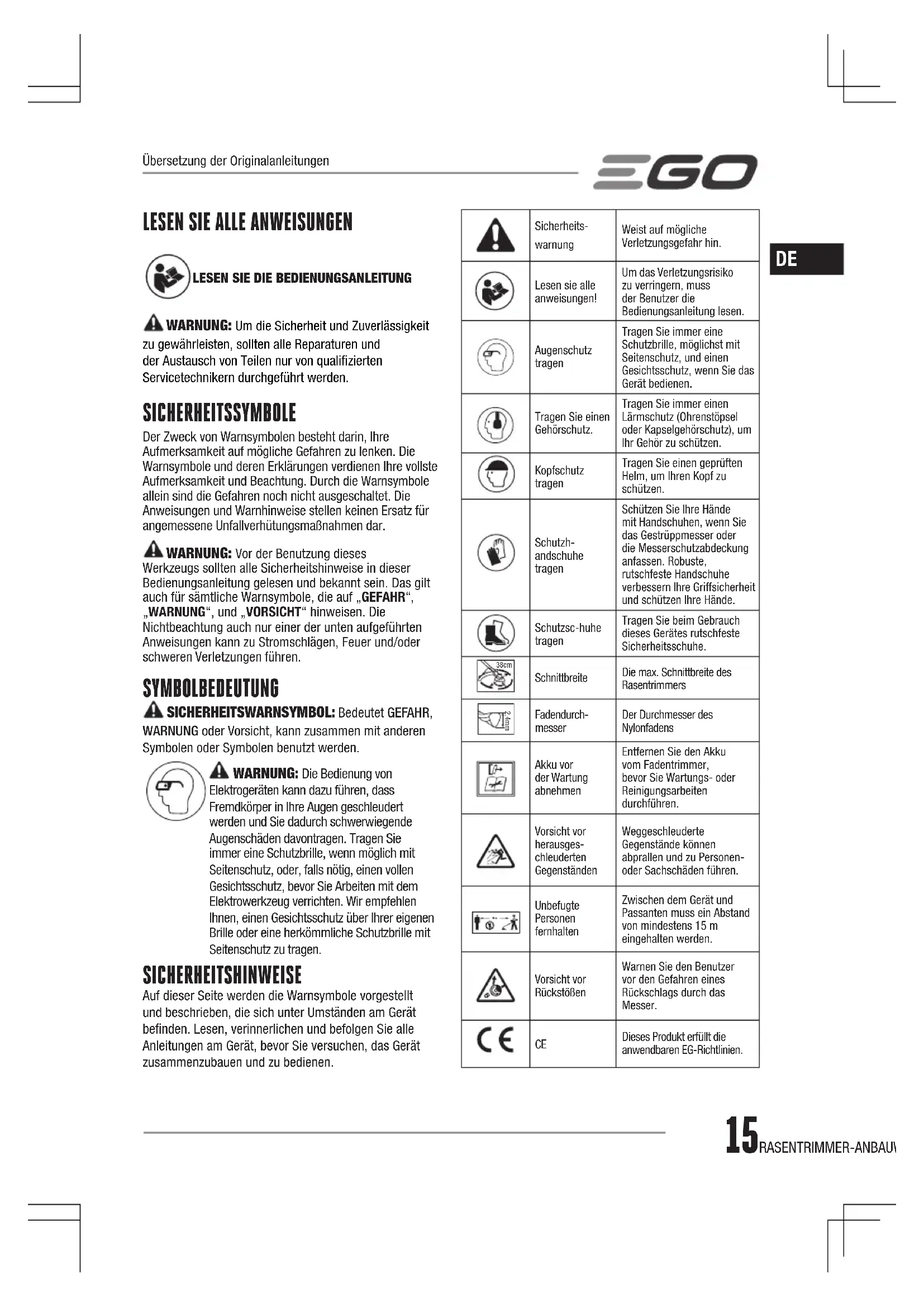 WARNUNG: Um die Sicherheit und Zuverlässigkeit zu gewährleisten, sollten alle Reparaturen und der Austausch von Teilen nur von qualizierten Servicetechnikern durchgeführt werden. SICHERHEITSSYMBOLE Der Zweck von Warnsymbolen besteht darin, Ihre Aufmerksamkeit auf mögliche Gefahren zu lenken. Die Warnsymbole und deren Erklärungen verdienen Ihre vollste Aufmerksamkeit und Beachtung. Durch die Warnsymbole allein sind die Gefahren noch nicht ausgeschaltet. Die Anweisungen und Warnhinweise stellen keinen Ersatz für angemessene Unfallverhütungsmaßnahmen dar. WARNUNG: Vor der Benutzung dieses Werkzeugs sollten alle Sicherheitshinweise in dieser Bedienungsanleitung gelesen und bekannt sein. Das gilt auch für sämtliche Warnsymbole, die auf „GEFAHR“, „WARNUNG“, und „VORSICHT“ hinweisen. Die Nichtbeachtung auch nur einer der unten aufgeführten Anweisungen kann zu Stromschlägen, Feuer und/oder schweren Verletzungen führen. SYMBOLBEDEUTUNG SICHERHEITSWARNSYMBOL: Bedeutet GEFAHR, WARNUNG oder Vorsicht, kann zusammen mit anderen Symbolen oder Symbolen benutzt werden. WARNUNG: Die Bedienung von Elektrogeräten kann dazu führen, dass Fremdkörper in Ihre Augen geschleudert werden und Sie dadurch schwerwiegende Augenschäden davontragen. Tragen Sie immer eine Schutzbrille, wenn möglich mit Seitenschutz, oder, falls nötig, einen vollen Gesichtsschutz, bevor Sie Arbeiten mit dem Elektrowerkzeug verrichten. Wir empfehlen Ihnen, einen Gesichtsschutz über Ihrer eigenen Brille oder eine herkömmliche Schutzbrille mit Seitenschutz zu tragen. SICHERHEITSHINWEISE Auf dieser Seite werden die Warnsymbole vorgestellt und beschrieben, die sich unter Umständen am Gerät benden. Lesen, verinnerlichen und befolgen Sie alle Anleitungen am Gerät, bevor Sie versuchen, das Gerät zusammenzubauen und zu bedienen.Sicherheits-warnungWeist auf mögliche Verletzungsgefahr hin.Lesen sie alle anweisungen!Um das Verletzungsrisiko zu verringern, muss der Benutzer die Bedienungsanleitung lesen.Augenschutz tragenTragen Sie immer eine Schutzbrille, möglichst mit Seitenschutz, und einen Gesichtsschutz, wenn Sie das Gerät bedienen.Tragen Sie einen Gehörschutz.Tragen Sie immer einen Lärmschutz (Ohrenstöpsel oder Kapselgehörschutz), um Ihr Gehör zu schützen.Kopfschutz tragenTragen Sie einen geprüften Helm, um Ihren Kopf zu schützen.Schutzh-andschuhe tragenSchützen Sie Ihre Hände mit Handschuhen, wenn Sie das Gestrüppmesser oder die Messerschutzabdeckung anfassen. Robuste, rutschfeste Handschuhe verbessern Ihre Griffsicherheit und schützen Ihre Hände.Schutzsc-huhe tragenTragen Sie beim Gebrauch dieses Gerätes rutschfeste Sicherheitsschuhe. 38cm SchnittbreiteDie max. Schnittbreite des Rasentrimmers 2.4mm Fadendurch-messerDer Durchmesser des NylonfadensAkku vor der Wartung abnehmenEntfernen Sie den Akku vom Fadentrimmer, bevor Sie Wartungs- oder Reinigungsarbeiten durchführen.Vorsicht vor herausges-chleuderten GegenständenWeggeschleuderte Gegenstände können abprallen und zu Personen- oder Sachschäden führen.Unbefugte Personen fernhaltenZwischen dem Gerät und Passanten muss ein Abstand von mindestens 15 m eingehalten werden.Vorsicht vor RückstößenWarnen Sie den Benutzer vor den Gefahren eines Rückschlags durch das Messer.