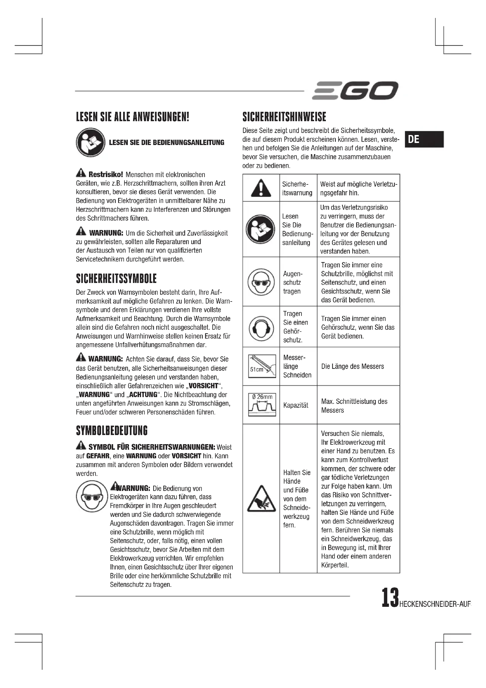 ◾ Halten Sie andere Personen von dem allgemeinen Arbeitsbereich fern. Stellen Sie bei Betrieb sicher, dass andere Personen und Haustiere mindestens 15 m von der Stabheckenschere entfernt sind. ◾ Verbieten Sie Kindern den Umgang mit der Heckenschere. ◾ Benutzen Sie beim Gebrauch der Heckenschere beide Hände. Die Benutzung nur einer Hand kann zum Kontrollverlust führen und schwere Verletzungen verursachen. ◾ Übernehmen Sie sich nicht. Achten Sie stets auf einen festen Stand und halten Sie das Gleichgewicht. Lassen Sie besondere Vorsicht bei glatten Bedingungen (nasser Boden, Schnee) und auf schwierigem, verwildertem Gelände walten. Achten Sie auf verborgene Hindernisse wie Baumstümpfe, Wurzeln und Gräben, um nicht zu stolpern. Seien Sie besonders vorsichtig, wenn Sie an Hängen oder auf unebenem Untergrund arbeiten. ◾ Nicht auf Leitern, Dächern, Bäumen oder anderen instabilen Untergründen verwenden. Durch einen sicheren Halt auf festem Untergrund lässt sich die Heckenschere auch in unerwarteten Situation besser unter Kontrolle halten. ◾ Lassen Sie die Messer nie aus den Augen - schneiden Sie keine Stellen der Hecke, die Sie nicht sehen können. Wenn Sie die Oberseite einer höheren Hecke schneiden, prüfen Sie regelmäßig, ob sich auf der anderen Seite der Hecke andere Personen, Tiere oder Hindernisse benden. ◾ Prüfen Sie beschädigte Teile, bevor Sie die Heckenschere weiter benutzen. Überprüfen Sie die Montage, prüfen Sie bewegliche Teile auf die korrekte Justierung, suchen Sie nach klemmenden Teilen, Bruchstellen und sonstigen Umständen, die die Funktion beeinträchtigen können. ◾ Prüfen Sie regelmäßig, ob die Schrauben des Messers und des Motors fest angezogen sind. Prüfen Sie das Messer auf Schäden (z. B. verbogene Stellen, Risse und Abnutzung). Wechseln Sie die Klinge nur durch eine Klinge von EGO