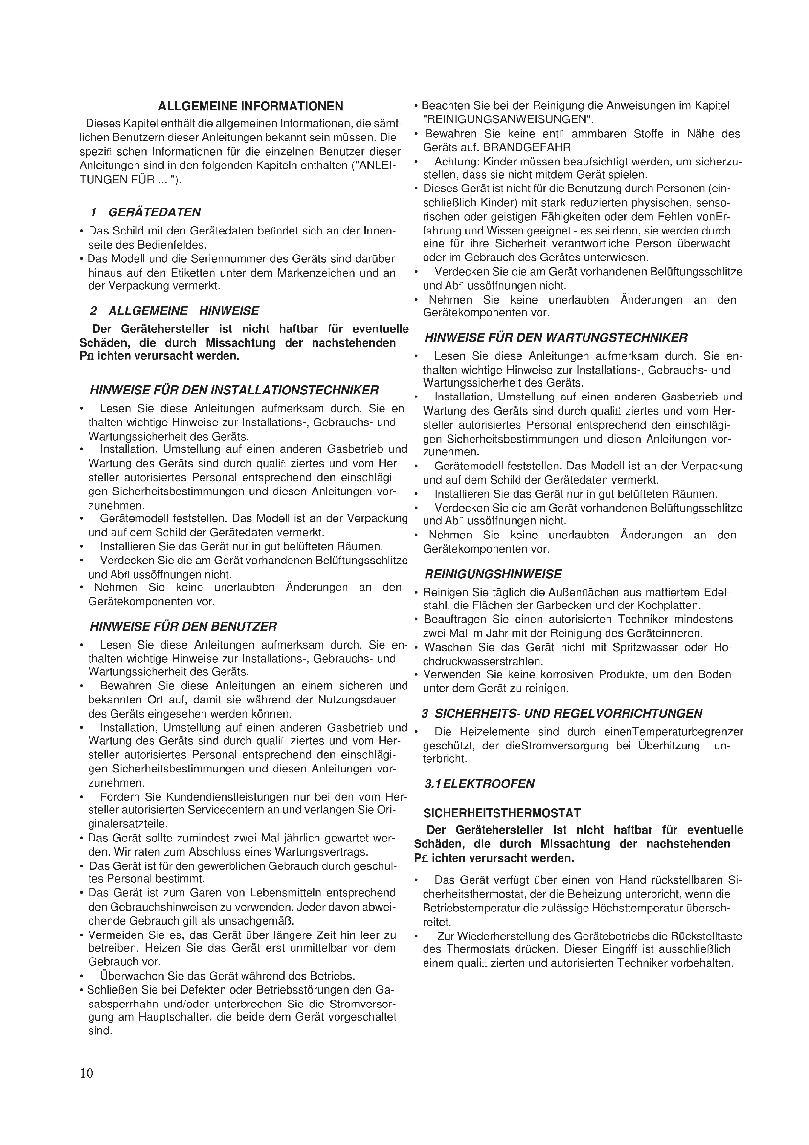 Die Abfl ussleitungen müssen aus bis zu 100 °C hitzebeständi- gen Materialien gefertigt sein. Der Geräteboden darf nicht dem beim Warmwasserablauf erzeugten Schwaden ausgesetzt werden. 9 INBETRIEBNAHME Siehe Kapitel "WARTUNGSANLEITUNGEN". GEBRAUCHSANLEITUNGEN