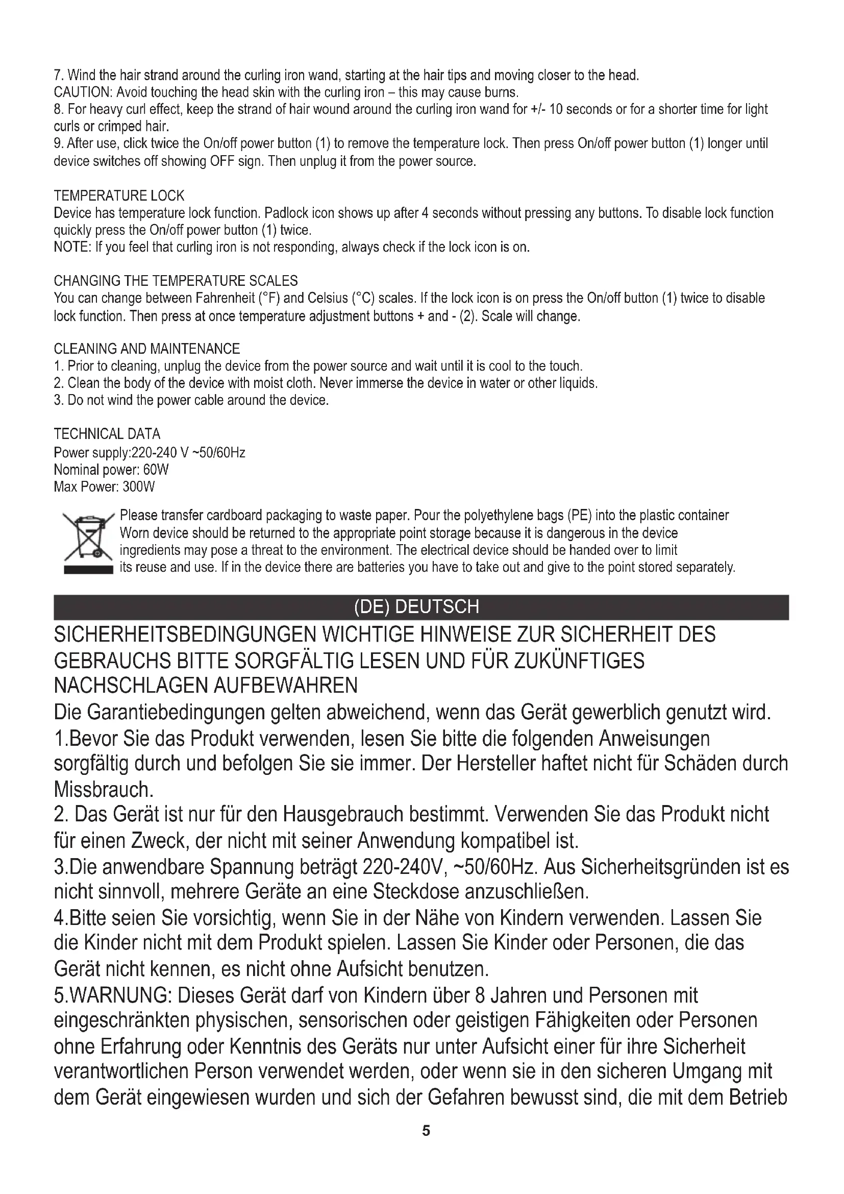 ACHTUNG: Vermeiden Sie es, die Kopfhaut mit dem Lockenstab zu berühren – dies kann zu Verbrennungen führen. 8. Um einen starken Lockeneffekt zu erzielen, halten Sie die Haarsträhne für +/- 10 Sekunden um den Lockenstab gewickelt oder für eine kürzere Zeit bei leichten Locken oder gekräuselten Haaren. 9. Klicken Sie nach der Verwendung zweimal auf den Ein-/Ausschalter (1), um die Temperatursperre zu entfernen. Drücken Sie dann den Ein-/Ausschalter (1) länger, bis sich das Gerät ausschaltet. Trennen Sie es dann von der Stromquelle.