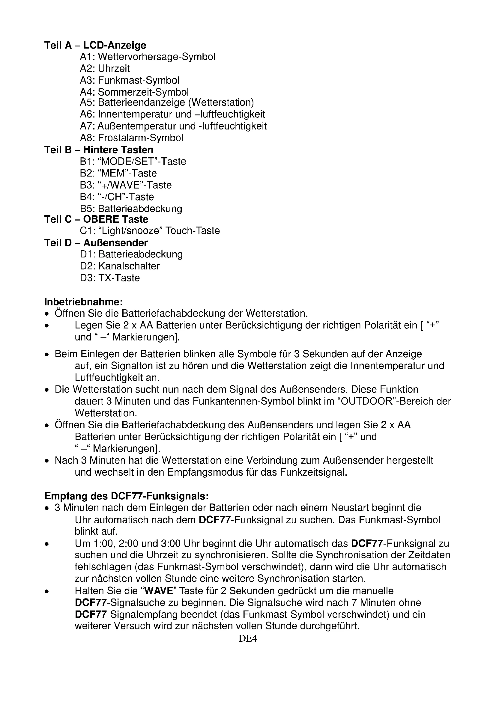 DE1 WS9255 Bedienungsanleitung Funktionen: DCF77-Funkuhrzeit 12/24 Stunden Zeitformat Alarmfunktion Schlummerfunktion(Ausgeschaltet oder 1~60 Minuten) Batterieendanzeige Luftfeuchtigkeit: Innen- & Außenmessbereich: 20%RH ~ 95%RH Temperatur: o Innentemperaturmessbereich: -9.9°C (14.1°F) ~ 50°C (122°F) o Außentemperaturmessbereich: -25°C (-13°F) ~ 50°C (122°F) o Temperatur alternativ in ℃ oder ℉. o Außenthermometer und Frostalarm Maximale /minimale Werteabfrage für Temperatur und Luftfeuchtigkeit Funk-Außensensor: o Wandaufhängung oder Tischaufstellung o 3 Kanäle auswählbar o 433.92MHz Übertragungsfrequenz o Maximale Sendeleistung: 13 dBm o 30 Meter Übertragungsreichweite (im Freifeld) Wettervorhersagefunktion Stromversorgung: Wetterstation: Batterien: 2 x LR6 AA Funk-Außensensor: Batterien: 2 x LR6 AADE2 WetterstationDE3DE4 Teil A – LCD-Anzeige A1: Wettervorhersage-Symbol A2: Uhrzeit A3: Funkmast-Symbol A4: Sommerzeit-Symbol A5: Batterieendanzeige (Wetterstation) A6: Innentemperatur und –luftfeuchtigkeit A7: Außentemperatur und -luftfeuchtigkeit A8: Frostalarm-Symbol Teil B – Hintere Tasten B1: “MODE/SET”-Taste B2: “MEM”-Taste B3: “+/WAVE”-Taste B4: “-/CH”-Taste B5: Batterieabdeckung Teil C – OBERE Taste C1: “Light/snooze” Touch-Taste Teil D – Außensender D1: Batterieabdeckung D2: Kanalschalter D3: TX-Taste Inbetriebnahme: Öffnen Sie die Batteriefachabdeckung der Wetterstation. Legen Sie 2 x AA Batterien unter Berücksichtigung der richtigen Polarität ein [ “+” und “ –“ Markierungen]. Beim Einlegen der Batterien blinken alle Symbole für 3 Sekunden auf der Anzeige auf, ein Signalton ist zu hören und die Wetterstation zeigt die Innentemperatur und Luftfeuchtigkeit an. Die Wetterstation sucht nun nach dem Signal des Außensenders. Diese Funktion dauert 3 Minuten und das Funkantennen-Symbol blinkt im “OUTDOOR”-Bereich der Wetterstation. Öffnen Sie die Batteriefachabdeckung des Außensenders und legen Sie 2 x AA Batterien unter Berücksichtigung der richtigen Polarität ein [ “+” und “ –“ Markierungen]. Nach 3 Minuten hat die Wetterstation eine Verbindung zum Außensender hergestellt und wechselt in den Empfangsmodus für das Funkzeitsignal. Empfang des DCF77-Funksignals: 3 Minuten nach dem Einlegen der Batterien oder nach einem Neustart beginnt die Uhr automatisch nach dem DCF77-Funksignal zu suchen. Das Funkmast-Symbol blinkt auf. Um 1:00, 2:00 und 3:00 Uhr beginnt die Uhr automatisch das DCF77-Funksignal zu suchen und die Uhrzeit zu synchronisieren. Sollte die Synchronisation der Zeitdaten fehlschlagen (das Funkmast-Symbol verschwindet), dann wird die Uhr automatisch zur nächsten vollen Stunde eine weitere Synchronisation starten. Halten Sie die “WAVE” Taste für 2 Sekunden gedrückt um die manuelle DCF77-Signalsuche zu beginnen. Die Signalsuche wird nach 7 Minuten ohne DCF77-Signalempfang beendet (das Funkmast-Symbol verschwindet) und ein weiterer Versuch wird zur nächsten vollen Stunde durchgeführt.DE5 Drücken Sie die “WAVE” Taste während der Signalsuche um diese zu beenden. Hinweise: Ein blinkendes Funkmast-Symbol signalisiert eine aktive DCF77 Empfangssuche. Ein dauerhaft aufleuchtendes Funkmast-Symbol bedeutet, dass das DCF77-Funksignal erfolgreich empfangen wurde. Eine Mindestentfernung von 2,5 Metern zu allen möglichen Störquellen wird empfohlen, wie z.B. von Fernsehgeräten und Computerbildschirmen. Der Funkempfang ist schwächer in Räumen mit Betonwänden (z.B. in Kellern) und in Büros. In solchen Umgebungen sollte die Wetterstation in der Nähe eines Fensters aufgestellt werden. Während dem Empfang des Funksignals sind nur die "SNOOZE/LIGHT" und die "WAVE" Taste nutzbar, andere Tasten sind funktionslos. Drücken Sie die “WAVE” Taste um den Empfang zu beenden und den Zugriff auf andere Funktionen wieder freizugeben. Manuelle Zeiteinstellung: Halten Sie die “MODE” Taste für 2 Sekunden gedrückt und die Temperatureinheit °C blinkt. Drücken sie die “+” und die “-”Tasten um zwischen den Temperatureinheiten °C und °F zu wählen. Drücken Sie die “MODE” Taste um die Einstellung zu bestätigen und der 12/24 Stundenmodus blinkt. Drücken Sie die “+” und die “-”Tasten um zwischen dem 12/24 Stundenmodus zu wechseln.. Drücken Sie die “MODE” Taste um die Einstellung zu bestätigen und die Zeitzone blinkt. Drücken Sie die “+” und die “-” Tasten um die Zeitzone(-12 bis +12) einzustellen. Für Deutschland wird z.B. die Zeitzone 00 und für das Vereinigte Königreich wird die Zeitzone -01 genutzt. Drücken Sie die “MODE” Taste um die Einstellung zu bestätigen und die Stunde blinkt. Drücken Sie die “+” und die “-” Tasten um die Stunde einzustellen. Drücken Sie die “MODE” Taste um die Einstellung zu bestätigen und die Minute blinkt. Drücken Sie die “+”und die “-” Tasten um die Minute einzustellen. Drücken Sie die “MODE” Taste um die Einstellung zu bestätigen und die Wettervorhersage blinkt. Drücken Sie die “+” und die “-” Tasten um eine Wettervorhersage passend zur derzeitigen Wettersituation einzustellen. Drücken Sie die “MODE” Taste um die Einstellung zu bestätigen und zu beenden. Die Wetterstation wechselt in den normalen Zeitanzeigemodus. Hinweis: Die Wetterstation beendet automatisch den Einstellungsmodus und wechselt in den normalen Zeitanzeige- modus, wenn innerhalb von 20 Sekunden keine Taste gedrückt wird. Alarmeinstellung: Drücken Sie die “+” Taste und das “ ”Symbol wird auf dem LCD angezeigt. Drücken Sie die “+” Taste erneut und das “ ” Symbol verschwindet von der Anzeige und die Alarmfunktion ist deaktiviert. Drücken Sie die “MODE” Taste und die Alarmzeit wird auf dem LCD angezeigt. Halten Sie die “MODE” für 2 Sekunden gedrückt und die Stundenanzeige derDE6 Alarmzeit blinkt. Drücken Sie die “+”und die “-”Tasten um die Stunde einzustellen. Drücken Sie di