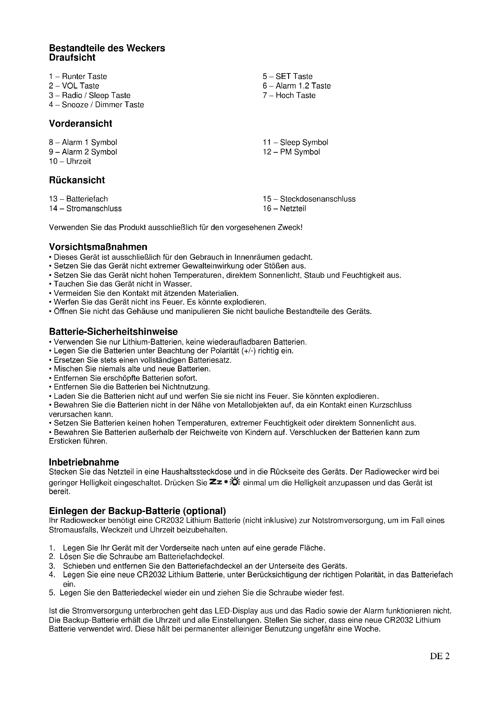 Vorderansicht 8 Alarm 1 Symbol 9 Alarm 2 Symbol 10 Uhrzeit 11 Sleep Symbol 12 PM Symbol Rückansicht 13 Batteriefach 14 Stromanschluss 15 Steckdosenanschluss 16 Netzteil Verwenden Sie das Produkt ausschließlich für den vorgesehenen Zweck! Vorsichtsmaßnahmen