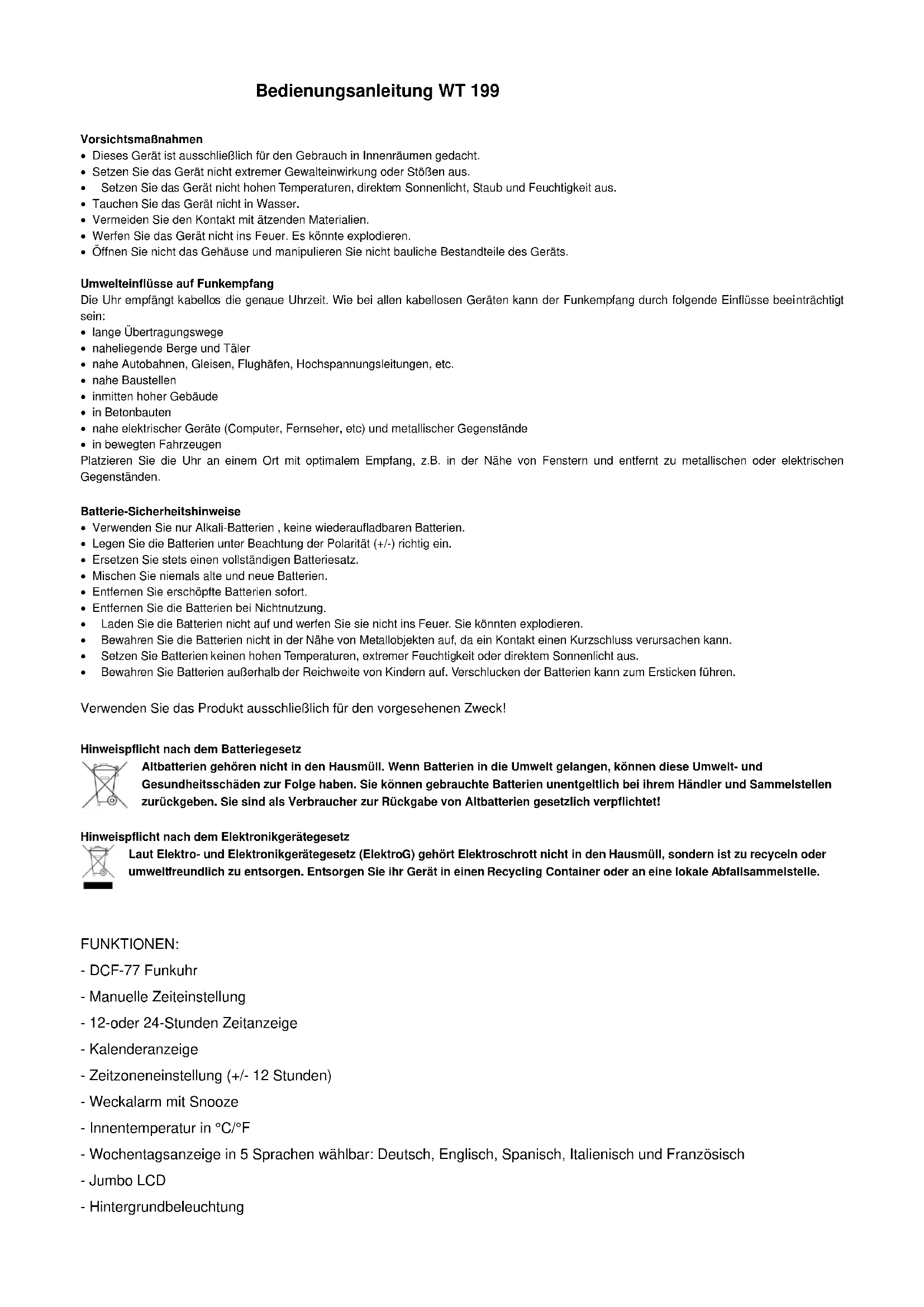 Bedienungsanleitung WT 199 Vorsichtsmaßnahmen Dieses Gerät ist ausschließlich für den Gebrauch in Innenräumen gedacht. Setzen Sie das Gerät nicht extremer Gewalteinwirkung oder Stößen aus. Setzen Sie das Gerät nicht hohen Temperaturen, direktem Sonnenlicht, Staub und Feuchtigkeit aus. Tauchen Sie das Gerät nicht in Wasser. Vermeiden Sie den Kontakt mit ätzenden Materialien. Werfen Sie das Gerät nicht ins Feuer. Es könnte explodieren. Öffnen Sie nicht das Gehäuse und manipulieren Sie nicht bauliche Bestandteile des Geräts. Umwelteinflüsse auf Funkempfang Die Uhr empfängt kabellos die genaue Uhrzeit. Wie bei allen kabellosen Geräten kann der Funkempfang durch folgende Einflüsse beeinträchtigt sein: lange Übertragungswege naheliegende Berge und Täler nahe Autobahnen, Gleisen, Flughäfen, Hochspannungsleitungen, etc. nahe Baustellen inmitten hoher Gebäude in Betonbauten nahe elektrischer Geräte (Computer, Fernseher, etc) und metallischer Gegenstände in bewegten Fahrzeugen Platzieren Sie die Uhr an einem Ort mit optimalem Empfang, z.B. in der Nähe von Fenstern und entfernt zu metallischen oder elektrischen Gegenständen. Batterie-Sicherheitshinweise Verwenden Sie nur Alkali-Batterien , keine wiederaufladbaren Batterien. Legen Sie die Batterien unter Beachtung der Polarität (+/-) richtig ein. Ersetzen Sie stets einen vollständigen Batteriesatz. Mischen Sie niemals alte und neue Batterien. Entfernen Sie erschöpfte Batterien sofort. Entfernen Sie die Batterien bei Nichtnutzung. Laden Sie die Batterien nicht auf und werfen Sie sie nicht ins Feuer. Sie könnten explodieren. Bewahren Sie die Batterien nicht in der Nähe von Metallobjekten auf, da ein Kontakt einen Kurzschluss verursachen kann. Setzen Sie Batterien keinen hohen Temperaturen, extremer Feuchtigkeit oder direktem Sonnenlicht aus. Bewahren Sie Batterien außerhalb der Reichweite von Kindern auf. Verschlucken der Batterien kann zum Ersticken führen. Verwenden Sie das Produkt ausschließlich für den vorgesehenen Zweck! Hinweispflicht nach dem Batteriegesetz Altbatterien gehören nicht in den Hausmüll. Wenn Batterien in die Umwelt gelangen, können diese Umwelt- und Gesundheitsschäden zur Folge haben. Sie können gebrauchte Batterien unentgeltlich bei ihrem Händler und Sammelstellen zurückgeben. Sie sind als Verbraucher zur Rückgabe von Altbatterien gesetzlich verpflichtet! Hinweispflicht nach dem Elektronikgerätegesetz Laut Elektro- und Elektronikgerätegesetz (ElektroG) gehört Elektroschrott nicht in den Hausmüll, sondern ist zu recyceln oder umweltfreundlich zu entsorgen. Entsorgen Sie ihr Gerät in einen Recycling Container oder an eine lokale Abfallsammelstelle.