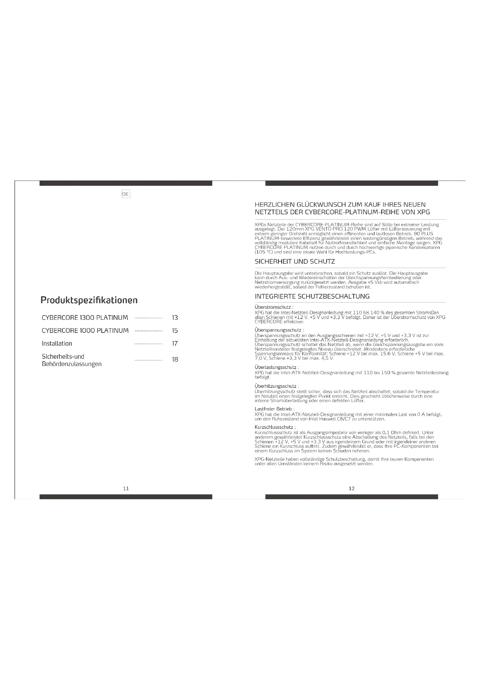 Die Hauptausgabe wird unterbrochen, sobald ein Schutz auslöst. Die Hauptausgabe kann durch Aus- und Wiedereinschalten der Gleichspannungsfernbedienung oder Netzstromversorgung zurückgesetzt werden. Ausgabe +5 Vsb wird automatisch wiederhergestellt, sobald der Fehlerzustand behoben ist. INTEGRIERTE SCHUTZBESCHALTUNG Überstromschutz : XPG hat die Intel-Netzteil-Designanleitung mit 110 bis 140 % des gesamten Stromsan allen Schienen mit +12 V, +5 V und +3,3 V befolgt. Daher ist der Überstromschutz von XPG CYBERCORE effektiver. Überspannungsschutz : Überspannungsschutz an den Ausgangsschienen mit +12 V, +5 V und +3,3 V ist zur Einhaltung der aktuellsten Intel-ATX-Netzteil-Designanleitung erforderlich. Überspannungsschutz schaltet das Netzteil ab, wenn die Gleichspannungsausgabe ein vom Netzteilhersteller festgelegtes Niveau überschreitet. Mindestens erforderliche Spannungsniveaus für Konformität: Schiene +12 V bei max. 15,6 V, Schiene +5 V bei max. 7,0 V, Schiene +3,3 V bei max. 4,5 V. Überlastungsschutz : XPG hat die Intel-ATX-Netzteil-Designanleitung mit 110 bis 150 % gesamte Netzteilleistung befolgt. Überhitzungsschutz : Überhitzungsschutz stellt sicher, dass sich das Netzteil abschaltet, sobald die Temperatur im Netzteil einen festgelegten Punkt erreicht. Dies geschieht üblicherweise durch eine interne Stromüberlastung oder einen defekten Lüfter. Lastfreier Betrieb : XPG hat die Intel-ATX-Netzteil-Designanleitung mit einer minimalen Last von 0 A befolgt, um den Ruhezustand von Intel Haswell C6/C7 zu unterstützen. Kurzschlussschutz : Kurzschlussschutz ist als Ausgangsimpedanz von weniger als 0,1 Ohm definiert. Unter anderem gewährleistet Kurzschlussschutz eine Abschaltung des Netzteils, falls bei den Schienen +12 V, +5 V und +3,3 V aus irgendeinem Grund oder mit irgendeiner anderen Schiene ein Kurzschluss auftritt. Zudem gewährleistet er, dass Ihre PC-Komponenten bei einem Kurzschluss im System keinen Schaden nehmen. XPG-Netzteile haben vollständige Schutzbeschaltung, damit Ihre teuren Komponenten unter allen Umständen keinem Risiko ausgesetzt werden. 1211Gleichspannungskabelauflistung Technische Daten und Sicherheitshinweise Netzteil-Lüfterkurve