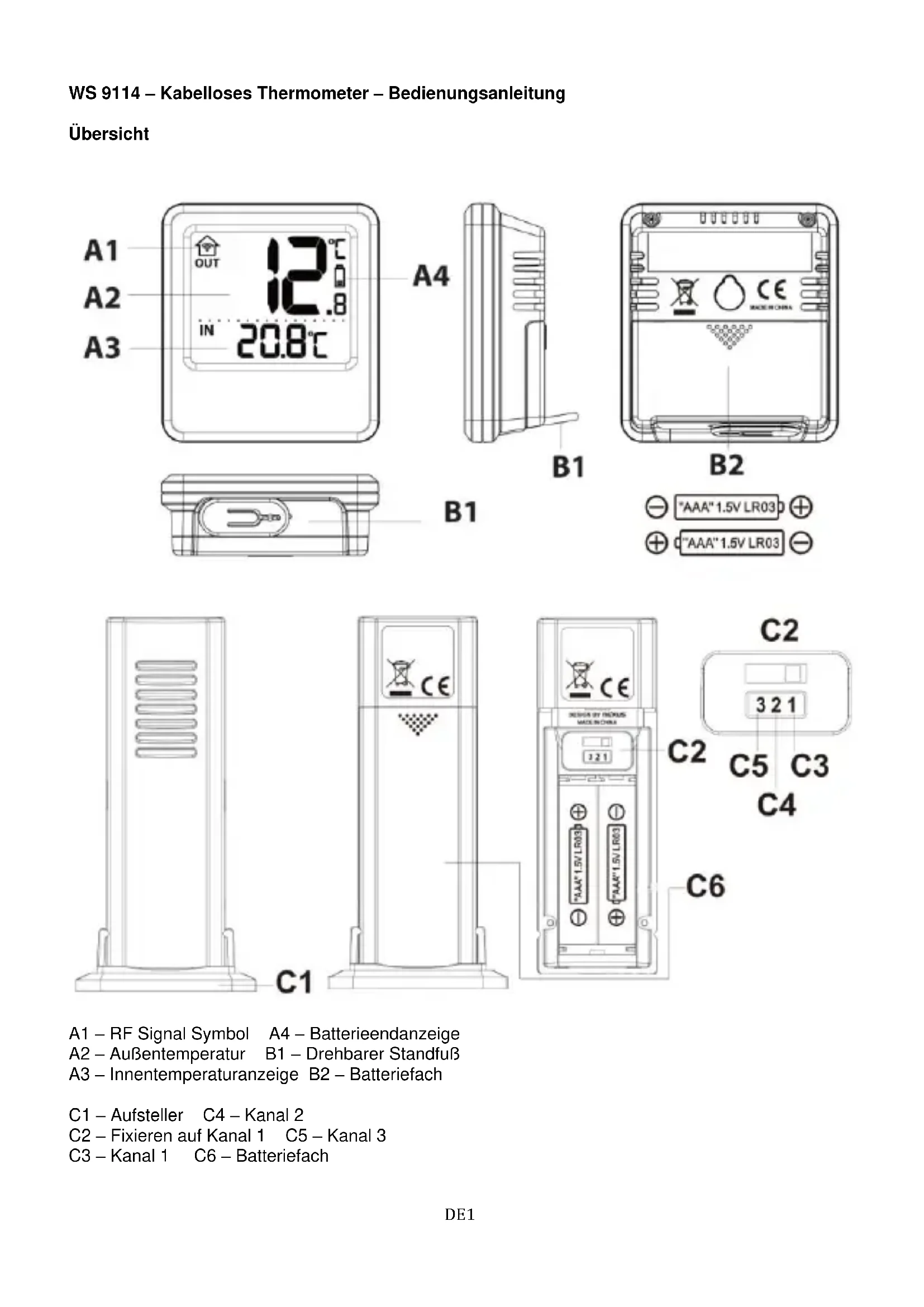 A1 – RF Signal Symbol A4 – Batterieendanzeige A2 – Außentemperatur B1 – Drehbarer Standfuß A3 – Innentemperaturanzeige B2 – Batteriefach C1 – Aufsteller C4 – Kanal 2 C2 – Fixieren auf Kanal 1 C5 – Kanal 3 C3 – Kanal 1 C6 – BatteriefachDE2