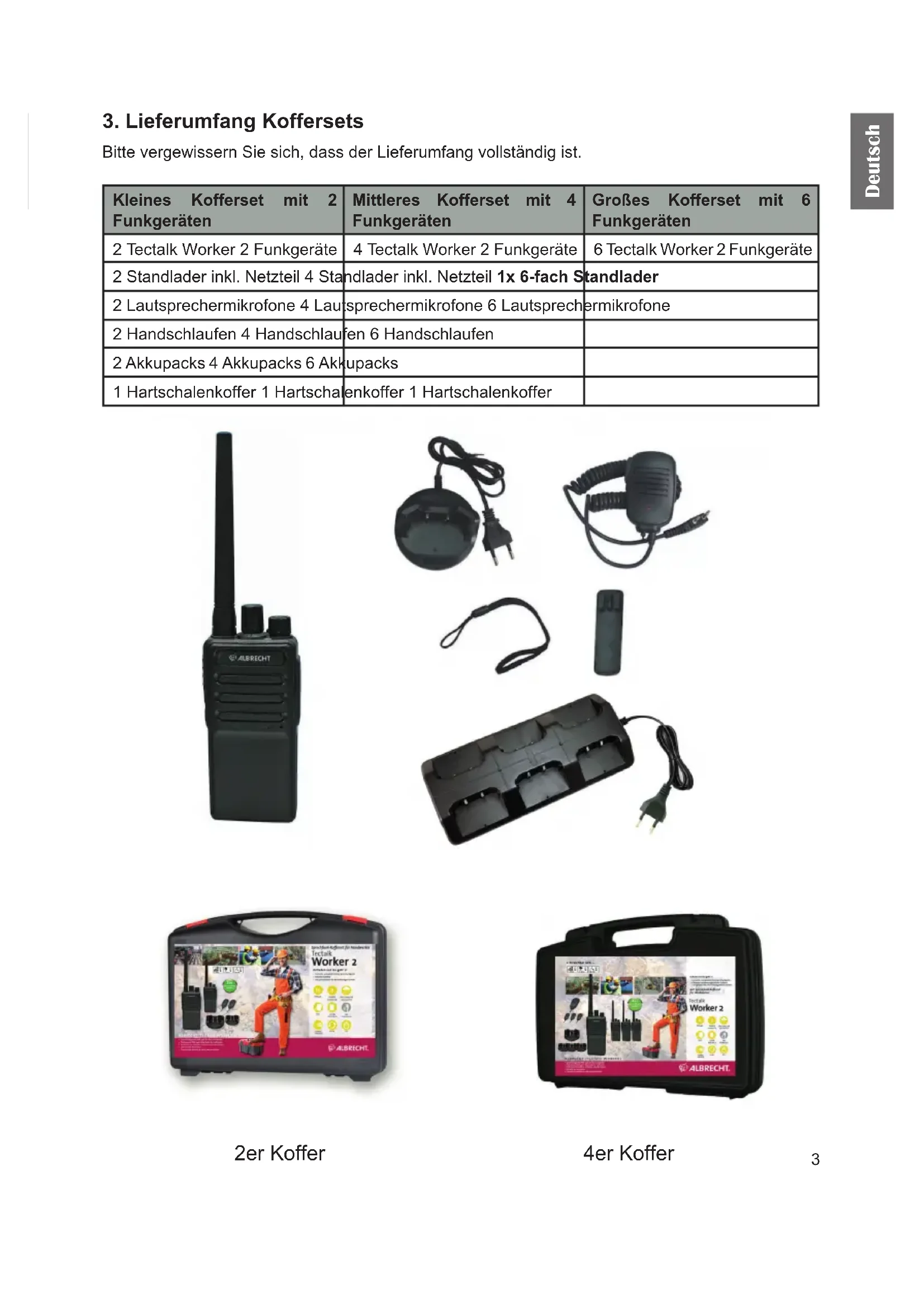 Bitte vergewissern Sie sich, dass der Lieferumfang vollständig ist. Kleines Kofferset mit 2 Funkgeräten Mittleres Kofferset mit 4 Funkgeräten Großes Kofferset mit 6 Funkgeräten 2 Tectalk Worker 2 Funkgeräte 4 Tectalk Worker 2 Funkgeräte 6 Tectalk Worker 2 Funkgeräte 2 Standlader inkl. Netzteil 4 Standlader inkl. Netzteil 1x 6-fach Standlader 2 Lautsprechermikrofone 4 Lautsprechermikrofone 6 Lautsprechermikrofone 2 Handschlaufen 4 Handschlaufen 6 Handschlaufen 2 Akkupacks 4 Akkupacks 6 Akkupacks 1 Hartschalenkoffer 1 Hartschalenkoffer 1 Hartschalenkoffer 2er Koffer 4er Koffer4 Deutsch