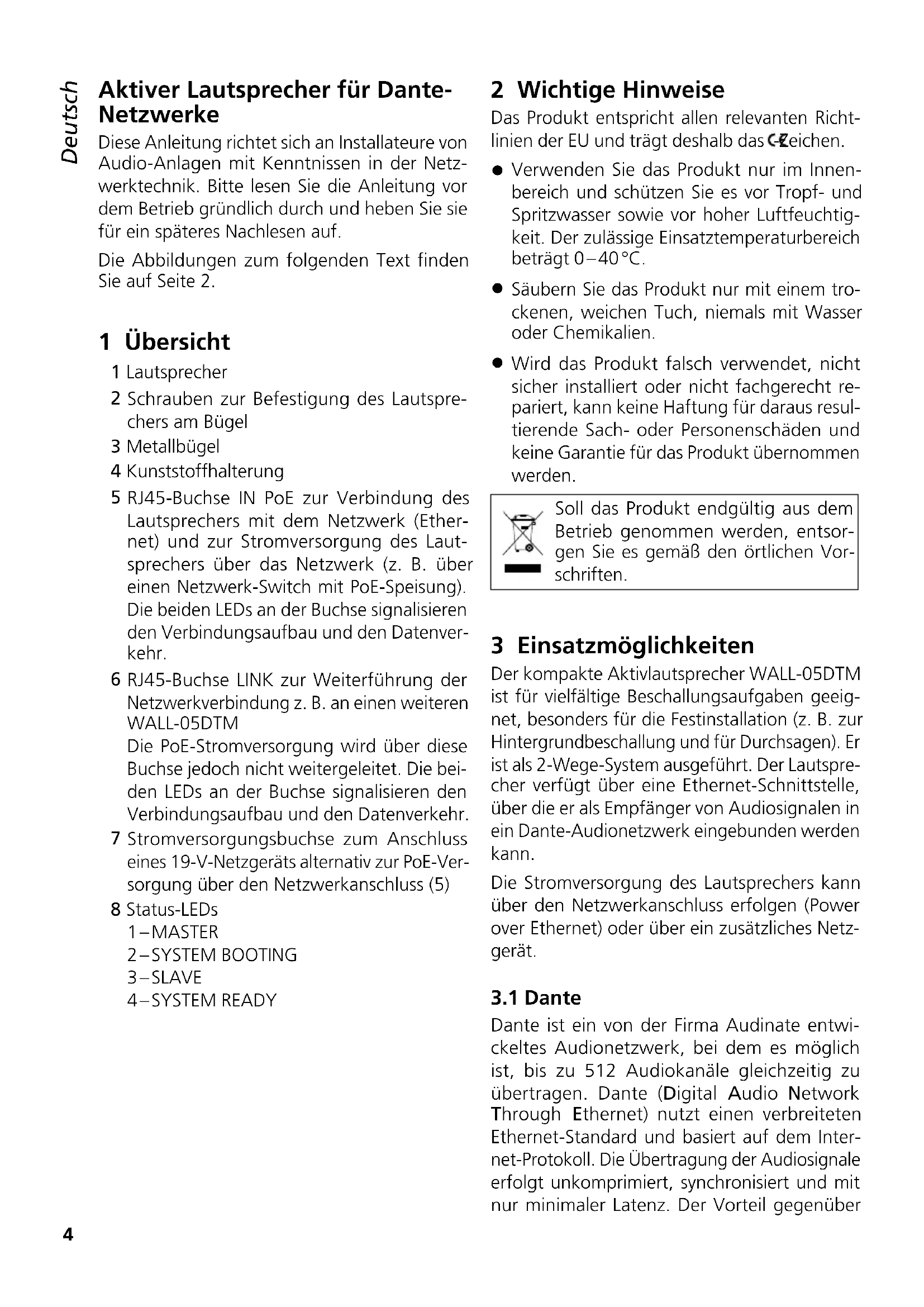 Wird das Produkt falsch verwendet, nicht sicher installiert oder nicht fachgerecht re- pariert, kann keine Haftung für daraus resul- tierende Sach- oder Personenschäden und keine Garantie für das Produkt übernommen werden. Soll das Produkt endgültig aus dem Betrieb genommen werden, entsor- gen Sie es gemäß den örtlichen Vor- schriften. 3 Einsatzmöglichkeiten Der kompakte Aktivlautsprecher WALL-05DTM ist für vielfältige Beschallungsaufgaben geeig- net, besonders für die Festinstallation (z. B. zur Hintergrundbeschallung und für Durchsagen). Er ist als 2-Wege-System ausgeführt. Der Lautspre- cher verfügt über eine Ethernet-Schnittstelle, über die er als Empfänger von Audiosignalen in ein Dante-Audionetzwerk eingebunden werden kann. Die Stromversorgung des Lautsprechers kann über den Netzwerkanschluss erfolgen (Power over Ethernet) oder über ein zusätzliches Netz- gerät.