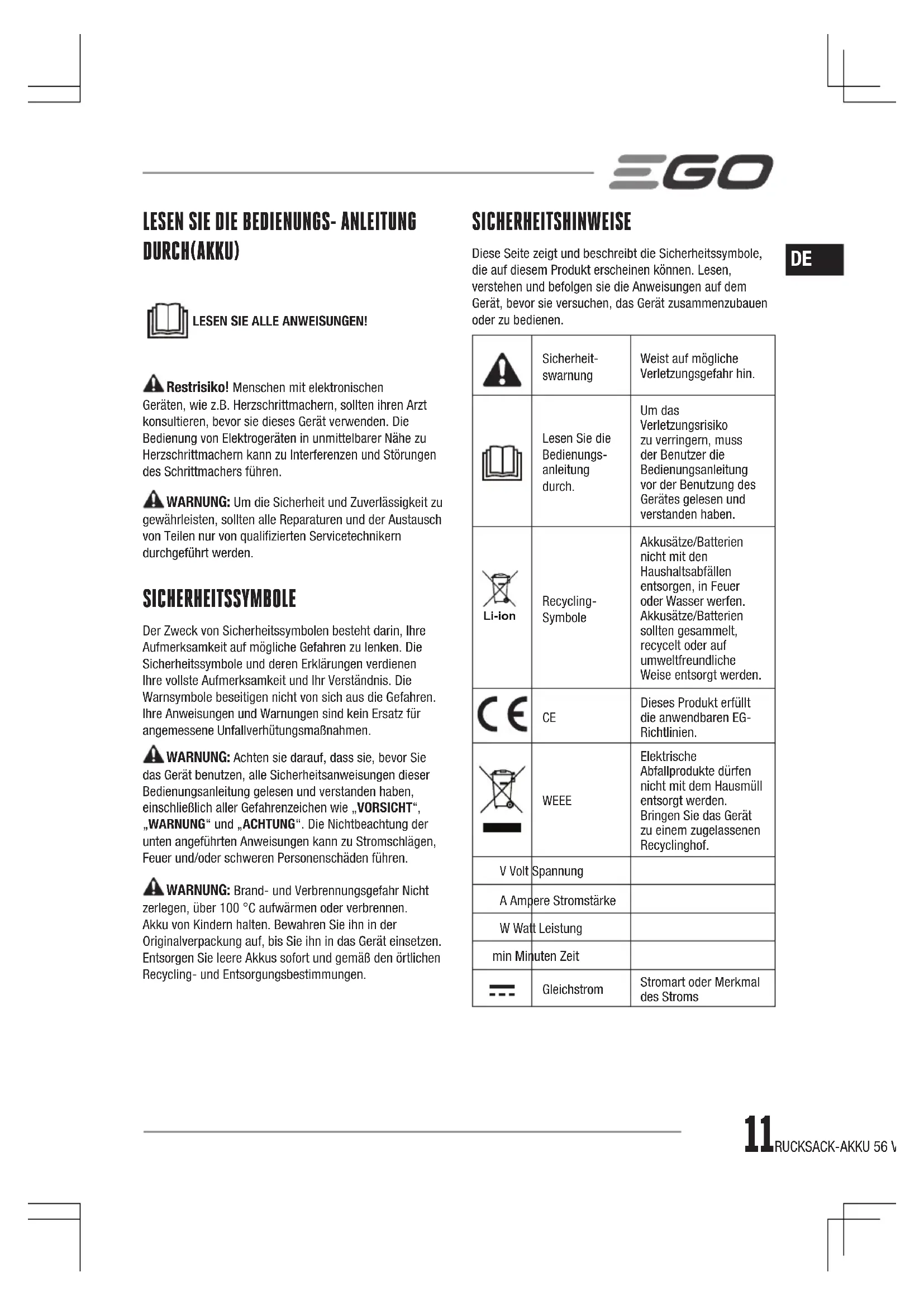 DURCH(AKKU) LESEN SIE ALLE ANWEISUNGEN! Restrisiko! Menschen mit elektronischen Geräten, wie z.B. Herzschrittmachern, sollten ihren Arzt konsultieren, bevor sie dieses Gerät verwenden. Die Bedienung von Elektrogeräten in unmittelbarer Nähe zu Herzschrittmachern kann zu Interferenzen und Störungen des Schrittmachers führen. WARNUNG: Um die Sicherheit und Zuverlässigkeit zu gewährleisten, sollten alle Reparaturen und der Austausch von Teilen nur von qualizierten Servicetechnikern durchgeführt werden. SICHERHEITSSYMBOLE Der Zweck von Sicherheitssymbolen besteht darin, Ihre Aufmerksamkeit auf mögliche Gefahren zu lenken. Die Sicherheitssymbole und deren Erklärungen verdienen Ihre vollste Aufmerksamkeit und Ihr Verständnis. Die Warnsymbole beseitigen nicht von sich aus die Gefahren. Ihre Anweisungen und Warnungen sind kein Ersatz für angemessene Unfallverhütungsmaßnahmen. WARNUNG: Achten sie darauf, dass sie, bevor Sie das Gerät benutzen, alle Sicherheitsanweisungen dieser Bedienungsanleitung gelesen und verstanden haben, einschließlich aller Gefahrenzeichen wie „VORSICHT“, „WARNUNG“ und „ACHTUNG“. Die Nichtbeachtung der unten angeführten Anweisungen kann zu Stromschlägen, Feuer und/oder schweren Personenschäden führen. WARNUNG: Brand- und Verbrennungsgefahr Nicht zerlegen, über 100 °C aufwärmen oder verbrennen. Akku von Kindern halten. Bewahren Sie ihn in der Originalverpackung auf, bis Sie ihn in das Gerät einsetzen. Entsorgen Sie leere Akkus sofort und gemäß den örtlichen Recycling- und Entsorgungsbestimmungen. SICHERHEITSHINWEISE Diese Seite zeigt und beschreibt die Sicherheitssymbole, die auf diesem Produkt erscheinen können. Lesen, verstehen und befolgen sie die Anweisungen auf dem Gerät, bevor sie versuchen, das Gerät zusammenzubauen oder zu bedienen. Sicherheit- swarnung Weist auf mögliche Verletzungsgefahr hin. Lesen Sie die Bedienungs- anleitung durch. Um das Verletzungsrisiko zu verringern, muss der Benutzer die Bedienungsanleitung vor der Benutzung des Gerätes gelesen und verstanden haben. Li-ion Recycling- Symbole Akkusätze/Batterien nicht mit den Haushaltsabfällen entsorgen, in Feuer oder Wasser werfen. Akkusätze/Batterien sollten gesammelt, recycelt oder auf umweltfreundliche Weise entsorgt werden.