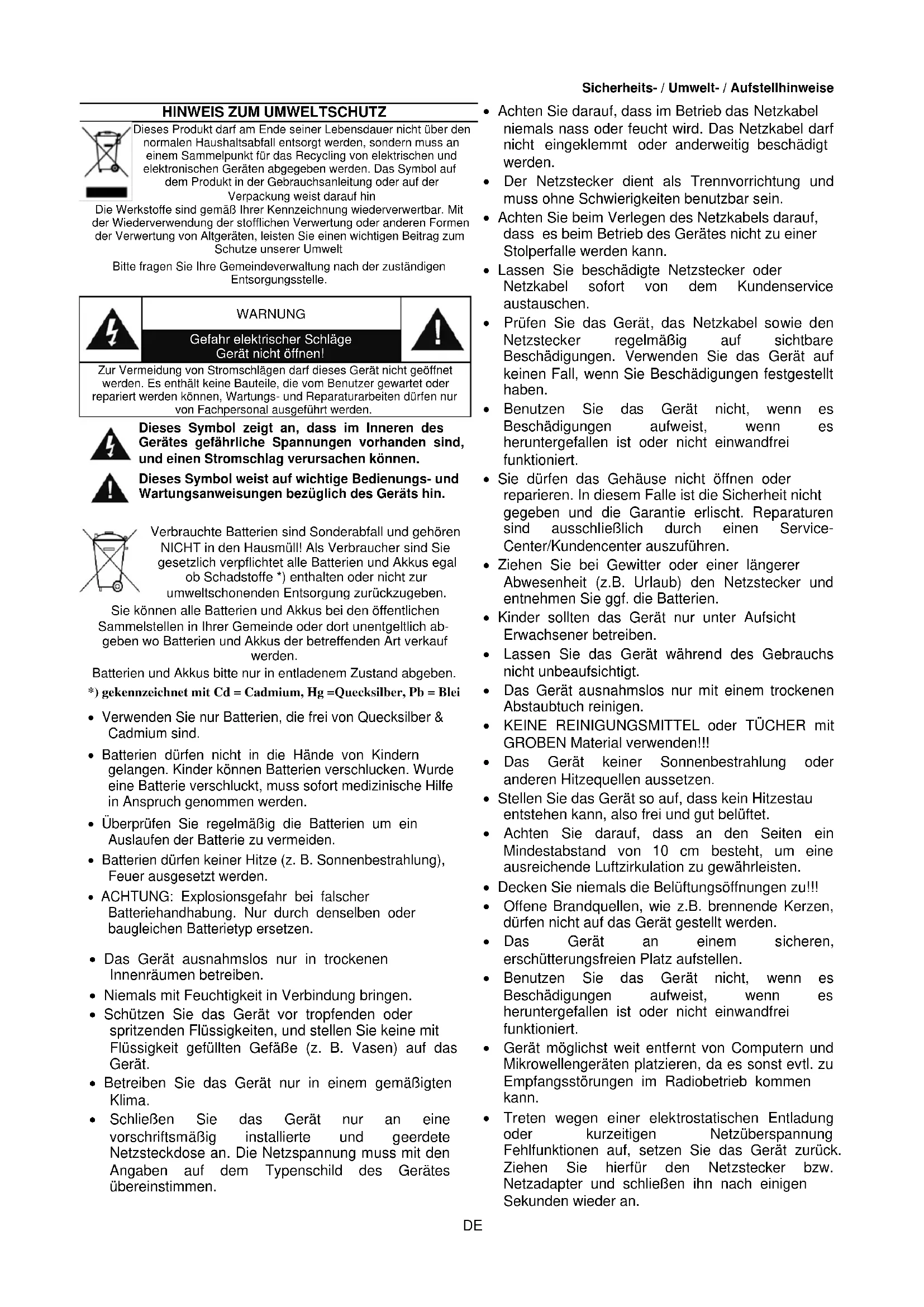- Ziehen Sie bei Gewitter oder einer längerer Abwesenheit (z.B. Urlaub) den Netzstecker und entnahmeu Sie ggf. die Batterien.