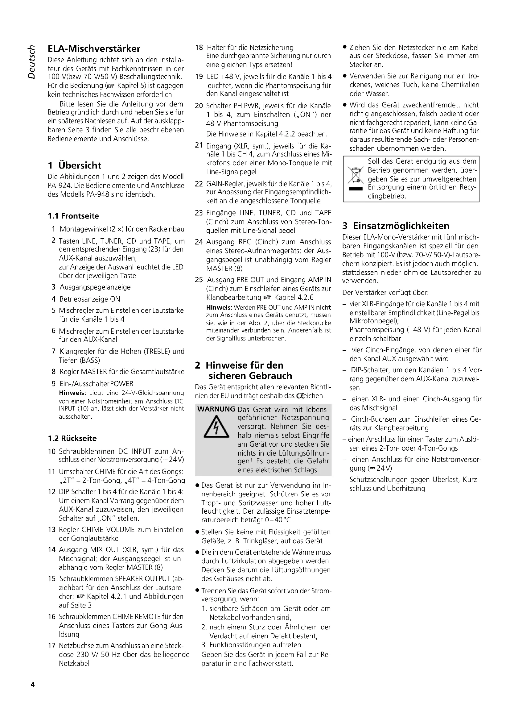 Kapitel 5) ist dagegen kein technisches Fachwissen erforderlich. Bitte lesen Sie die Anleitung vor dem Betrieb gründlich durch und heben Sie sie für ein späteres Nachlesen auf. Auf der ausklapp- baren Seite 3 finden Sie alle beschriebenen Bedienelemente und Anschlüsse. 1 Übersicht Die Abbildungen 1 und 2 zeigen das Modell PA-924. Die Bedienelemente und Anschlüsse des Modells PA-948 sind identisch.