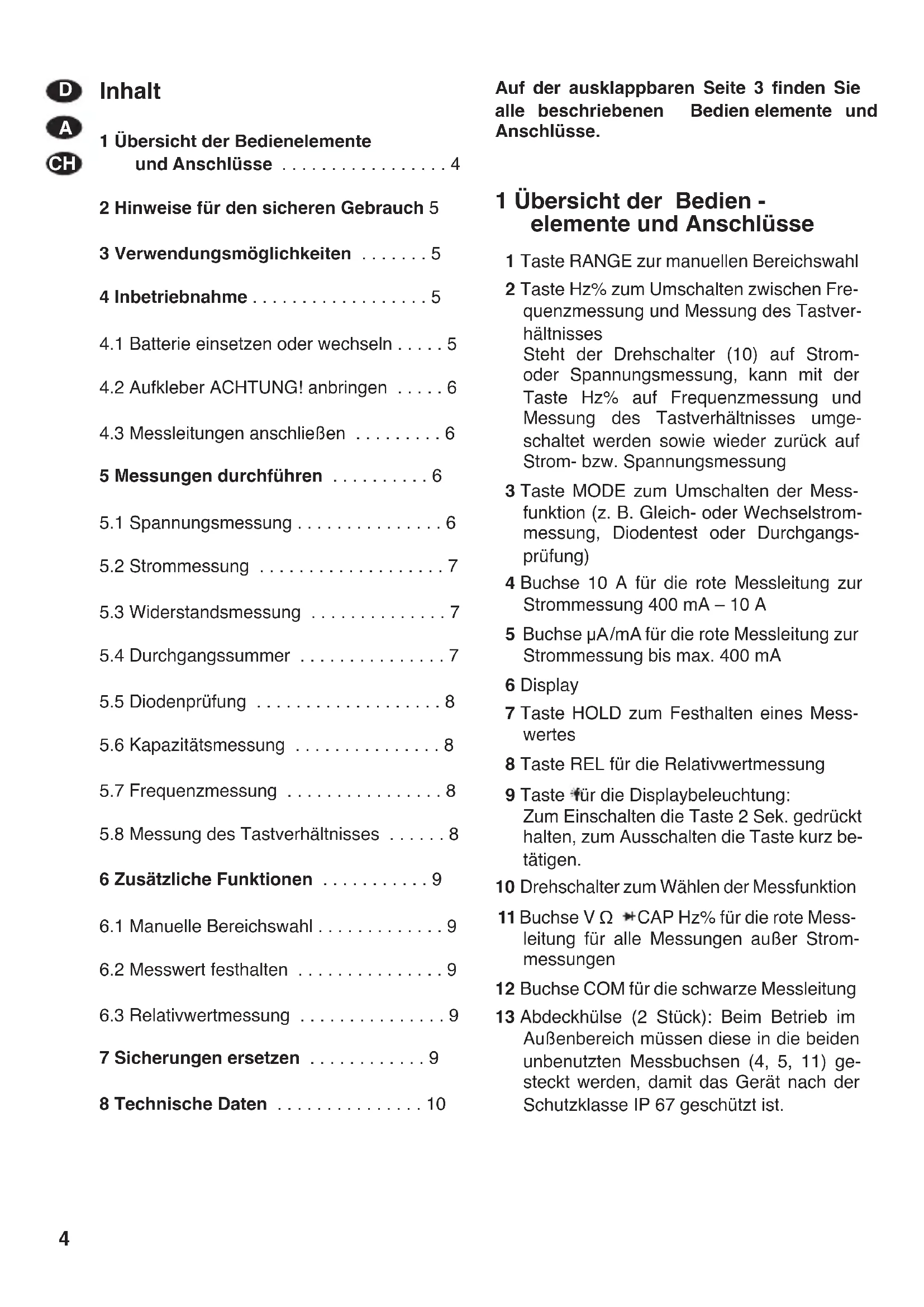 7 Sicherungen ersetzen . . . . . . . . . . . . 9 8 Technische Daten . . . . . . . . . . . . . . . 10 Auf der ausklappbaren Seite 3 finden Sie alle beschriebenen Bedien elemente und Anschlüsse. 1 Übersicht der Bedien - elemente und Anschlüsse 1 Taste RANGE zur manuellen Bereichswahl 2 Taste Hz% zum Umschalten zwischen Fre- quenzmessung und Messung des Tastver- hältnisses Steht der Drehschalter (10) auf Strom- oder Spannungsmessung, kann mit der Taste Hz% auf Frequenzmessung und Messung des Tastverhältnisses umge- schaltet werden sowie wieder zurück auf Strom- bzw. Spannungsmessung 3 Taste MODE zum Umschalten der Mess- funktion (z. B. Gleich- oder Wechselstrom- messung, Diodentest oder Durchgangs- prüfung) 4 Buchse 10 A für die rote Messleitung zur Strommessung 400 mA – 10 A 5 Buchse µA/mA für die rote Messleitung zur Strommessung bis max. 400 mA 6 Display 7 Taste HOLD zum Festhalten eines Mess- wertes 8 Taste REL für die Relativwertmessung 9 Taste für die Displaybeleuchtung: Zum Einschalten die Taste 2 Sek. gedrückt halten, zum Ausschalten die Taste kurz be- tätigen. 10 Drehschalter zum Wählen der Messfunktion 11 Buchse V Ω CAP Hz% für die rote Mess- leitung für alle Messungen außer Strom- messungen 12 Buchse COM für die schwarze Messleitung 13 Abdeckhülse (2 Stück): Beim Betrieb im Außenbereich müssen diese in die beiden unbenutzten Messbuchsen (4, 5, 11) ge- steckt werden, damit das Gerät nach der Schutzklasse IP 67 geschützt ist.