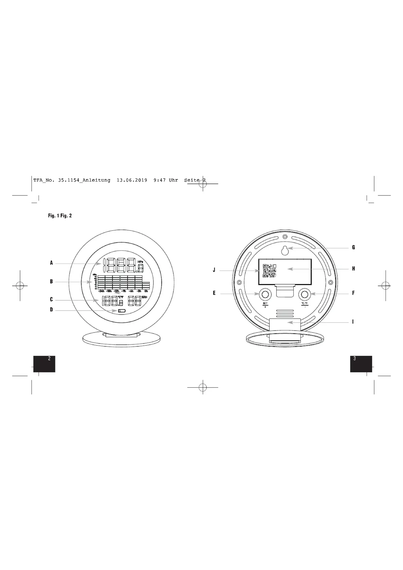 Display-Anzeige (Fig. 1) A: Luftdruck B: Luftdruckverlauf der letzten 24 Stunden C: Innentemperatur und Luftfeuchtigkeit D: Batteriesymbol Tasten (Fig. 2) E: SET/+ Taste F: °C/°F/– Taste Gehäuse (Fig. 2) G: Wandaufhängung H: Batteriefach I: Ständer J: QR Code zum Einscannen für WeatherHub App