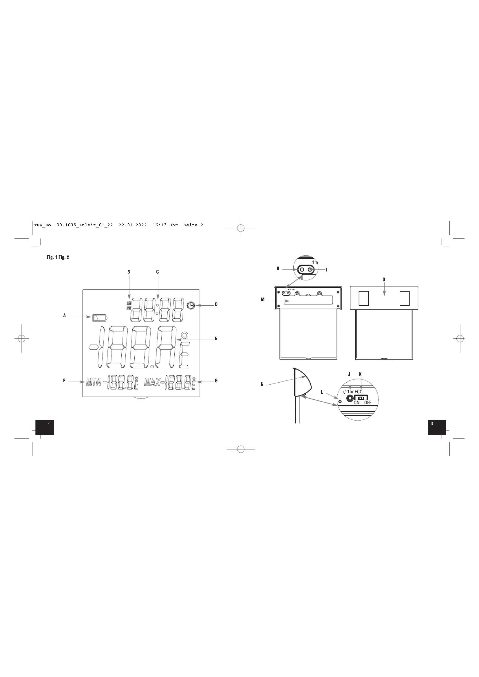 LCD-Anzeige (Fig. 1): A: Batteriesymbol für 1,2 V 800 mAh B: AM/PM bei 12-Stunden-System C: Anzeige Uhrzeit D: Symbol Sommerzeit (DST) E: Anzeige Temperatur F: Tiefsttemperatur G: Höchsttemperatur Tasten (Fig. 2): H: mode Taste I: +1 Taste J: +/-1hr Taste K: ECO Schalter Gehäuse (Fig. 2): L: Temperaturfühler M: Batteriefach (verschraubt) N: Solarpanel O: Halter
