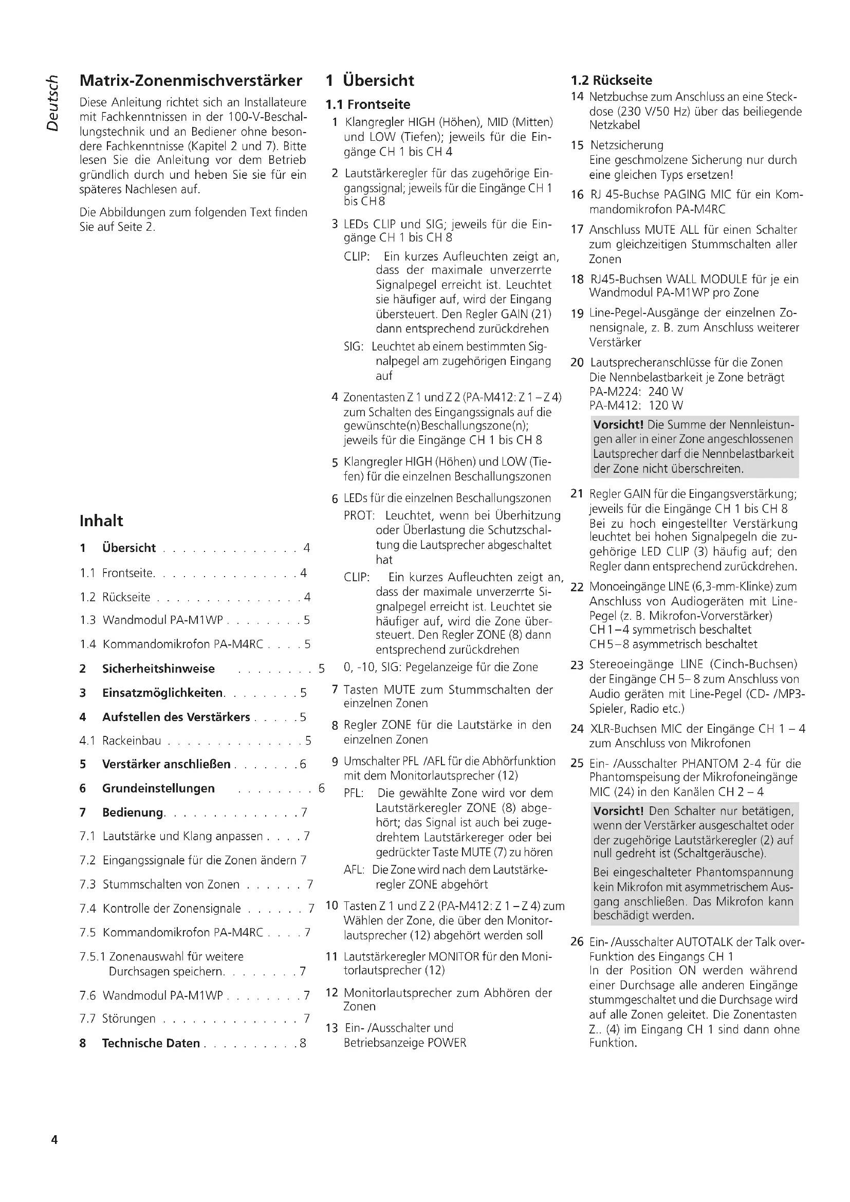 Deutsch ...........Seite 4 English ............Page 9 Français ...........Page 144 English English Page Contents Français Français Page Table des matières Italiano Italiano Pagina Indice Español Español Página Contenidos Nederlands Nederlands Pagina Inhoud Polski Polski Strona Spis treści Matrix-Zonenmischverstärker Diese Anleitung richtet sich an Installateure mit Fachkenntnissen in der 100-V-Beschal- lungstechnik und an Bediener ohne beson- dere Fachkenntnisse (Kapitel 2 und 7). Bitte lesen Sie die Anleitung vor dem Betrieb gründlich durch und heben Sie sie für ein späteres Nachlesen auf. Die Abbildungen zum folgenden Text finden Sie auf Seite 2. 1 Übersicht