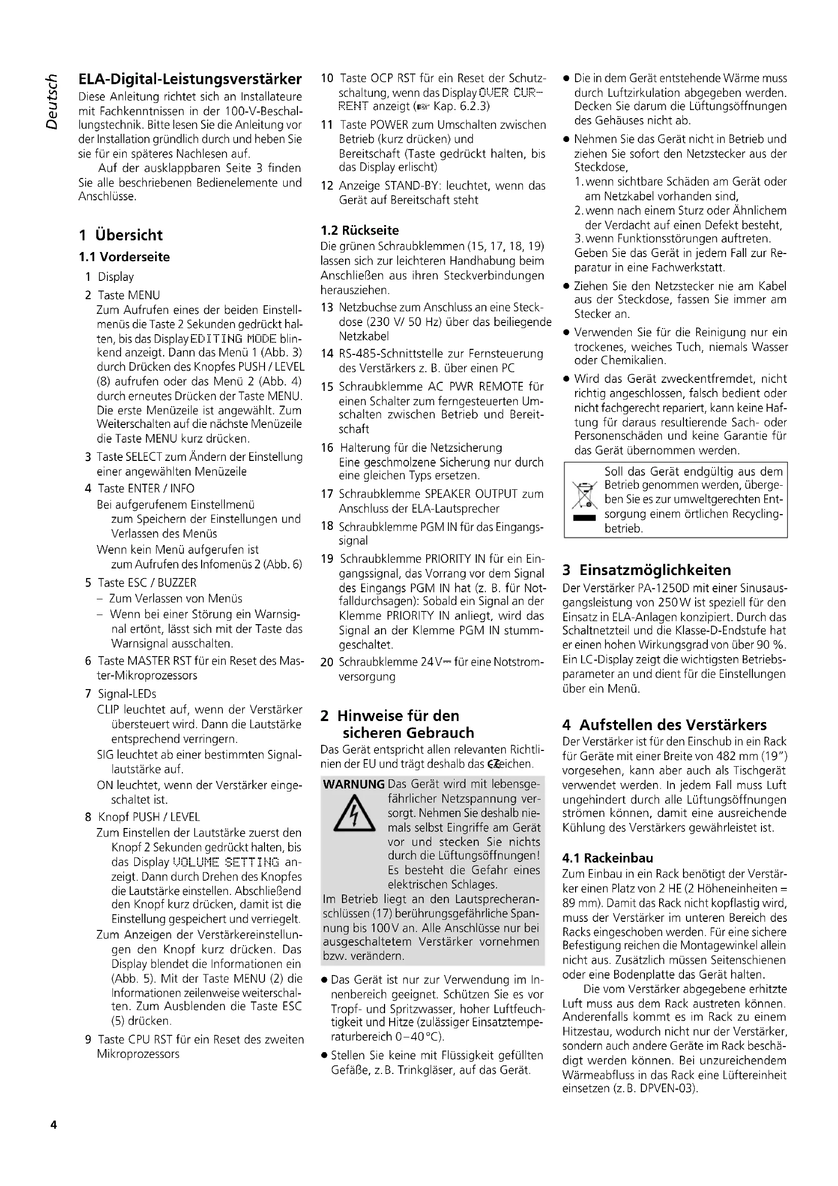 Infomenü 2, Taste ENTER / INFO (4) drücken Info menu 2, press button ENTER / INFO (4) Menu info 2, appuyez sur la touche ENTER / INFO (4) Menù info 2, premere il tasto ENTER / INFO (4) Menú info 2, pulse el botón ENTER / INFO (4) Menu informacyjne 2, wcisnąć przycisk ENTER / INFO (4)4 Deutsch EnglishEnglish PageFrançaisFrançais PageItalianoItaliano PaginaEspañolEspañol PáginaNederlandsNederlands PaginaPolskiPolski Strona ELA-Digital-Leistungsverstärker Diese Anleitung richtet sich an Installateure mit Fachkenntnissen in der 100-V-Beschal- lungstechnik. Bitte lesen Sie die Anleitung vor der Installation gründlich durch und heben Sie sie für ein späteres Nachlesen auf. Auf der ausklappbaren Seite 3 finden Sie alle beschriebenen Bedienelemente und Anschlüsse. 1 Übersicht