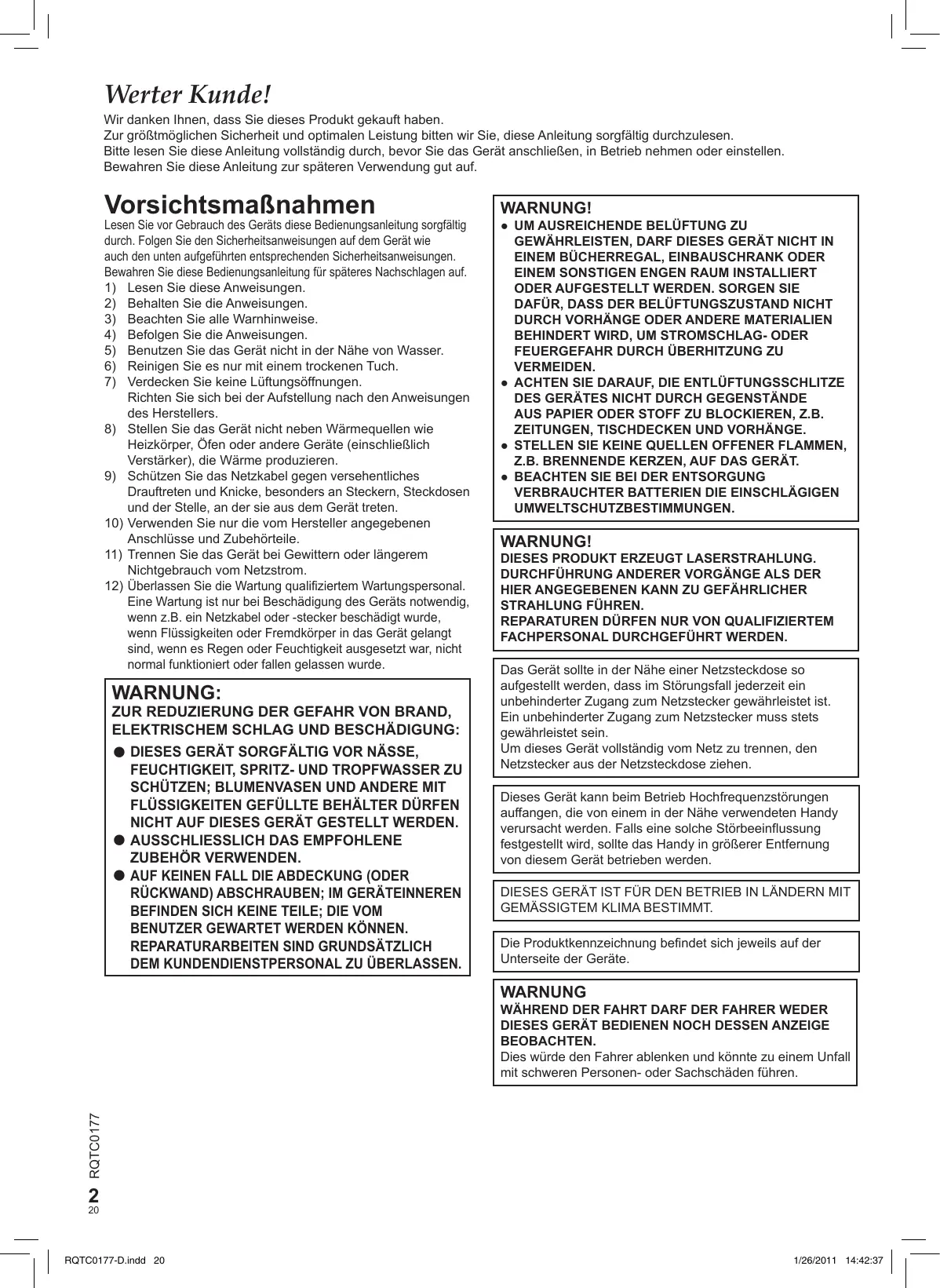 RQTC0177-D.indd 19 1/26/2011 14:17:22 Werter Kunde! Wir danken Ihnen, dass Sie dieses Produkt gekauft haben. Zur größtmöglichen Sicherheit und optimalen Leistung bitten wir Sie, diese Anleitung sorgfältig durchzulesen. Bitte lesen Sie diese Anleitung vollständig durch, bevor Sie das Gerät anschließen, in Betrieb nehmen oder einstellen. Bewahren Sie diese Anleitung zur späteren Verwendung gut auf. Vorsichtsmaßnahmen Lesen Sie vor Gebrauch des Geräts diese Bedienungsanleitung sorgfältig durch. Folgen Sie den Sicherheitsanweisungen auf dem Gerät wie auch den unten aufgeführten entsprechenden Sicherheitsanweisungen. Bewahren Sie diese Bedienungsanleitung für späteres Nachschlagen auf.