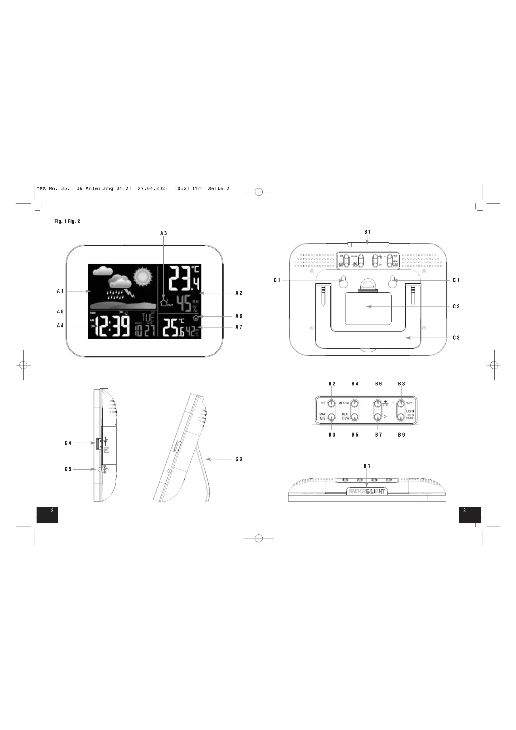 A4: Uhrzeit, Wochentag und Datum A5: Alarmsymbol A6: Symbol für Innen A7: Innentemperatur und –luftfeuchtigkeit Tasten (Fig. 2) B1: SNOOZE/LIGHT Taste B2: SET Taste B3: MAX/MIN Taste B4: ALARM Taste B5: HEAT/DEW Taste B6: +/RCC Taste B7: CH Taste B8: -/°C/°F Taste B9: LIGHT HOLD ON/OFF Taste Gehäuse (Fig. 1+2) C1: Wandaufhängungen C2: Batteriefach C3: Ständer (ausklappbar) C4: USB Ausgang C5: Netzteilanschluss
