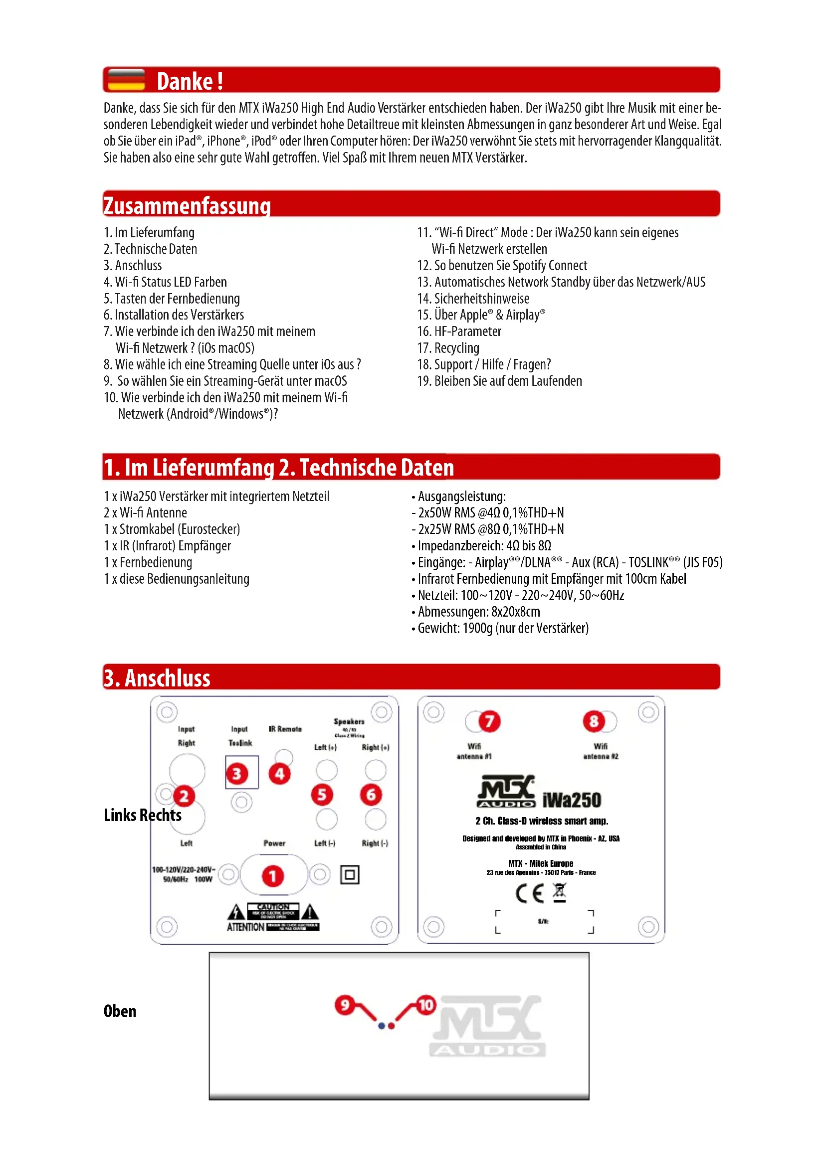 Links Rechts Danke ! Zusammenfassung Danke, dass Sie sich für den MTX iWa250 High End Audio Verstärker entschieden haben. Der iWa250 gibt Ihre Musik mit einer be- sonderen Lebendigkeit wieder und verbindet hohe Detailtreue mit kleinsten Abmessungen in ganz besonderer Art und Weise. Egal ob Sie über ein iPad®, iPhone®, iPod® oder Ihren Computer hören: Der iWa250 verwöhnt Sie stets mit hervorragender Klangqualität. Sie haben also eine sehr gute Wahl getroffen. Viel Spaß mit Ihrem neuen MTX Verstärker.