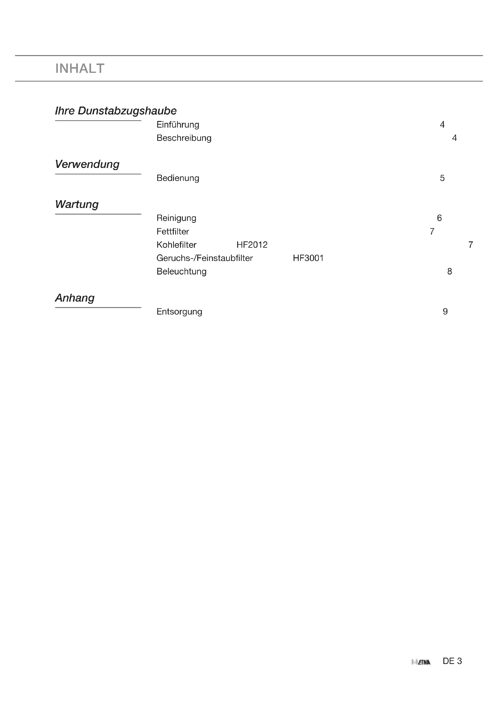 - CFK-freiem Polystyrol (PS-Hartschaum). Diese Werkstoffe sind ordnungsgemäß und gemäß den behördlichen Vorschriften zu entsorgen. Um Sie daran zu erinnern, dass Elektrohaushaltsgeräte getrennt entsorgt werden müssen, ist das Produkt mit dem Symbol einer durchgestrichen Mülltonne gekennzeichnet. Das Produkt darf am Ende seiner Nutzzeit nicht zusammen mit dem Hausabfall beseitigt werden. Es kann zu einer von den städtischen Behörden eingerichteten Sammelstelle oder zu einem Fachhändler gebracht werden, der einen Rücknahmeservice anbietet. Durch die getrennte Entsorgung eines Haushaltsgeräts werden mögliche negative Auswirkungen auf die Umwelt und die menschliche Gesundheit vermieden, die durch eine nicht vorschriftsmäßige Entsorgung entstehen können. Zudem können die Materialien, aus denen das Gerät besteht, wiederverwertet werden, sodass Energie und Ressourcen gespartwerden. Konformitätserklärung Wir erklären hiermit, dass unsere Produkte die einschlägigen europäischen Richtlinien, Anweisungen und Gesetze sowie die darin genannten Standards erfüllen.DE 10EN 3 CONTENT Your cooker hood Introduction 4 Description 4 Use Operation 5 Maintenance Cleaning 6 Grease filters 7 Carbon filter HF2012 7 Odour/fine particle filter HF3001 8 Lighting 8 Appendix Disposal 9EN 4 Introduction On reading these user manuals you will soon become familiar with the features of this appliance. Please read the appliance’s safety and maintenance instructions.Please retain the operating and installation instructions as these may be useful for future reference. Read the separate safety instructions before using the device! You can find the most recent version of the instructions for use on our website. Description ETNA symbols in mm 1:1