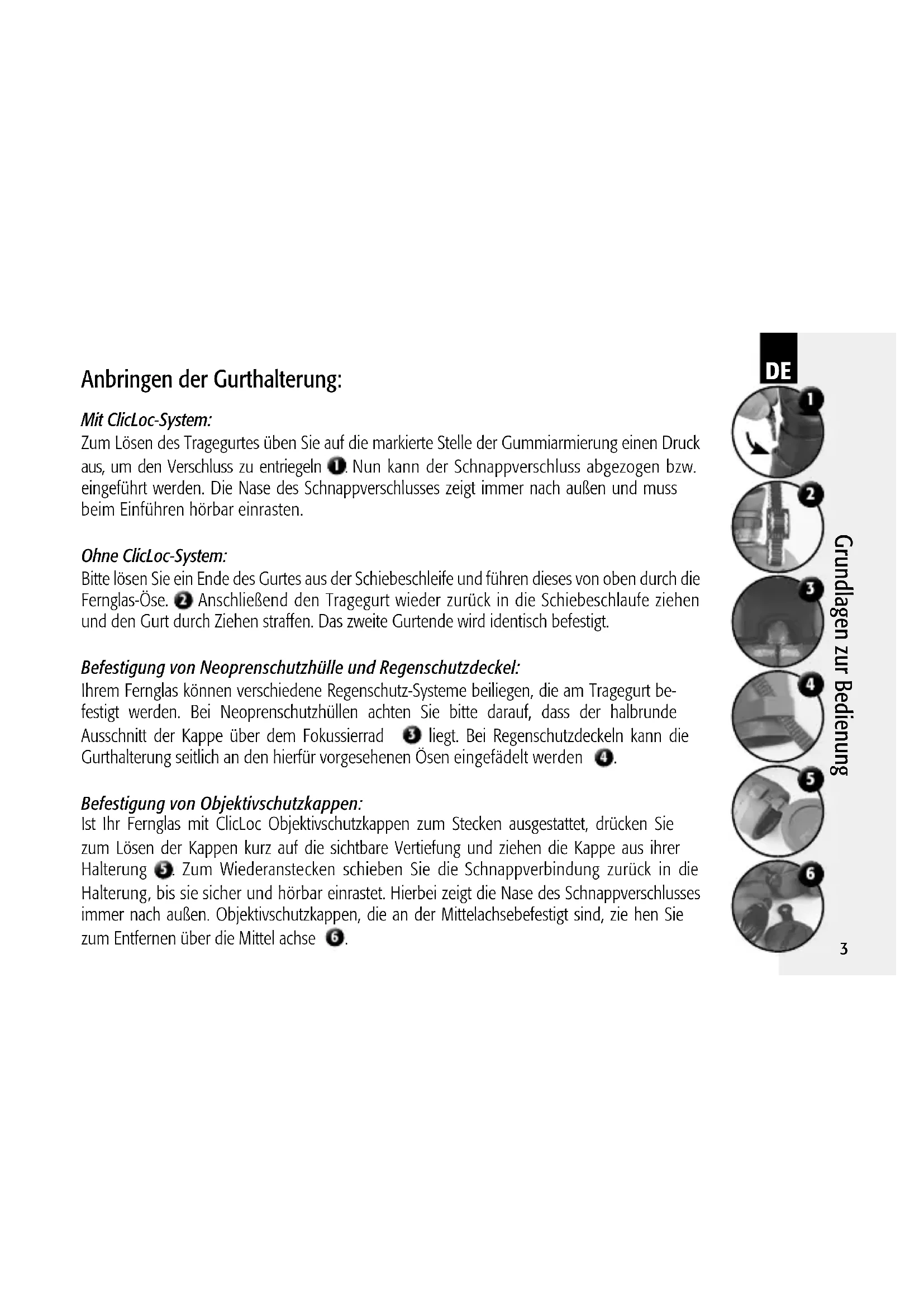 Anschließend den Tragegurt wieder zurück in die Schiebeschlaufe ziehen und den Gurt durch Ziehen straffen. Das zweite Gurtende wird identisch befestigt. Befestigung von Neoprenschutzhülle und Regenschutzdeckel: Ihrem Fernglas können verschiedene Regenschutz-Systeme beiliegen, die am Tragegurt be- festigt werden. Bei Neoprenschutzhüllen achten Sie bitte darauf, dass der halbrunde Ausschnitt der Kappe über dem Fokussierrad