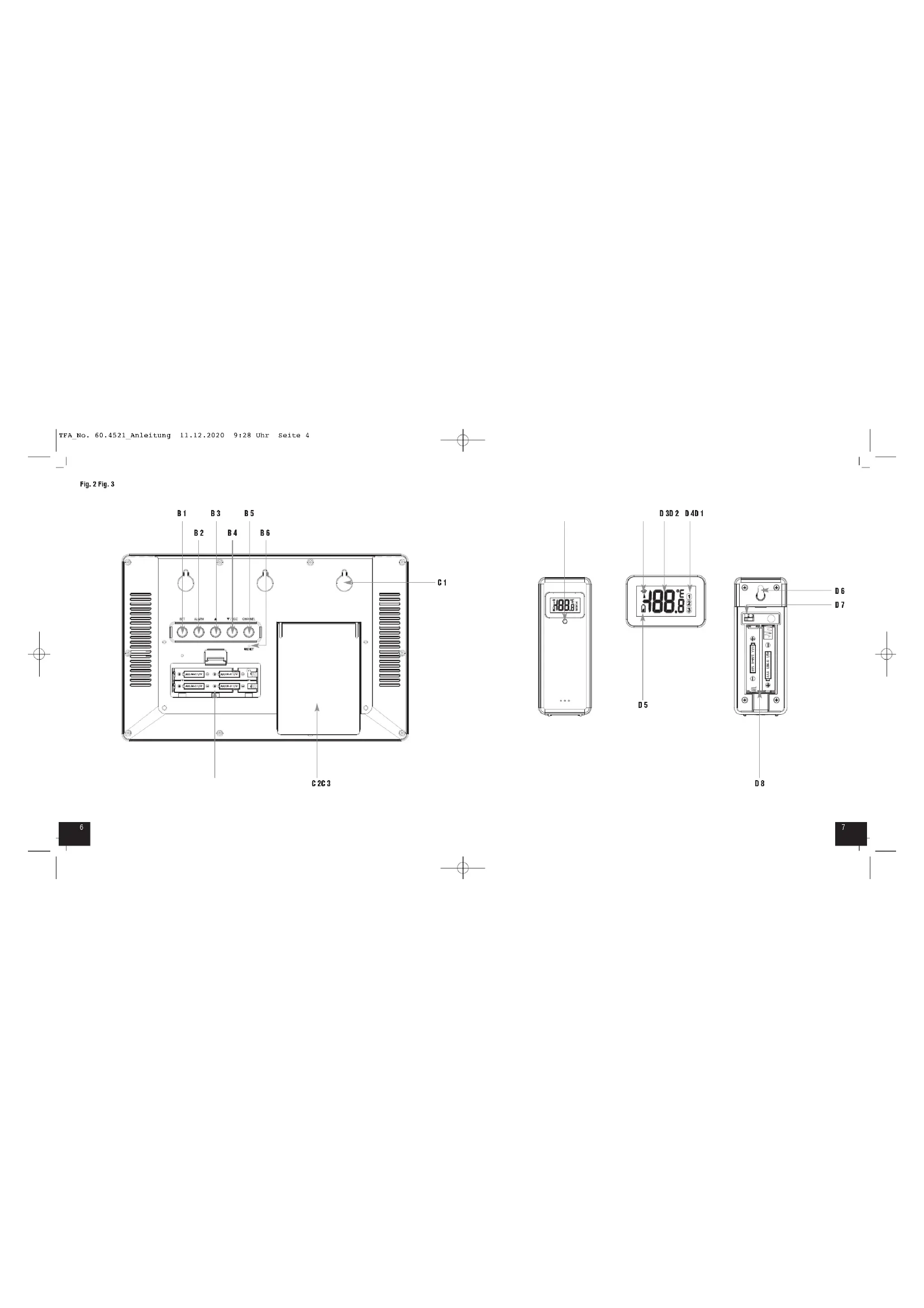Instrucciones de uso Fig. 1 A 5 A 6 A 1 A 3A 2 A 4 A 13 A 11A 12 A 7A 8A 9A 10 TFA_No. 60.4521_Anleitung 11.12.2020 9:28 Uhr Seite 376 Fig. 2 Fig. 3 C 1 B 1 B 2 B 3 B 4 B 5 B 6 C 2C 3 D 6 D 7 D 3D 2 D 5 D 4D 1 D 8 TFA_No. 60.4521_Anleitung 11.12.2020 9:28 Uhr Seite 498 Funkuhr mit Außen- und Innentemperatur
