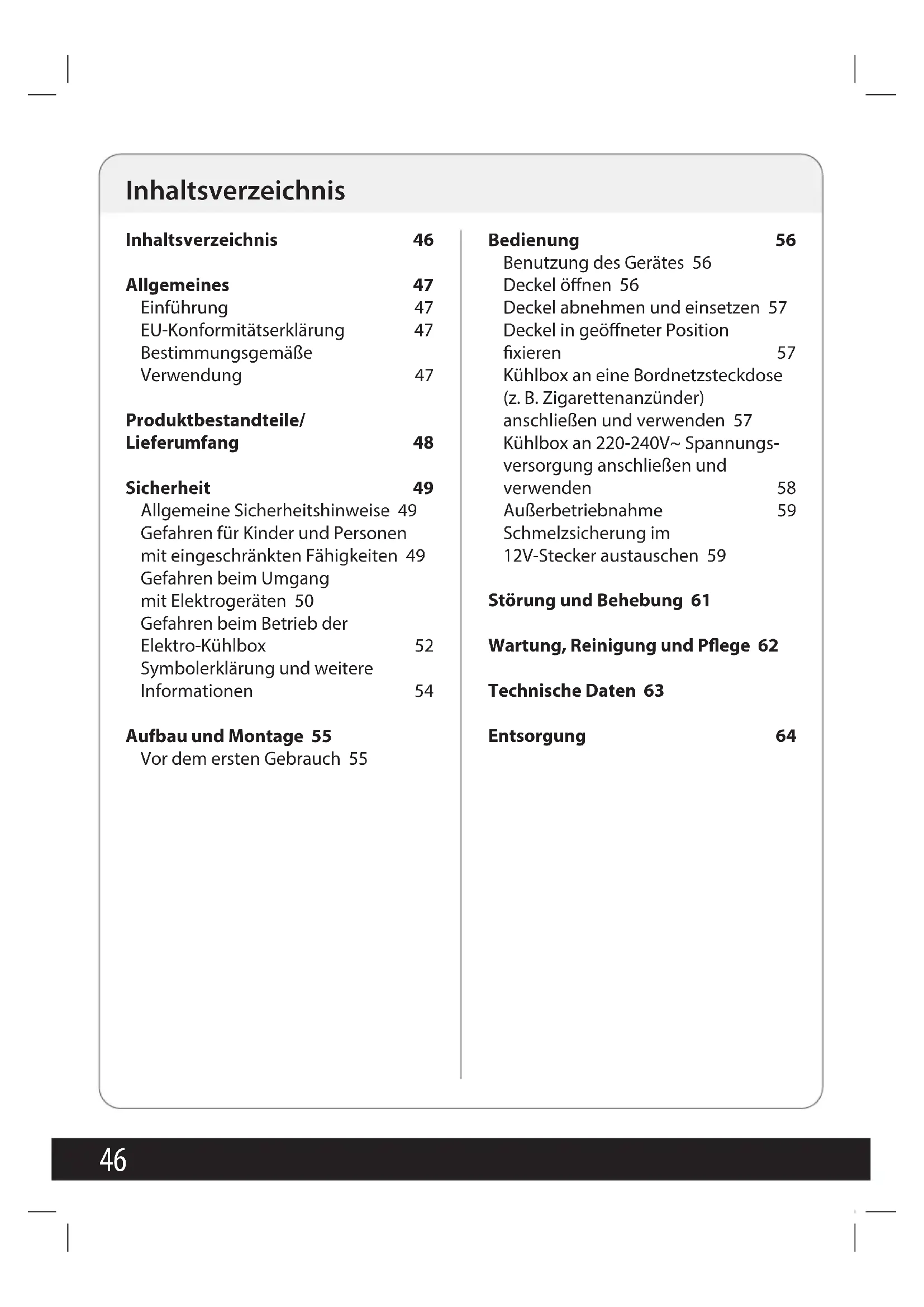 Inhaltsverzeichnis 46 Allgemeines 47 Einführung 47 EU-Konformitätserklärung 47 Bestimmungsgemäße Verwendung 47 Produktbestandteile/ Lieferumfang 48 Sicherheit 49 Allgemeine Sicherheitshinweise 49 Gefahren für Kinder und Personen mit eingeschränkten Fähigkeiten 49 Gefahren beim Umgang mit Elektrogeräten 50 Gefahren beim Betrieb der Elektro-Kühlbox 52 Symbolerklärung und weitere Informationen 54 Aufbau und Montage 55 Vor dem ersten Gebrauch 55 Bedienung 56 Benutzung des Gerätes 56 Deckel önen 56 Deckel abnehmen und einsetzen 57 Deckel in geöneter Position xieren 57 Kühlbox an eine Bordnetzsteckdose (z. B. Zigarettenanzünder) anschließen und verwenden 57 Kühlbox an 220-240V~ Spannungs- versorgung anschließen und verwenden 58 Außerbetriebnahme 59 Schmelzsicherung im 12V-Stecker austauschen 59 Störung und Behebung 61 Wartung, Reinigung und Pege 62 Technische Daten 63 Entsorgung 64 Inhaltsverzeichnis47