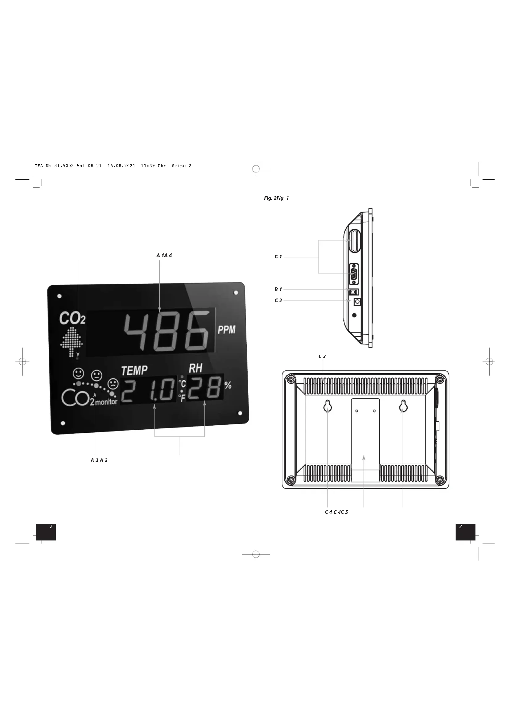 A 1: CO2 Anzeige A 2: Smiley-LED A 3: Anzeige der Raumtemperatur und Luftfeuchtigkeit A 4: Dimmer-Sensor B: Tasten (Fig. 2)