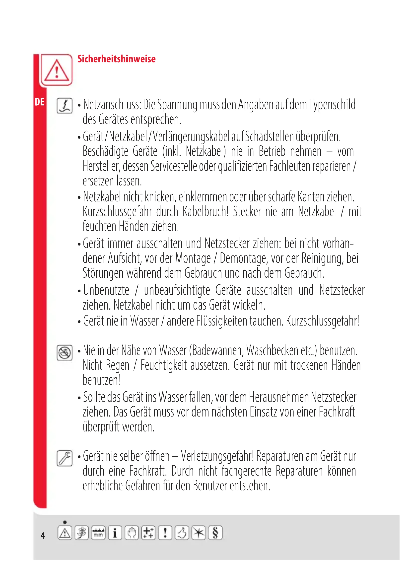 - Gerät stehend auf trockener, ebener, stabiler und hitzebeständiger Unterlage betreiben. Gerät vor dem Verstauen abkühlen lassen.6 Sicherheitshinweise
