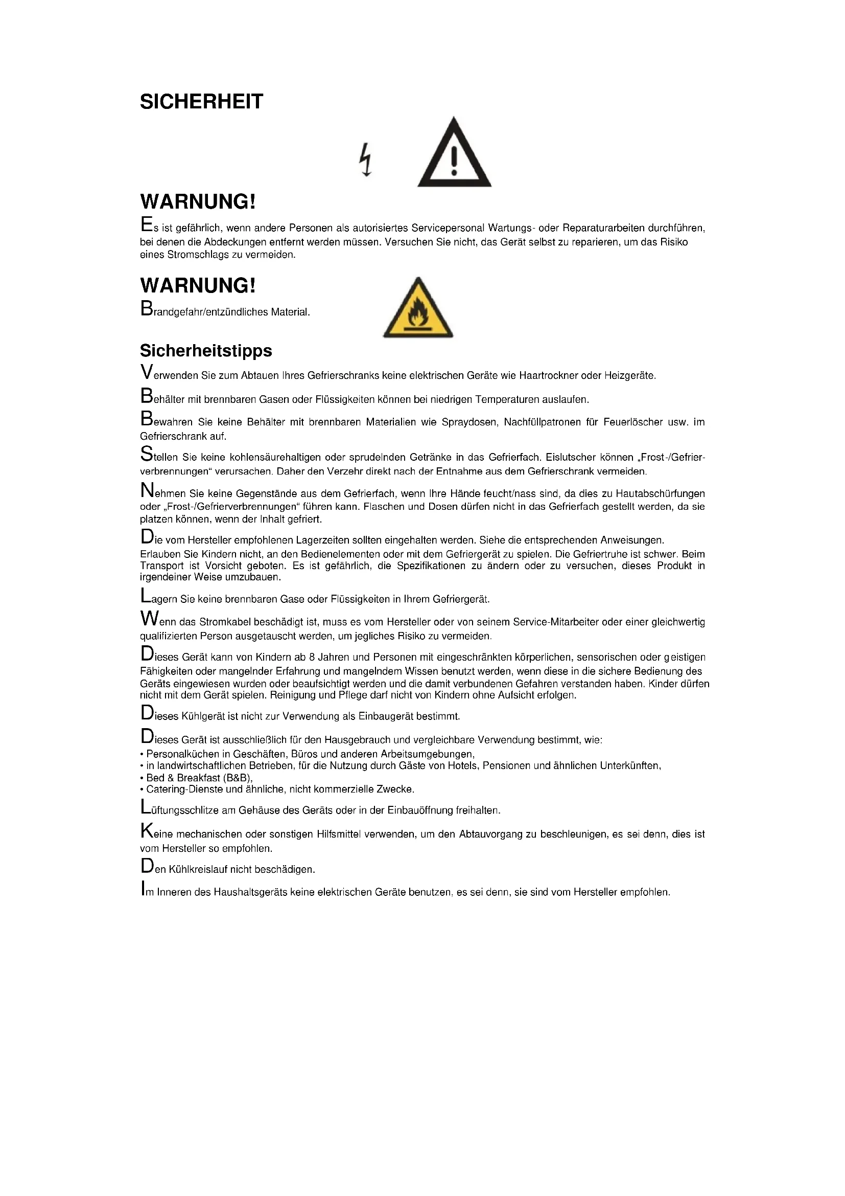 Gebot - Tiefgefrorene Lebensmittel vollständig im Kühlschrank oder entsprechend der Anweisungen in einer Mikrowelle auftauen. Gebot - Sicherstellen, dass die Klappe der Tiefkühltruhe nach jeder Entnahme fest verschlossen ist. Gebot - Gefrorenes Fleisch vor der Zubereitung vollständig auftauen lassen. Gebot - Die Klappe vorsichtig schließen. Gebot - Inhalt der Kühltruhe in regelmäßigen Abständen überprüfen.Gebot - Gefrierschrank regelmäßig abtauen und reinigen (siehe „Abtauen“). Gebot - Lebensmittel so kurzfristig wie möglich aufbewahren und das Verfallsdatum beachten. Gebot - Kommerzielle Tiefkühlware entsprechend der Verpackungsangabe lagern. Gebot - Nur qualitativ hochwertige und gründlich gereinigte frische Lebensmittel einfrieren. Gebot - Frische Lebensmittel in kleinen Portionen einfrieren. Gebot - Lebensmittel in Aluminiumfolie oder Gefrierbeuteln einfrieren und dabei möglichst keine Luft einschließen. Gebot - Gefrorene Lebensmittel beim Kauf einpacken und so schnell wie möglich in den Gefrierschrank legen. Gebot - Kleine Gegenstände im mitgelieferten Korb aufbewahren. Gebot - Speiseeis 10-20 Minuten vor dem Servieren aus der Tiefkühltruhe nehmen. Verbot - Klappe nicht über lange Zeit offenlassen, da dies den Betrieb des Gefriergeräts verteuert und zu übermäßiger Eisbildung führt. Verbot - Keine scharfkantigen Gegenstände wie Messer oder Gabeln verwenden, um Eisschichten damit zu entfernen. Verbot - Keine heißen Lebensmittel in das Gefriergerät stellen. Diese zuerst abkühlen lassen. Verbot - Keine Flaschen oder Dosen mit kohlensäurehaltigen Getränken im Gefriergerät lagern, da diese platzen können. Verbot - Keine giftigen oder gefährlichen Substanzen im Gefriergerät lagern. Ihr Gefriergerät ist ausschließlich für die Lagerung von Lebensmitteln bestimmt. Verbot - Speiseeis oder Eiswürfel nicht direkt aus der Kühltruhe verzehren. Die niedrige Temperatur kann zu „Gefrierverbrennungen“ auf den Lippen führen. Verbot - Keine kohlensäurehaltigen Getränke einfrieren. Verbot - Keine aufgetaute Tiefkühlware aufbewahren. Diese sollte innerhalb von 24 Stunden verzehrt oder gekocht und dann wieder eingefroren werden. Verbot - Keine Gegenstände mit nassen Händen aus der Kühltruhe nehmen. Verbot - Die Klappe nicht mit Gewalt schließen. Dies beschädigt das Gerät.