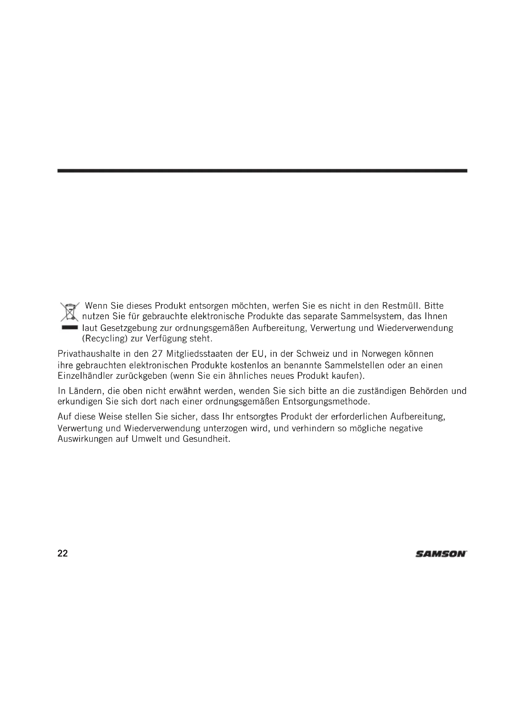 DE60x22 Wenn Sie dieses Produkt entsorgen möchten, werfen Sie es nicht in den Restmüll. Bitte nutzen Sie für gebrauchte elektronische Produkte das separate Sammelsystem, das Ihnen laut Gesetzgebung zur ordnungsgemäßen Aufbereitung, Verwertung und Wiederverwendung (Recycling) zur Verfügung steht. Privathaushalte in den 27 Mitgliedsstaaten der EU, in der Schweiz und in Norwegen können ihre gebrauchten elektronischen Produkte kostenlos an benannte Sammelstellen oder an einen Einzelhändler zurückgeben (wenn Sie ein ähnliches neues Produkt kaufen). In Ländern, die oben nicht erwähnt werden, wenden Sie sich bitte an die zuständigen Behörden und erkundigen Sie sich dort nach einer ordnungsgemäßen Entsorgungsmethode. Auf diese Weise stellen Sie sicher, dass Ihr entsorgtes Produkt der erforderlichen Aufbereitung, Verwertung und Wiederverwendung unterzogen wird, und verhindern so mögliche negative Auswirkungen auf Umwelt und Gesundheit.23DE10x/DE50x/DE60 x-Kopfbügelmikrofon ENFRDEESIT Herzlichen Glückwunsch zum Kauf Ihres Samson DEx-Kopfbügelmikrofons. Das DE 10x und das DE50x bieten dank ihres omnidirektionalen Aufnahmemusters einen linearen außeraxialen Frequenzgang. Das Ergebnis ist ein klarer und deutlicher Klang, der sich perfekt für Rundfunk, Gottesdienste, Vorträge, Theateraufführungen und Fitnessanwendungen eignet. Das DE60x bietet durch sein unidirektionales Aufnahmemuster eine hervorragende Isolierung und somit mehr Kontrolle und größere Rückkopplungssicherheit sowie klaren und deutlichen Ton für Live- Anwendungen. Im Lieferumfang der DEx-Kopfbügelmikrofone sind vier abnehmbare Adapterkabel enthalten: Durch die Adapter für 1/8” [3,5-mm-Klinkenstecker], Hirose® 4-Pin, Switchcraft® TA3F, Switchcraft® TA4F sind sie mit den drahtlosen Systemen von Samson sowie den meisten anderen gängigen drahtlosen Sendern kompatibel. Im Lieferumfang enthalten sind vier Windschütze, ein Kleiderclip und eine Tragetasche. Die Mikrofone der DEx-Serie verfügen über einen vergoldeten Stecker, eine feuchtigkeitsbeständige Beschichtung und ein Edelstahlgitter. Sie sindstaub-, wasser- und schweißbeständig bis IP65. Ein Tropfschutzring schützt die Kapsel zusätzlich vor Feuchtigkeit und sorgt für zuverlässige Leistung. Wenn Sie Fragen oder Anmerkungen zum DEx-Kopfbügelmikrofon oder anderen Produkten von Samson haben, kontaktieren Sie uns unter support@samsontech.com. Einführung24 Die Größe des Kopfbügels kann durch Verschieben der Ohrbügel angepasst werden, sodass er optimal sitzt. Wenn der Kopfbügel zu locker ist und verrutscht, können Sie die Ohrbügel nach hinten schieben, um den Kopfbügel enger zu stellen. Sie können das Mikrofon verschieben, indem Sie den linken Ohrbügel festhalten und den Mikrofonarm nach vorn oder hinten schieben. Für optimale Ergebnisse sollte sich das Mikrofon nahe an der Haut etwa 1–1,5cm vom Mundwinkel entfernt befinden und auf diesen ausgerichtet sein. Schieben Sie den Tropfschutzring so dicht wie möglich an die Kapsel. Verwenden Sie beim Einsatz im Freien und für weniger P-Pops einen der mitgelieferten Windschütze. Anpassung des DE10x/50x/60x-Mikrofons25DE10x/DE50x/DE60 x-Kopfbügelmikrofon ENFRDEESIT Adapterkabel Im Lieferumfang der DE10x/DE50x/DE60x-Mikrofone sind vier Kabel mit Adaptern für die gängigsten drahtlosen Bodypack-Sender enthalten. Klinkenstecker 3,5mm Kompatibel mit drahtlosen Systemen von Sennheiser