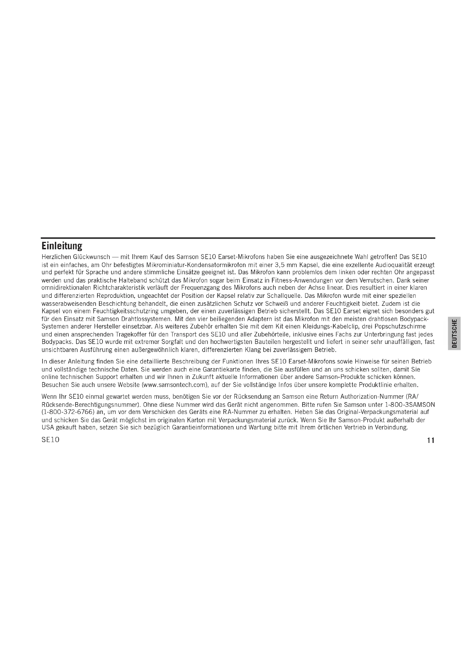 DEUTSCHE Einleitung Herzlichen Glückwunsch — mit Ihrem Kauf des Samson SE10 Earset-Mikrofons haben Sie eine ausgezeichnete Wahl getroffen! Das SE10 ist ein einfaches, am Ohr befestigtes Mikrominiatur-Kondensatormikrofon mit einer 3,5 mm Kapsel, die eine exzellente Audioqualität erzeugt und perfekt für Sprache und andere stimmliche Einsätze geeignet ist. Das Mikrofon kann problemlos dem linken oder rechten Ohr angepasst werden und das praktische Halteband schützt das Mikrofon sogar beim Einsatz in Fitness-Anwendungen vor dem Verrutschen. Dank seiner omnidirektionalen Richtcharakteristik verläuft der Frequenzgang des Mikrofons auch neben der Achse linear. Dies resultiert in einer klaren und differenzierten Reproduktion, ungeachtet der Position der Kapsel relativ zur Schallquelle. Das Mikrofon wurde mit einer speziellen wasserabweisenden Beschichtung behandelt, die einen zusätzlichen Schutz vor Schweiß und anderer Feuchtigkeit bietet. Zudem ist die Kapsel von einem Feuchtigkeitsschutzring umgeben, der einen zuverlässigen Betrieb sicherstellt. Das SE10 Earset eignet sich besonders gut für den Einsatz mit Samson Drahtlossystemen. Mit den vier beiliegenden Adaptern ist das Mikrofon mit den meisten drahtlosen Bodypack- Systemen anderer Hersteller einsetzbar. Als weiteres Zubehör erhalten Sie mit dem Kit einen Kleidungs-Kabelclip, drei Popschutzschirme und einen ansprechenden Tragekoffer für den Transport des SE10 und aller Zubehörteile, inklusive eines Fachs zur Unterbringung fast jedes Bodypacks. Das SE10 wurde mit extremer Sorgfalt und den hochwertigsten Bauteilen hergestellt und liefert in seiner sehr unauffälligen, fast unsichtbaren Ausführung einen außergewöhnlich klaren, differenzierten Klang bei zuverlässigem Betrieb. In dieser Anleitung finden Sie eine detaillierte Beschreibung der Funktionen Ihres SE10 Earset-Mikrofons sowie Hinweise für seinen Betrieb und vollständige technische Daten. Sie werden auch eine Garantiekarte finden, die Sie ausfüllen und an uns schicken sollten, damit Sie online technischen Support erhalten und wir Ihnen in Zukunft aktuelle Informationen über andere Samson-Produkte schicken können. Besuchen Sie auch unsere Website (www.samsontech.com), auf der Sie vollständige Infos über unsere komplette Produktlinie erhalten. Wenn Ihr SE10 einmal gewartet werden muss, benötigen Sie vor der Rücksendung an Samson eine Return Authorization-Nummer (RA/ Rücksende- Berechtigungs nummer). Ohne diese Nummer wird das Gerät nicht angenommen. Bitte rufen Sie Samson unter 1-800-3SAMSON (1-800-372-6766) an, um vor dem Verschicken des Geräts eine RA-Nummer zu erhalten. Heben Sie das Original-Verpackungsmaterial auf und schicken Sie das Gerät möglichst im originalen Karton mit Verpackungsmaterial zurück. Wenn Sie Ihr Samson-Produkt außerhalb der USA gekauft haben, setzen Sie sich bezüglich Garantieinformationen und Wartung bitte mit Ihrem örtlichen Vertrieb in Verbindung.12 SE10 Features Das omnidirektionale, am Ohr getragene SE10 Mikrofon bietet eine exzellente Stimmenreproduktion in einer fast unsichtbaren, unauffälligen Ausführung. Die wichtigsten SE10 Features: