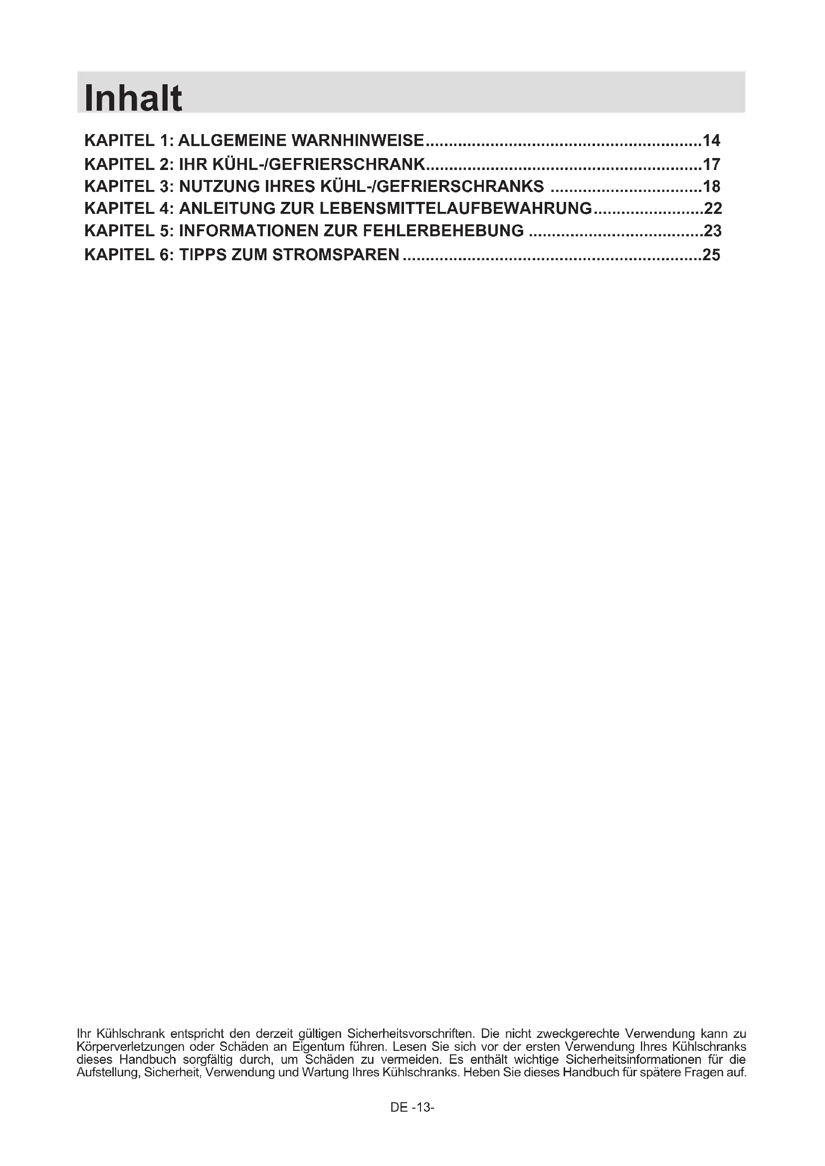 Ihr Kühlschrank entspricht den derzeit gültigen Sicherheitsvorschriften. Die nicht zweckgerechte Verwendung kann zu Körperverletzungen oder Schäden an Eigentum führen. Lesen Sie sich vor der ersten Verwendung Ihres Kühlschranks dieses Handbuch sorgfältig durch, um Schäden zu vermeiden. Es enthält wichtige Sicherheitsinformationen für die Aufstellung, Sicherheit, Verwendung und Wartung Ihres Kühlschranks. Heben Sie dieses Handbuch für spätere Fragen auf.DE -14-