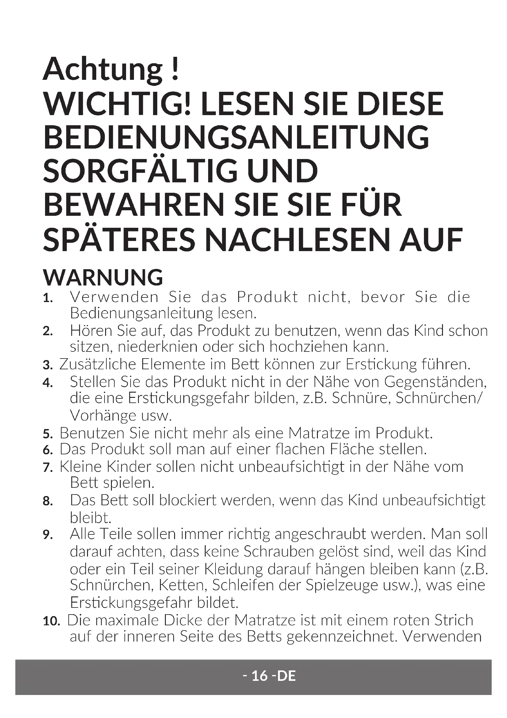 - Das Bett soll blockiert werden, wenn das Kind unbeaufsichtigt bleibt.