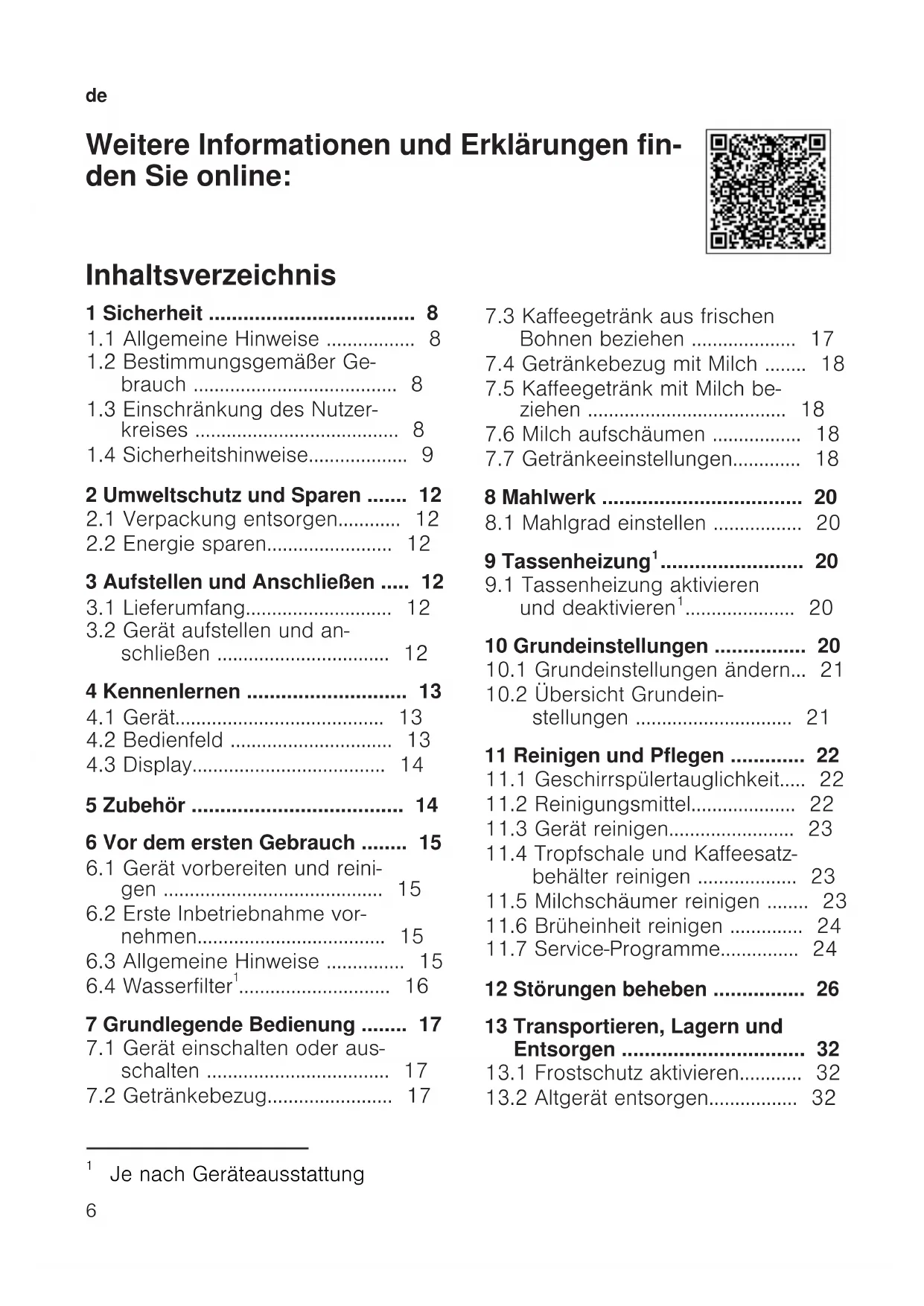 ▶ Den Hautkontakt mit austretenden Flüssigkeiten und Dämpfen vermeiden. WARNUNG‒Verletzungsgefahr! Eine Fehlanwendung des Geräts kann den Benutzer gefährden. ▶ Um Verletzungen zu vermeiden, das Gerät nur bestimmungsge- mäß verwenden. Einklemmen der Finger beim Schließen der Gerätetür. ▶ Beim Schließen der Gerätetür auf die Finger achten. Das Mahlwerk rotiert. ▶ Nie in das Mahlwerk fassen. WARNUNG‒Gefahr durch Magnetismus! Das Gerät enthält Permanentmagnete. Diese können elektroni- sche Implantate, z.B. Herzschrittmacher oder Insulinpumpen be- einflussen. ▶ Personen mit elektronischen Implantaten müssen 10 cm Min- destabstand zum Gerät einhalten. ▶ Den Mindestabstand von 10 cm auch zum entnommenen Was- sertank einhalten. WARNUNG‒Gefahr von Gesundheitsschäden! Verschmutzungen am Gerät können die Gesundheit gefährden. ▶ Die Reinigungshinweise zur Hygiene zum Gerät beachten.de Umweltschutz und Sparen